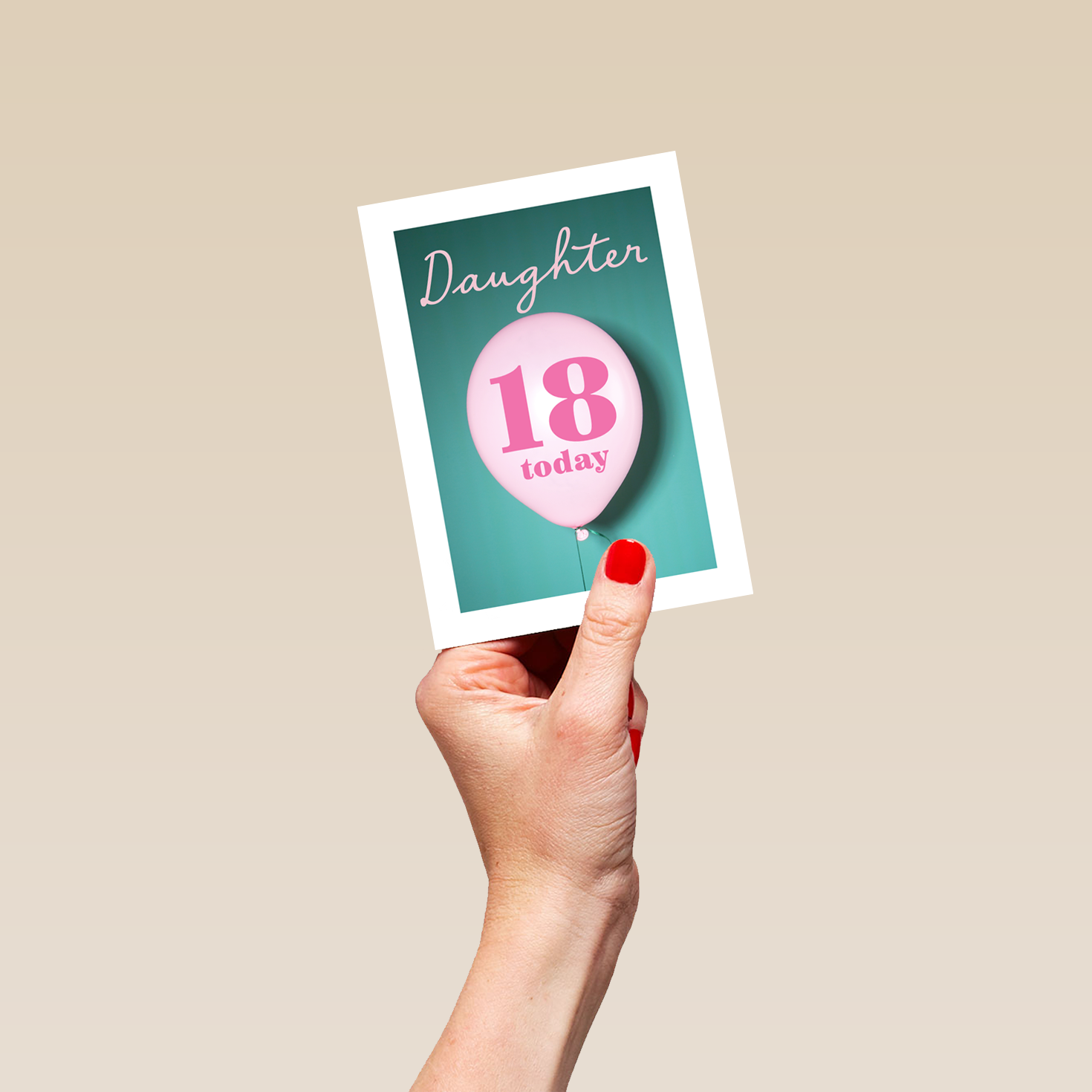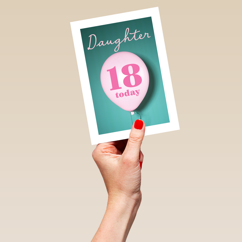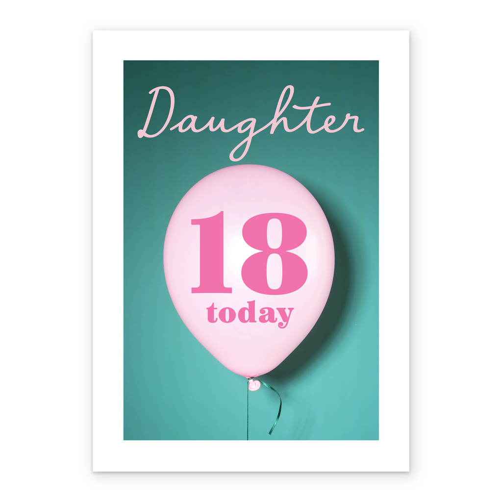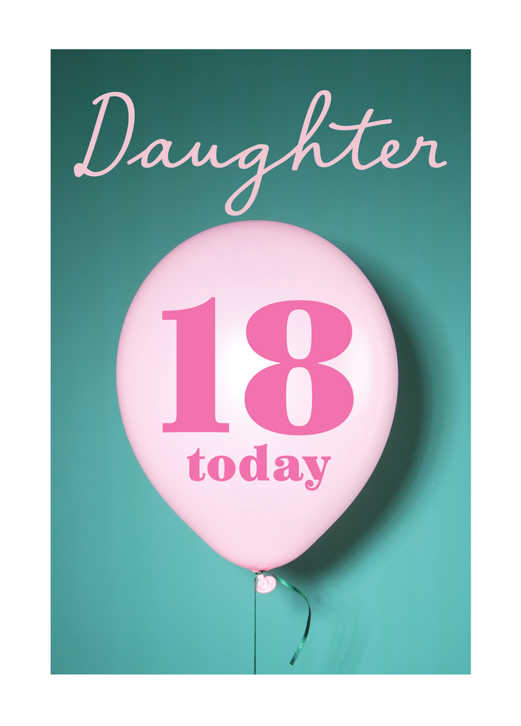 Printed on premium-quality board, this card features a floating 18th birthday balloon on a colourful background, with the message 'Daughter, 18 Today', space to personalise a name, and comes complete with a co-ordinating white envelope.