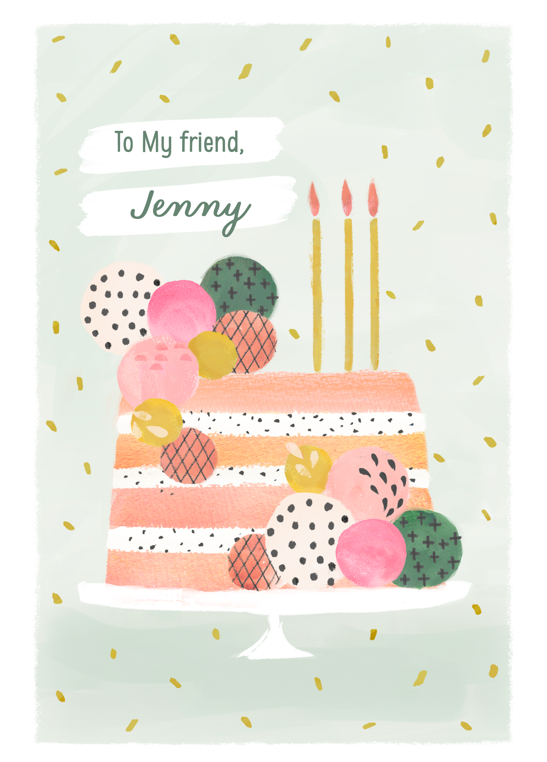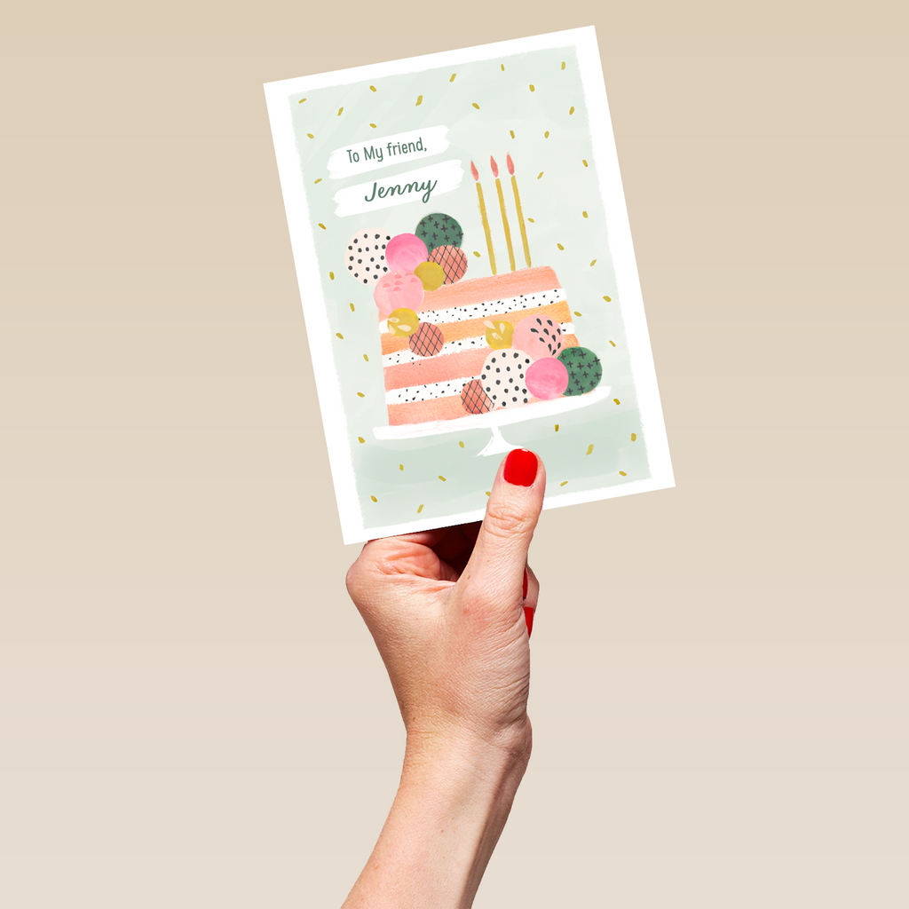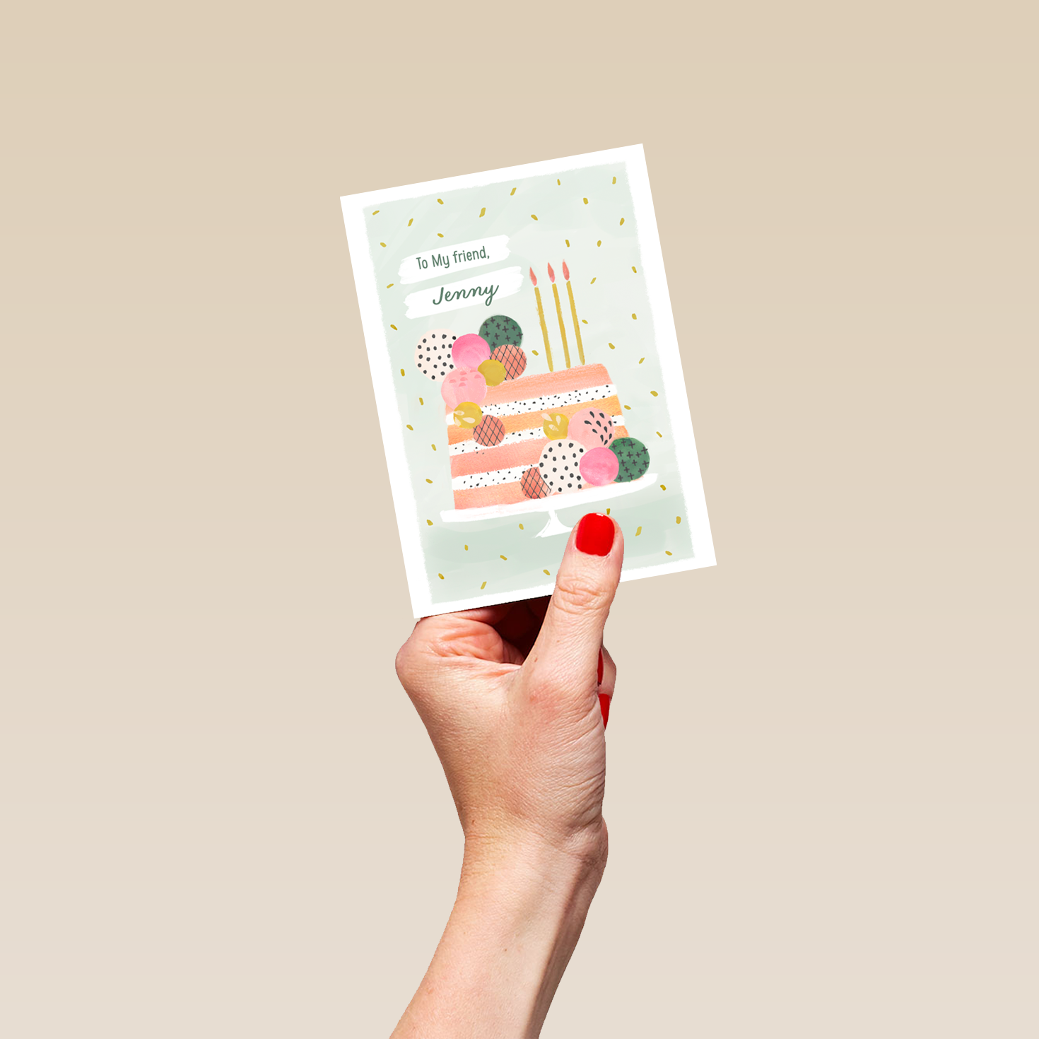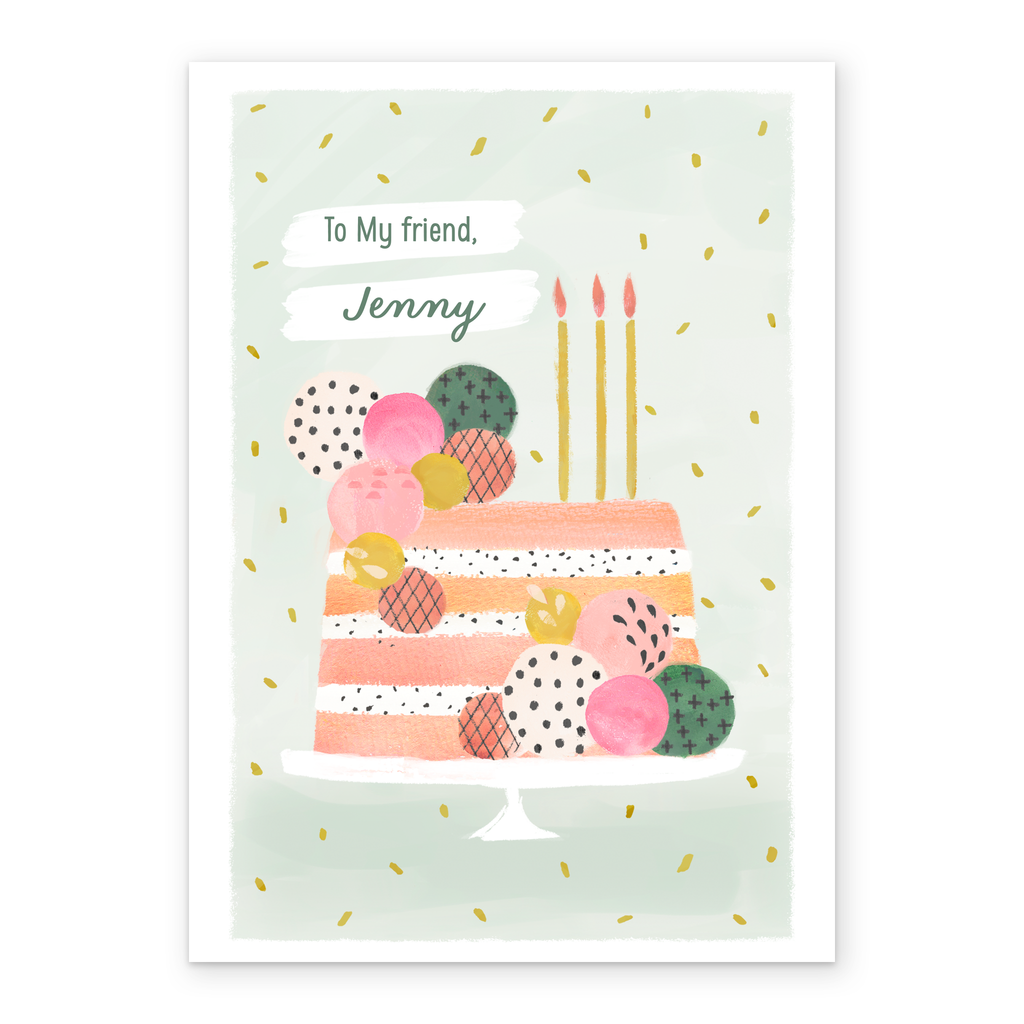 Printed on premium-quality board, this card features a watercolour styled pink birthday cake, with the message 'To My Friend', space to personalise a name, and comes complete with a co-ordinating white envelope.
