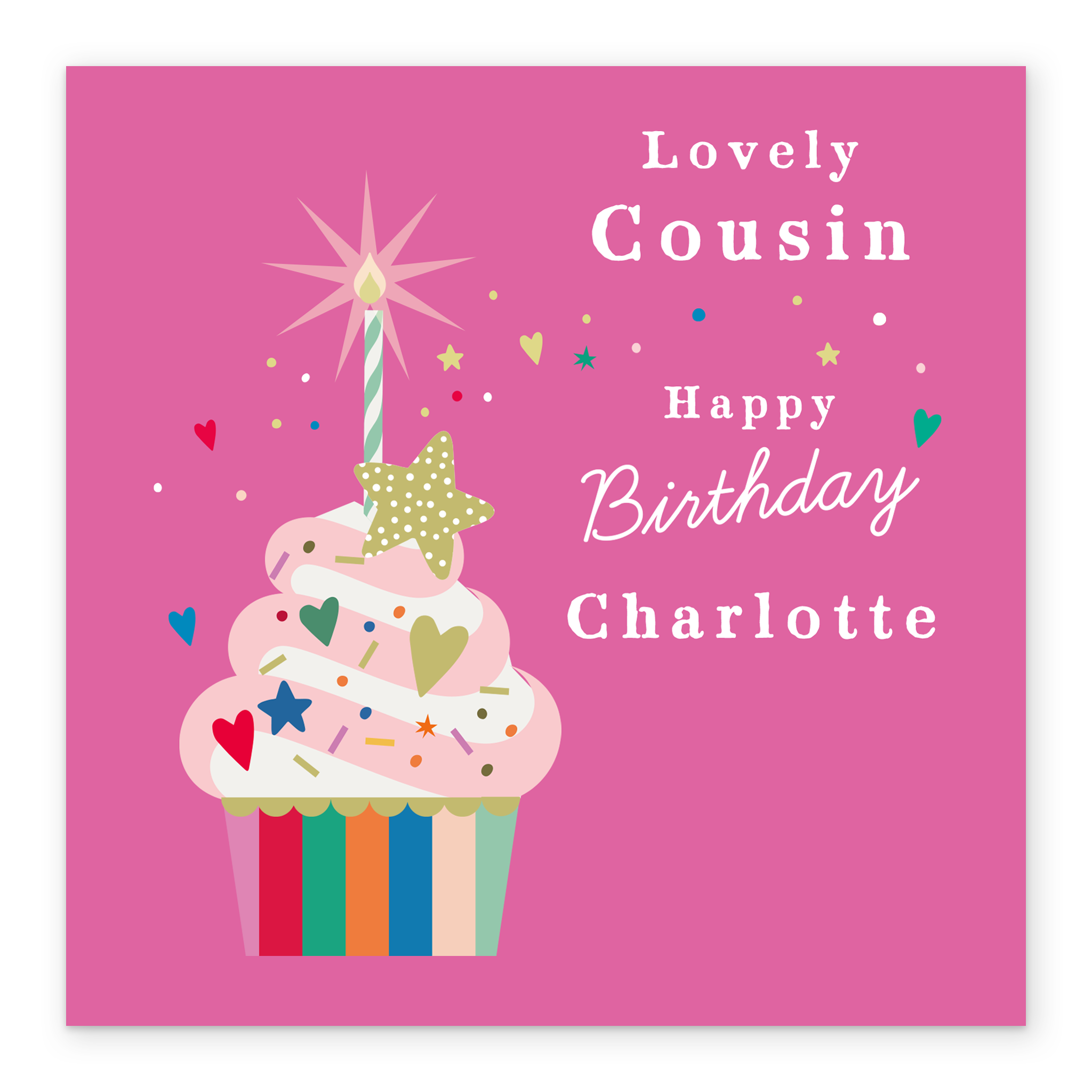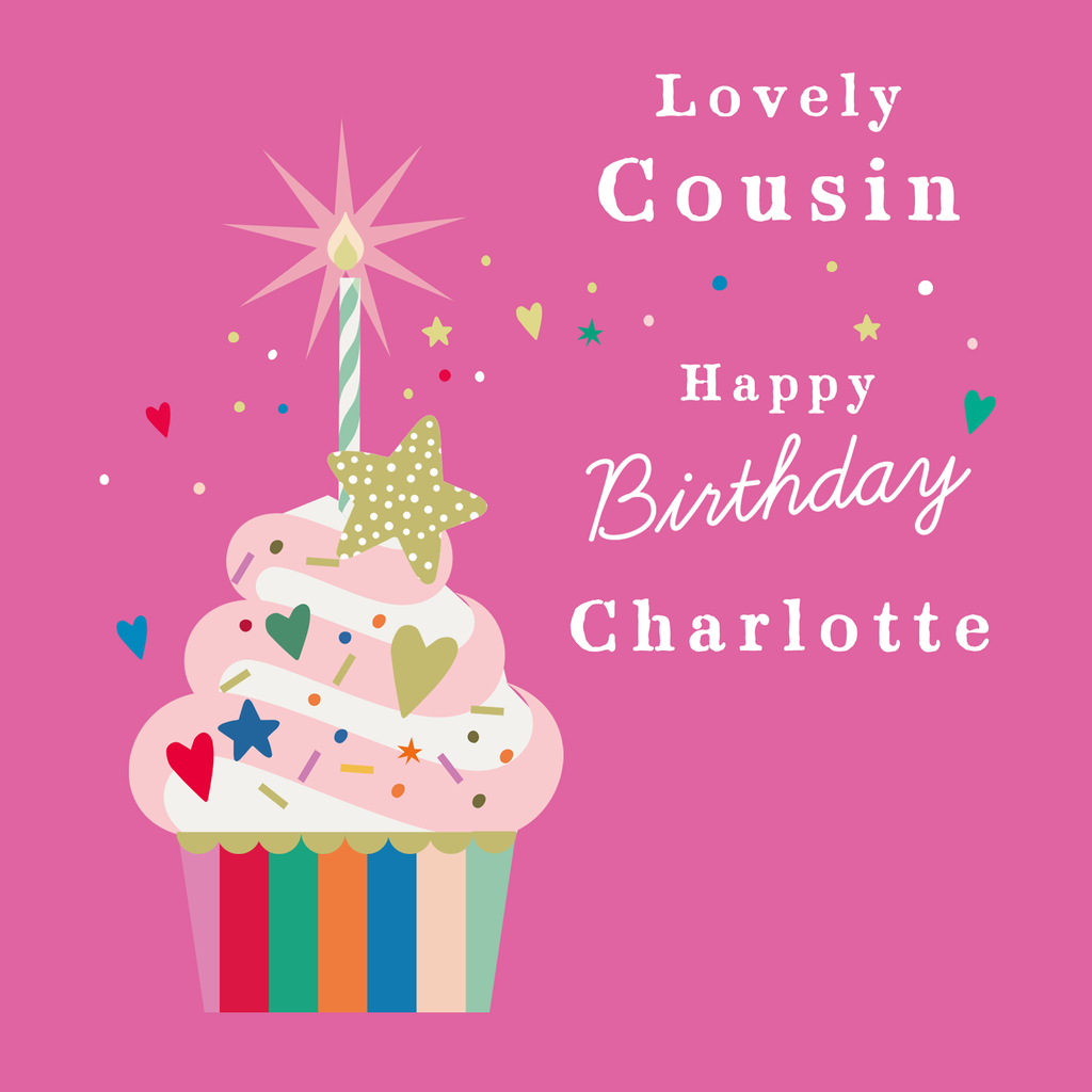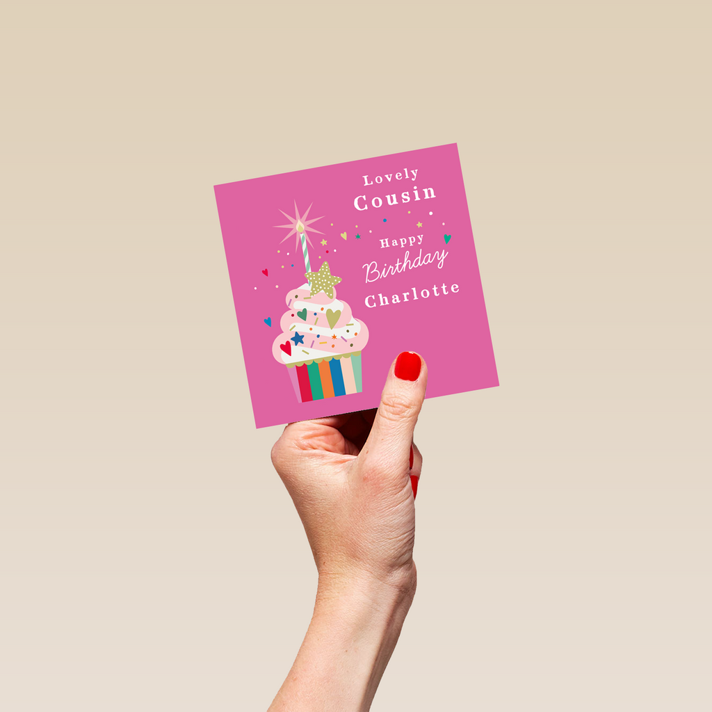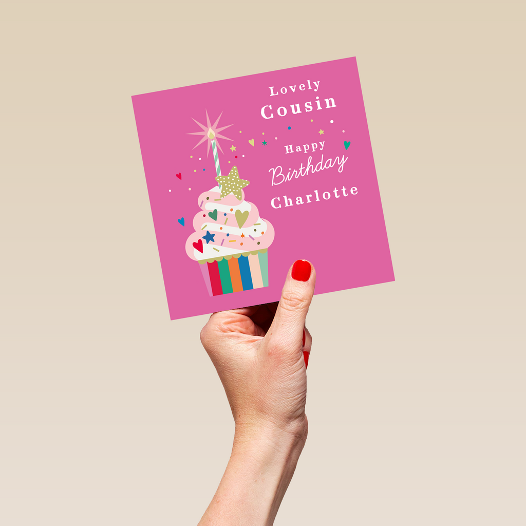 Printed on premium-quality board, this card features a colourful cupcake with a sparkler on a pink background, with the message 'Lovely Cousin Happy Birthday, ', space to personalise a name, and comes complete with a co-ordinating white envelope.