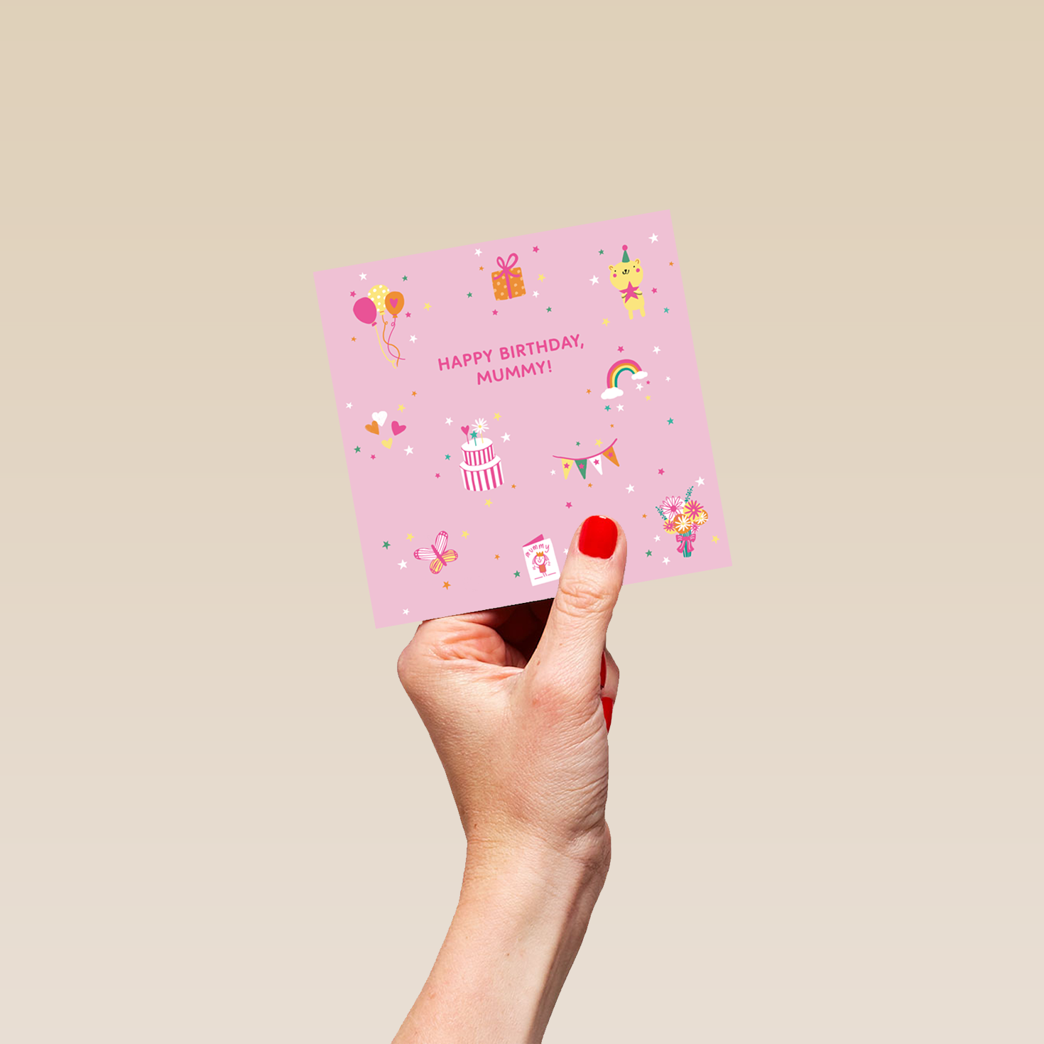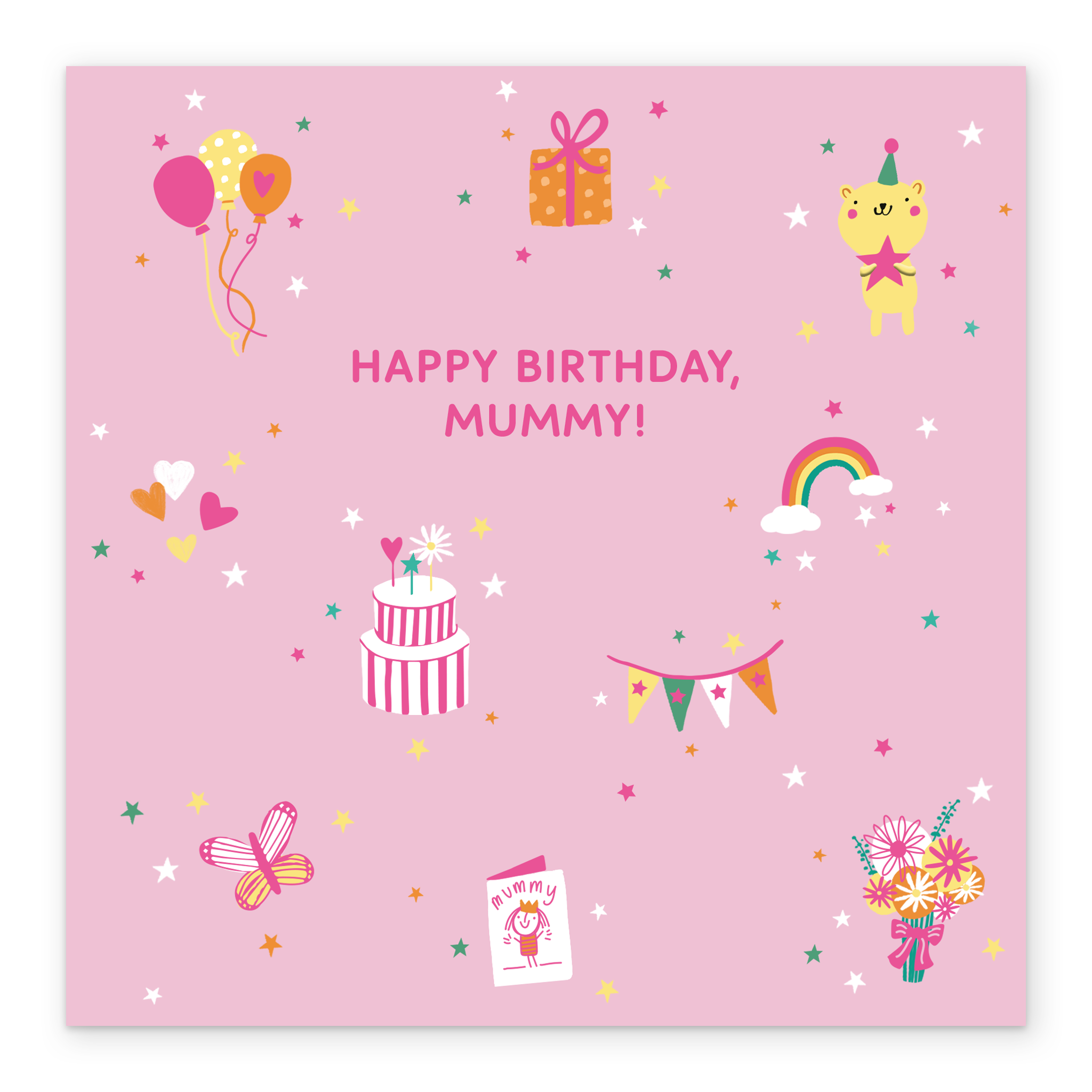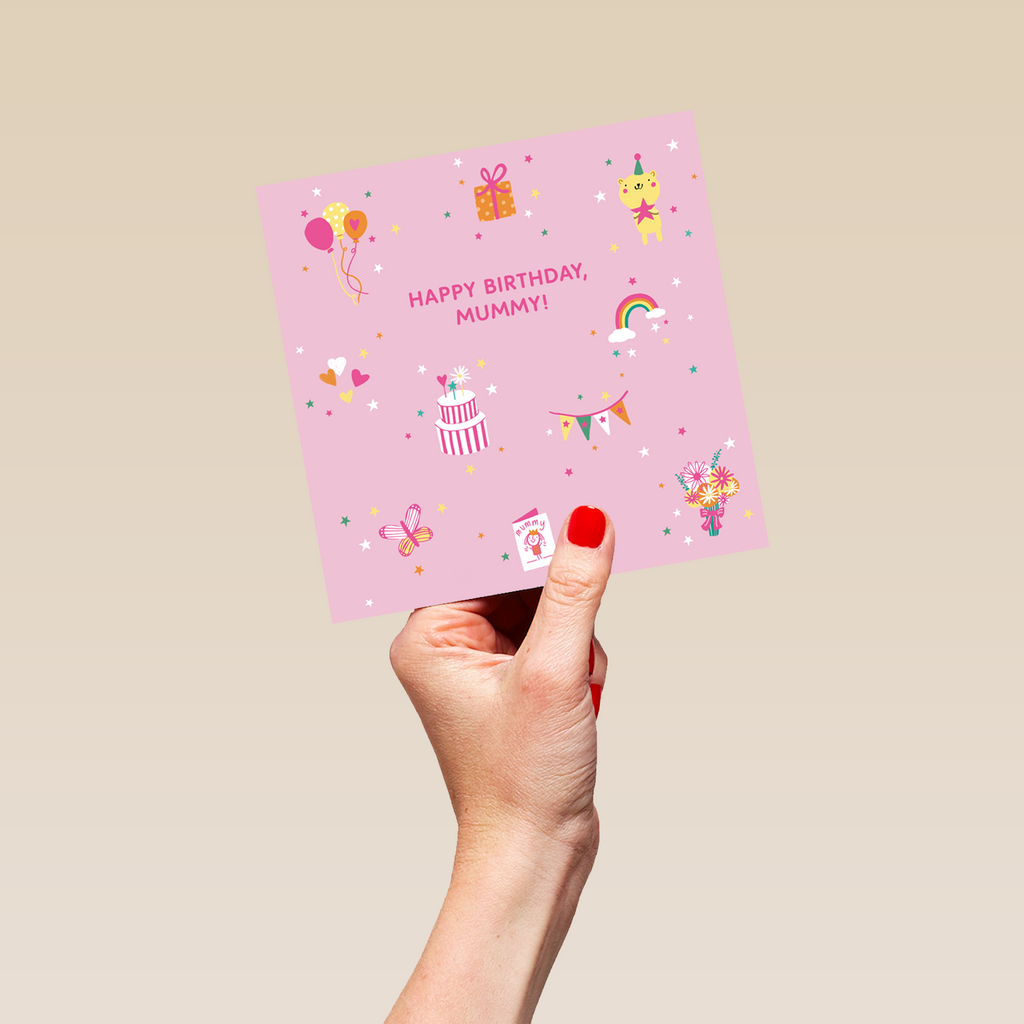 Printed on premium-quality board, this card features cute icons on a pink background, including balloons, gift boxes, teddies, hearts, cakes, banners, flowers, butterflies and rainbows, with the message 'Happy Birthday, Mummy!', space to personalise your message, and comes complete with a co-ordinating white envelope.