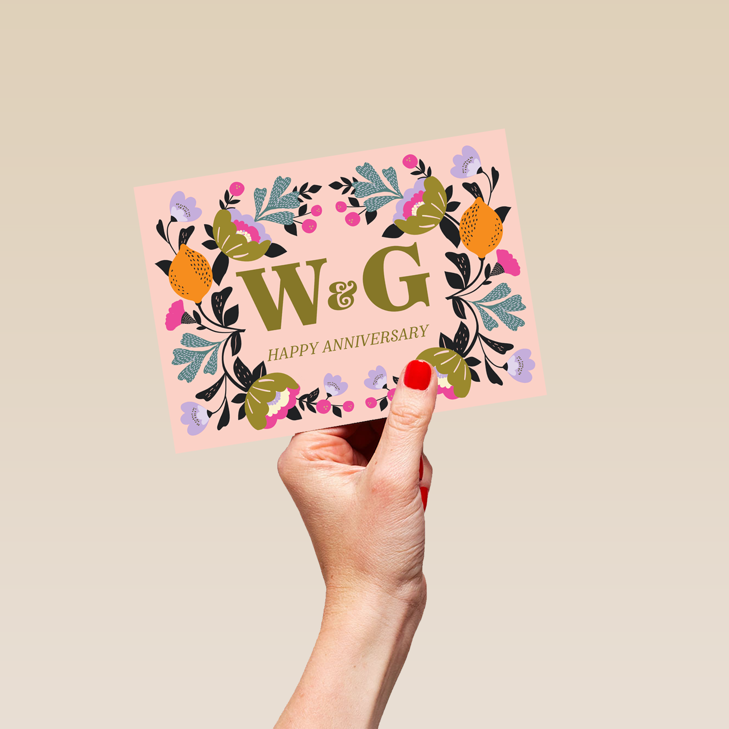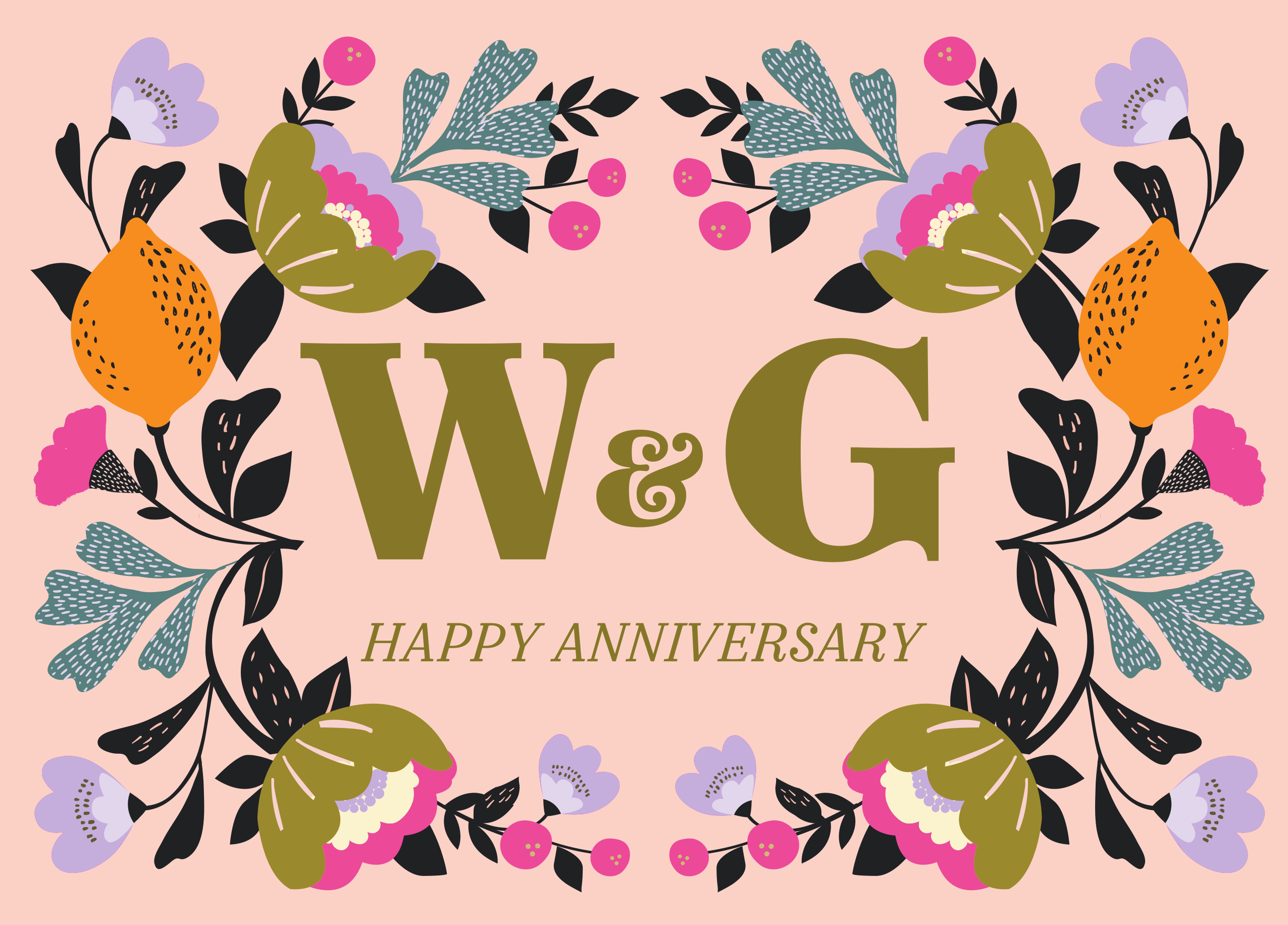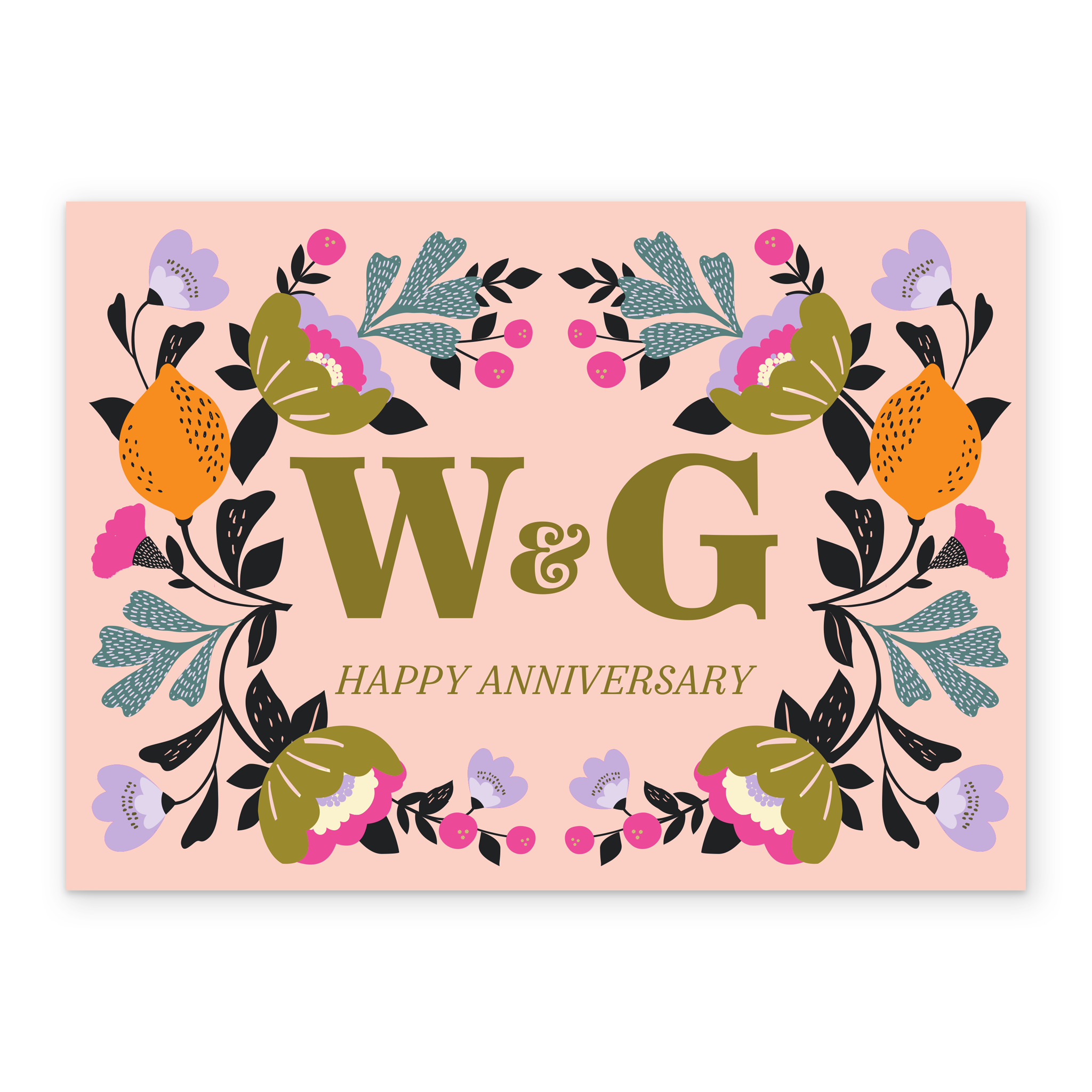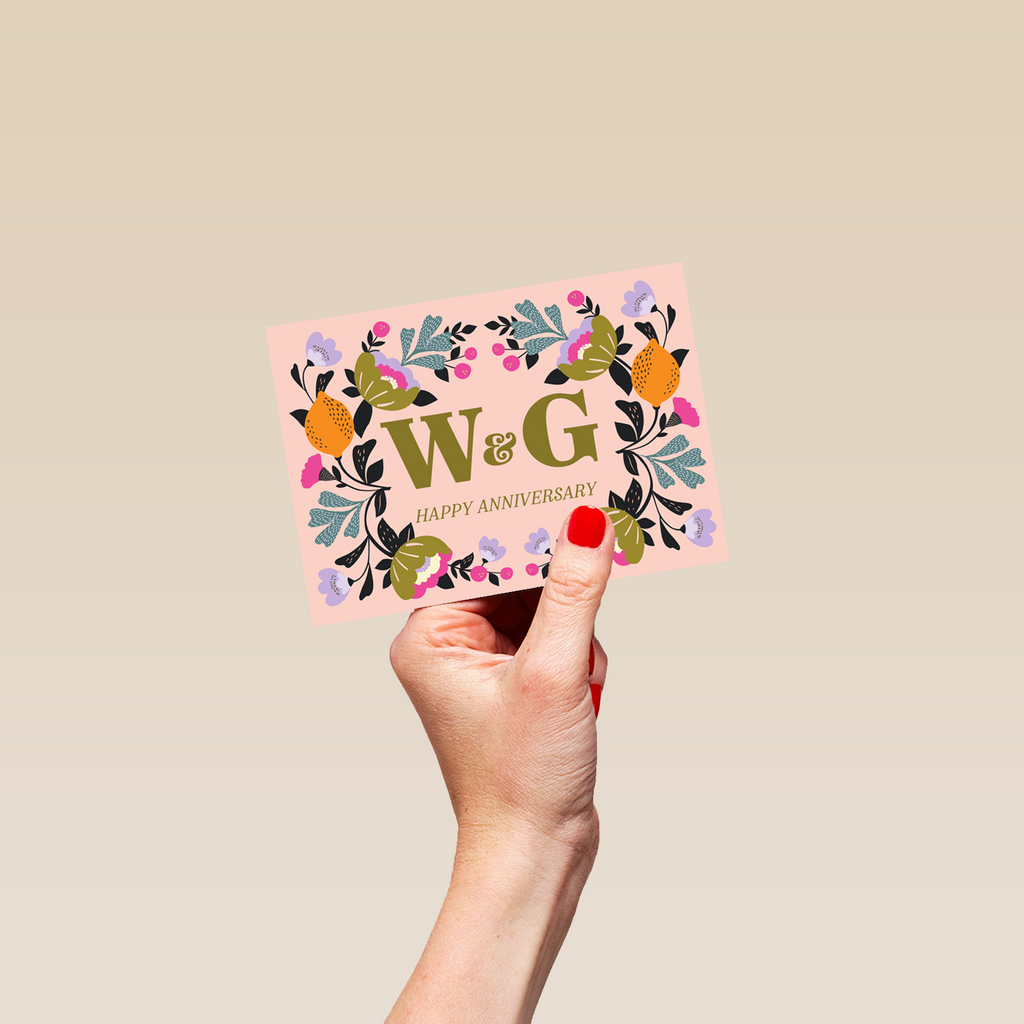 Printed on premium-quality board, this card features a modern botanical illustration, with the message 'Happy Anniversary', space to personalise a name, and comes complete with a co-ordinating white envelope.