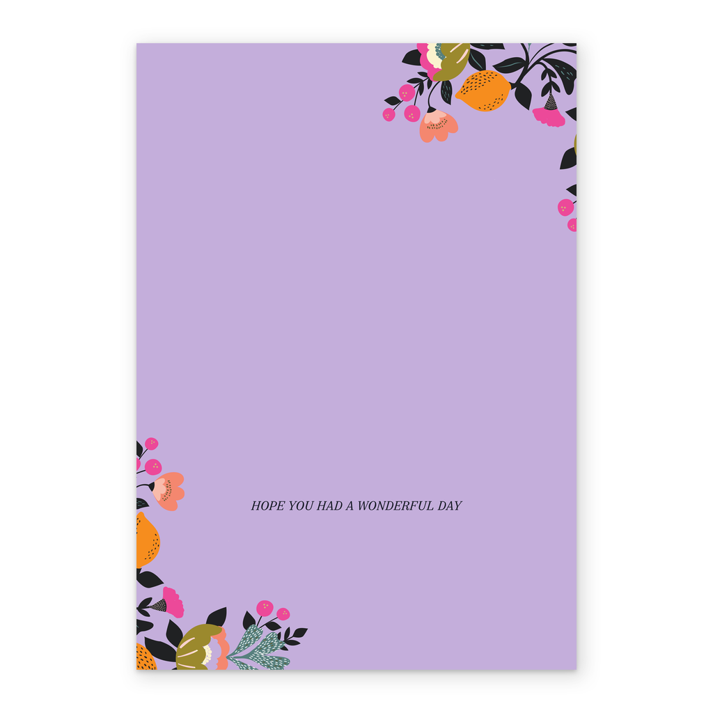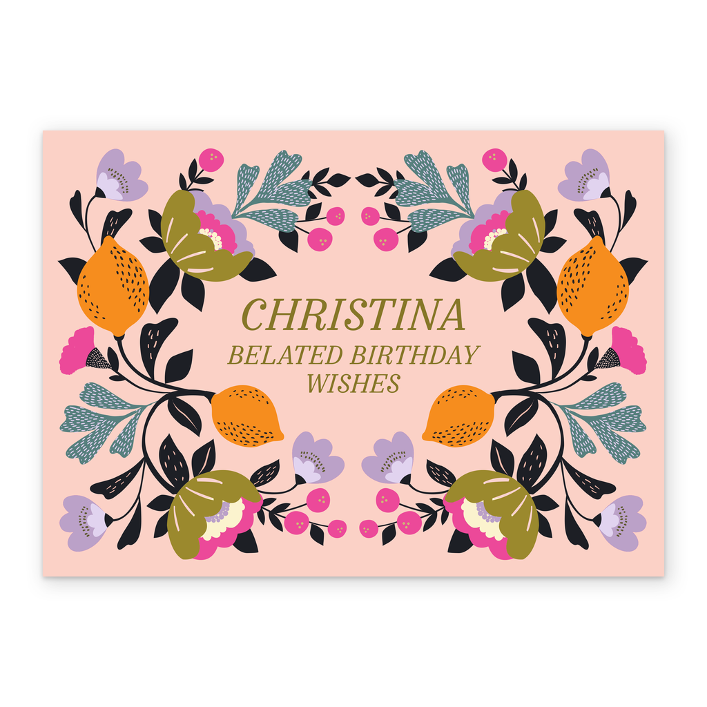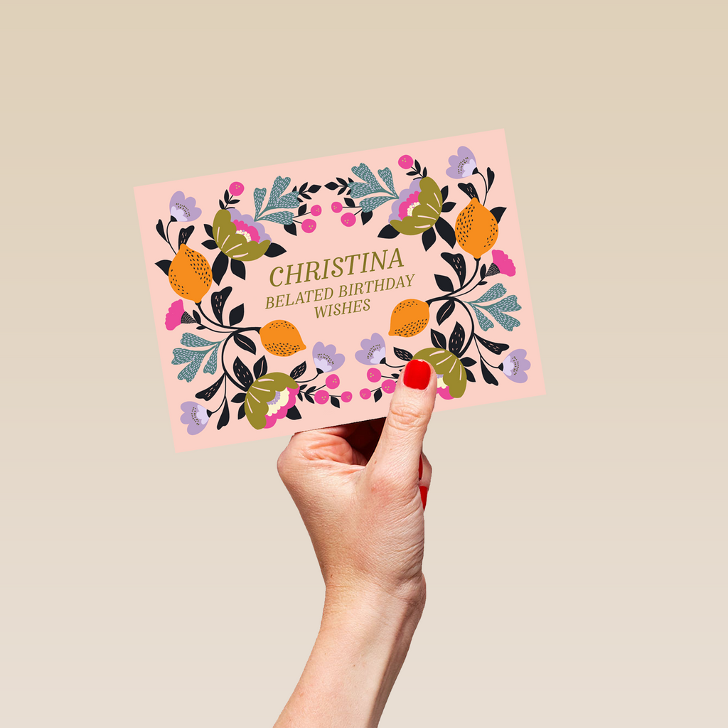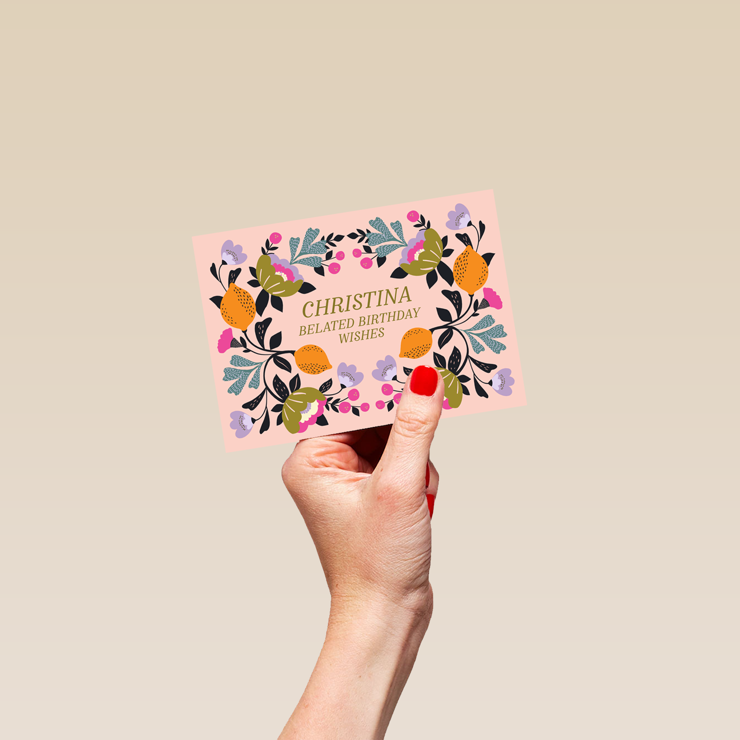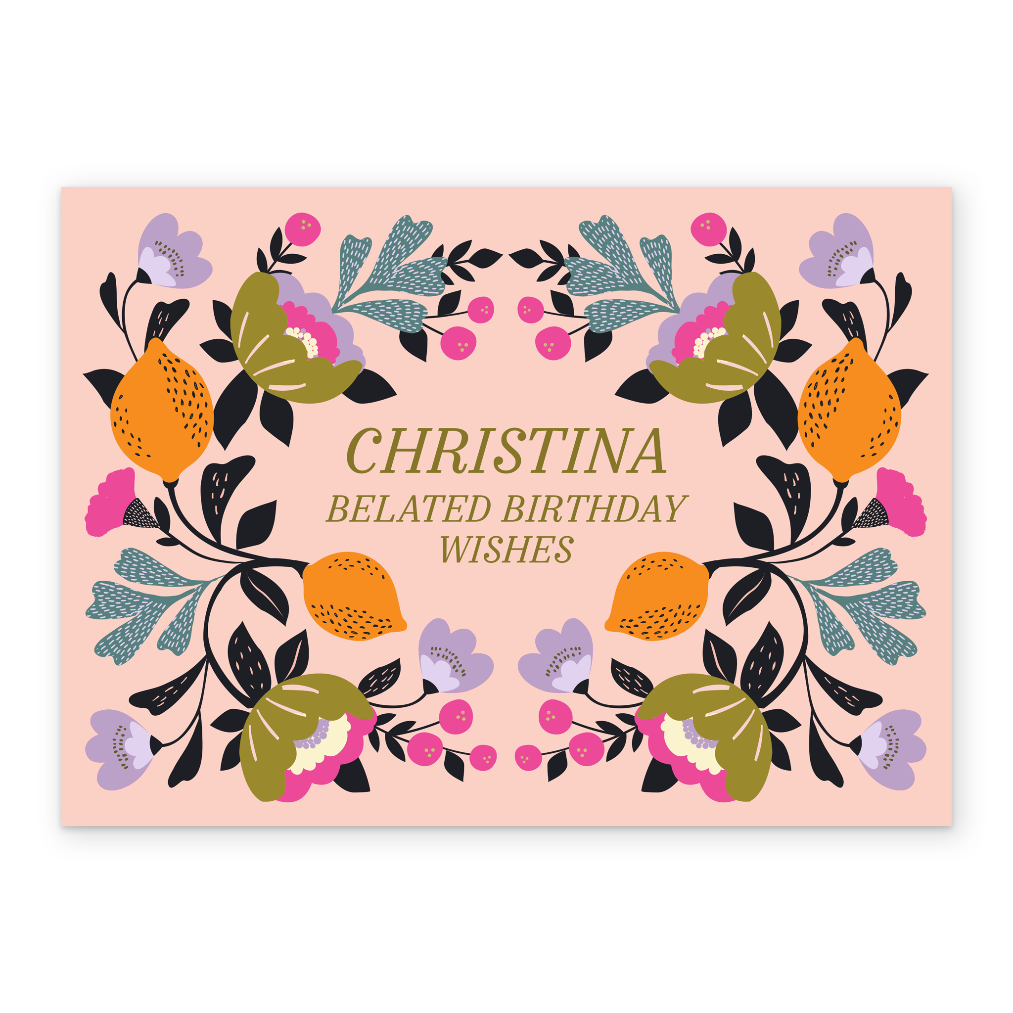 Printed on premium-quality board, this card features a modern botanical illustration, with the message 'Belated birthday wishes', space to personalise a name, and comes complete with a co-ordinating white envelope.