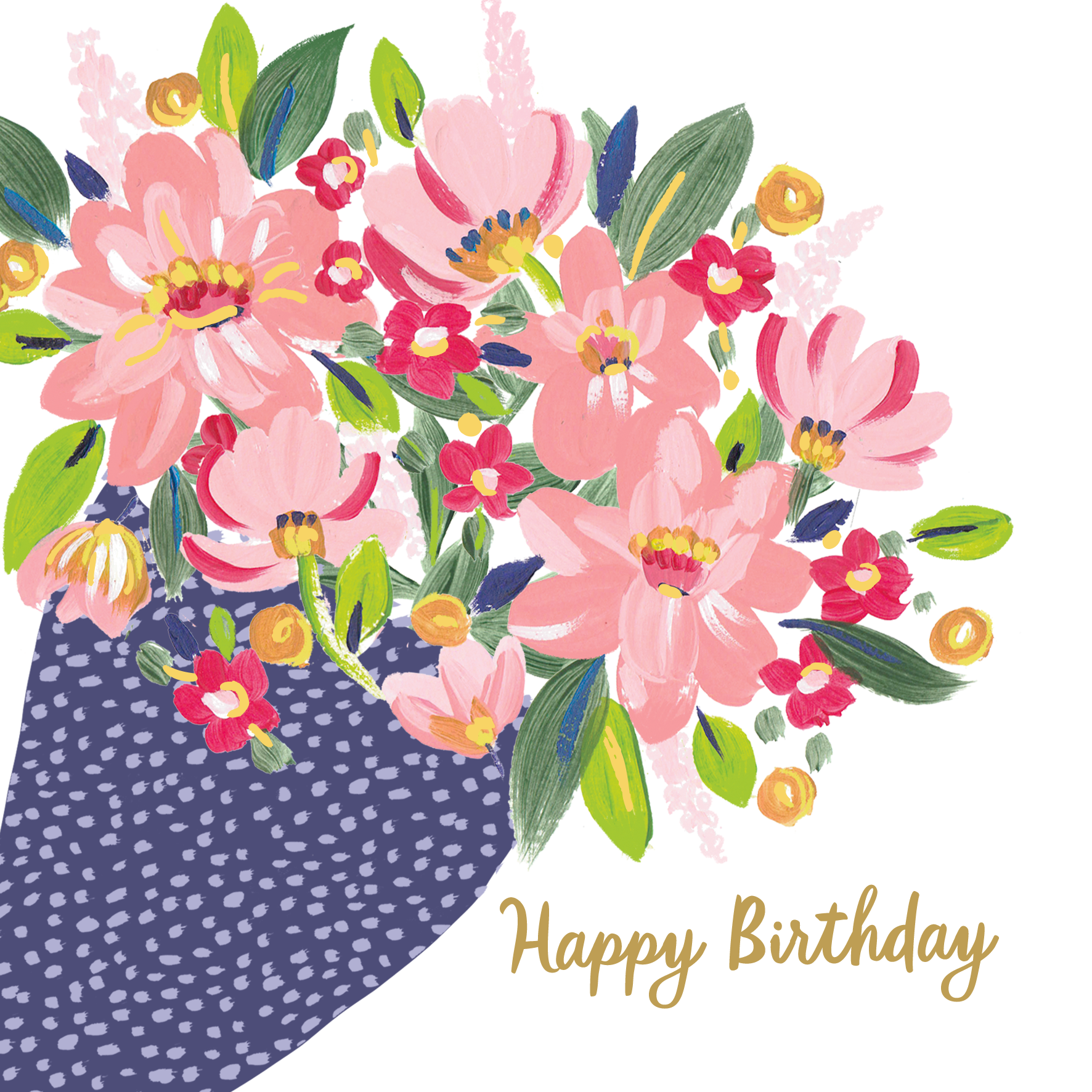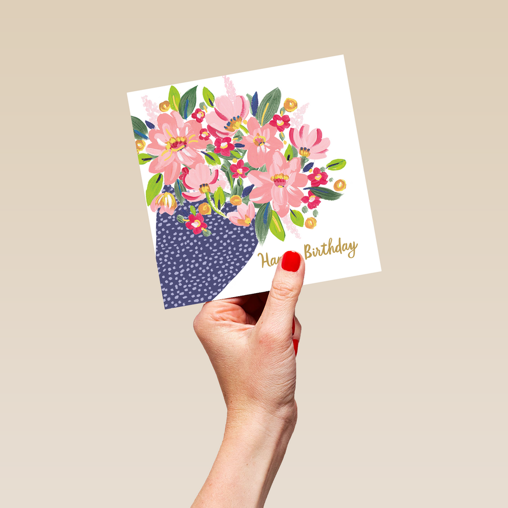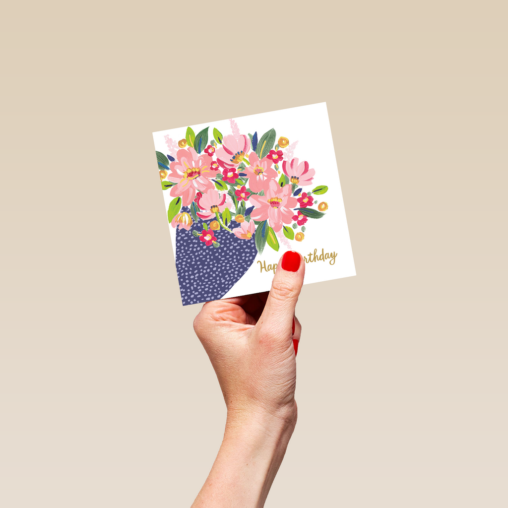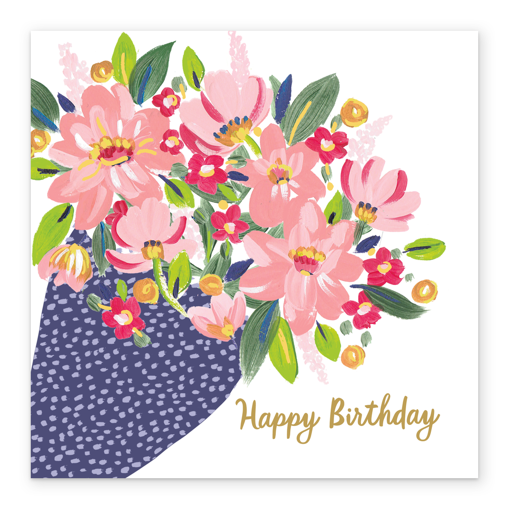 Printed on premium-quality board, this card features a colourful illustration of a bouquet of flowers in a blue speckled wrap, with the message 'Happy Birthday [NAME]', space to personalise your message, and comes complete with a co-ordinating white envelope.