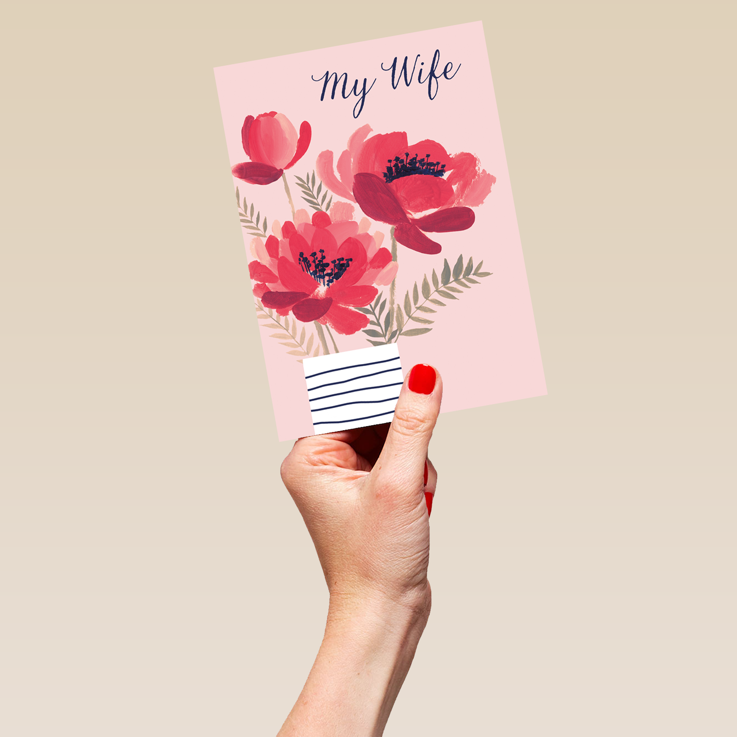 Printed on premium-quality board, this card features a in background with a bouquet of pink flowers in a vase, with the message 'MY WIFE', space to personalise a name, and comes complete with a co-ordinating white envelope.