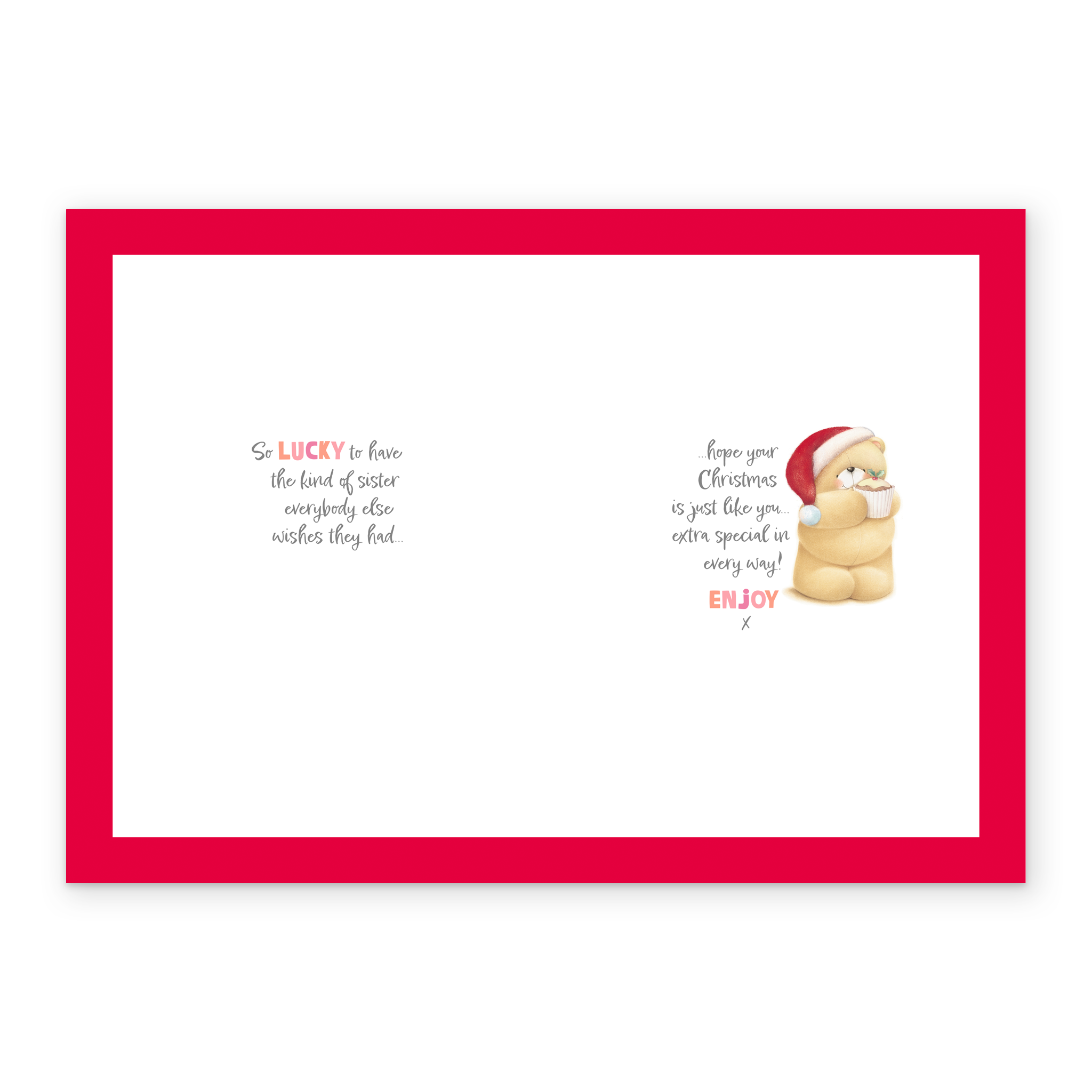 Printed on premium-quality board, this card features a Forever Friends bear in a Santa hat and holding a pink gift box and card, with the message 'For [Name], a special sister Hope your Christmas is amazing… because you're amazing too!', space to personalise a name, and comes complete with a co-ordinating white envelope.