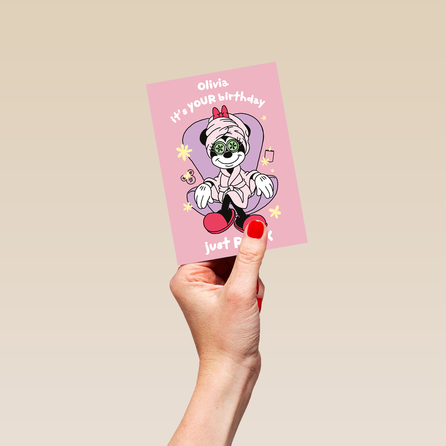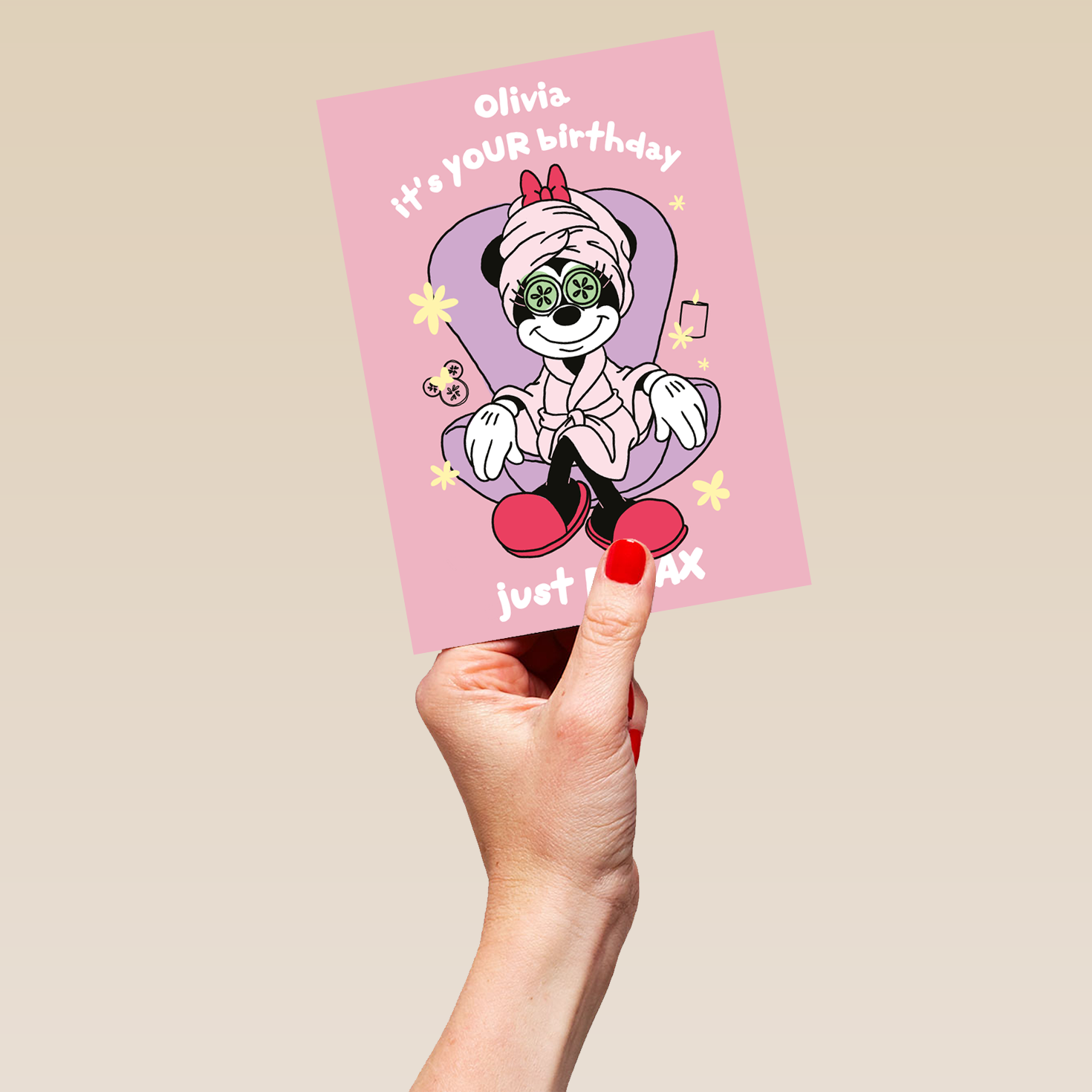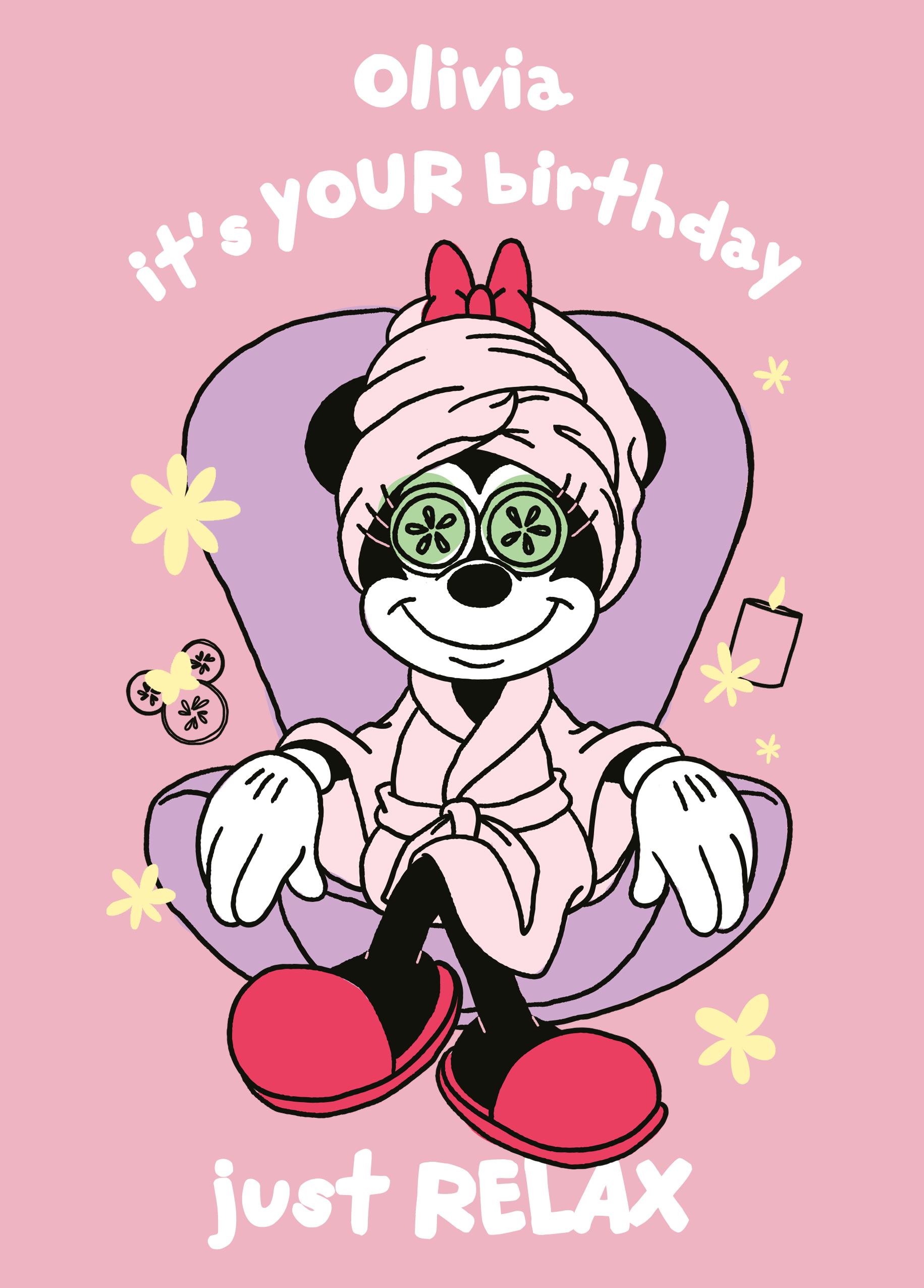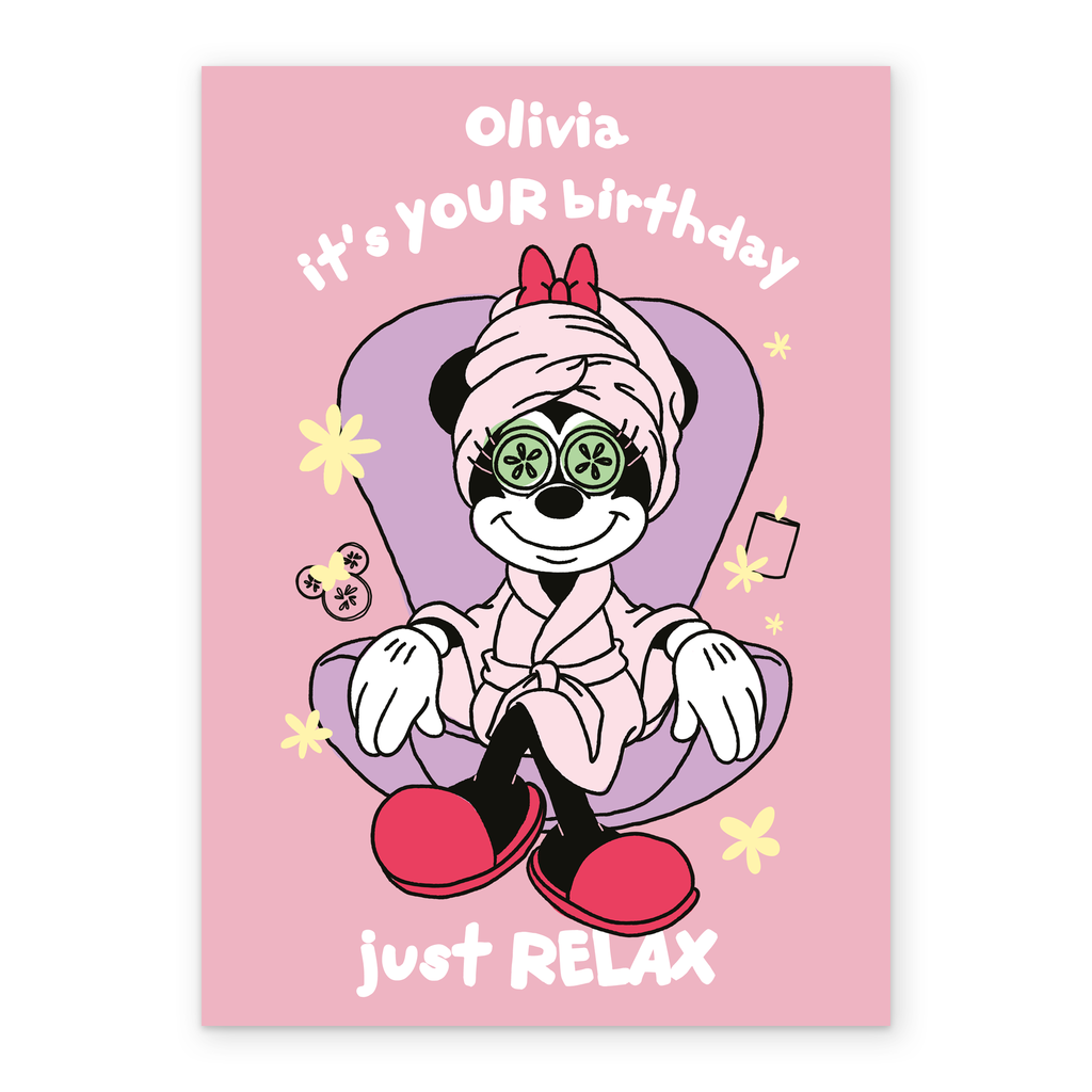 Printed on premium-quality board, this card features Minnie Mouse having a spa day, relaxing in a bath robe with cucumber slices on her eyes, with the message 'It's your birthday, just relax', space to personalise a name, and comes complete with a co-ordinating white envelope.