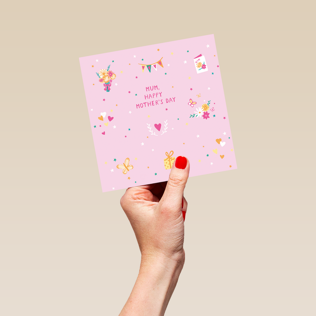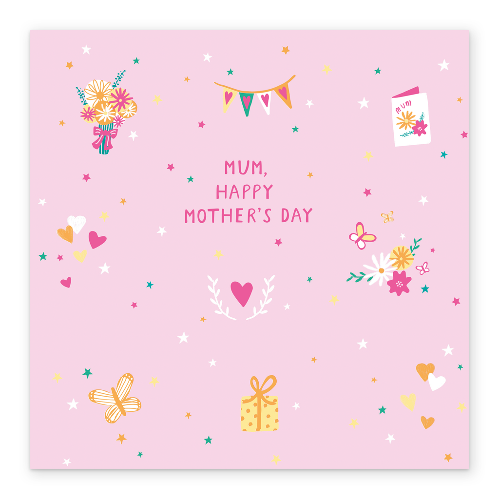 Printed on premium-quality board, this card features a pink background with different Mother's Day icons, including a bouquet of flowers, card, gifts, butterfly, banners and heart, with the message 'Mum, Happy Mother's Day', space to personalise a name, and comes complete with a co-ordinating white envelope.