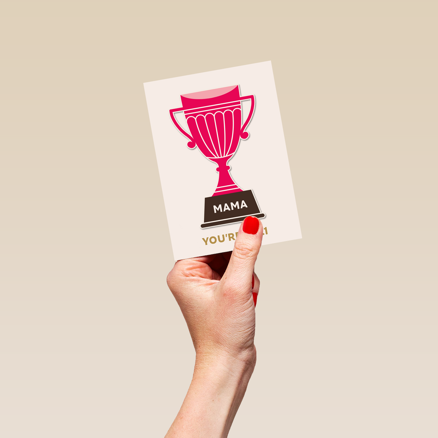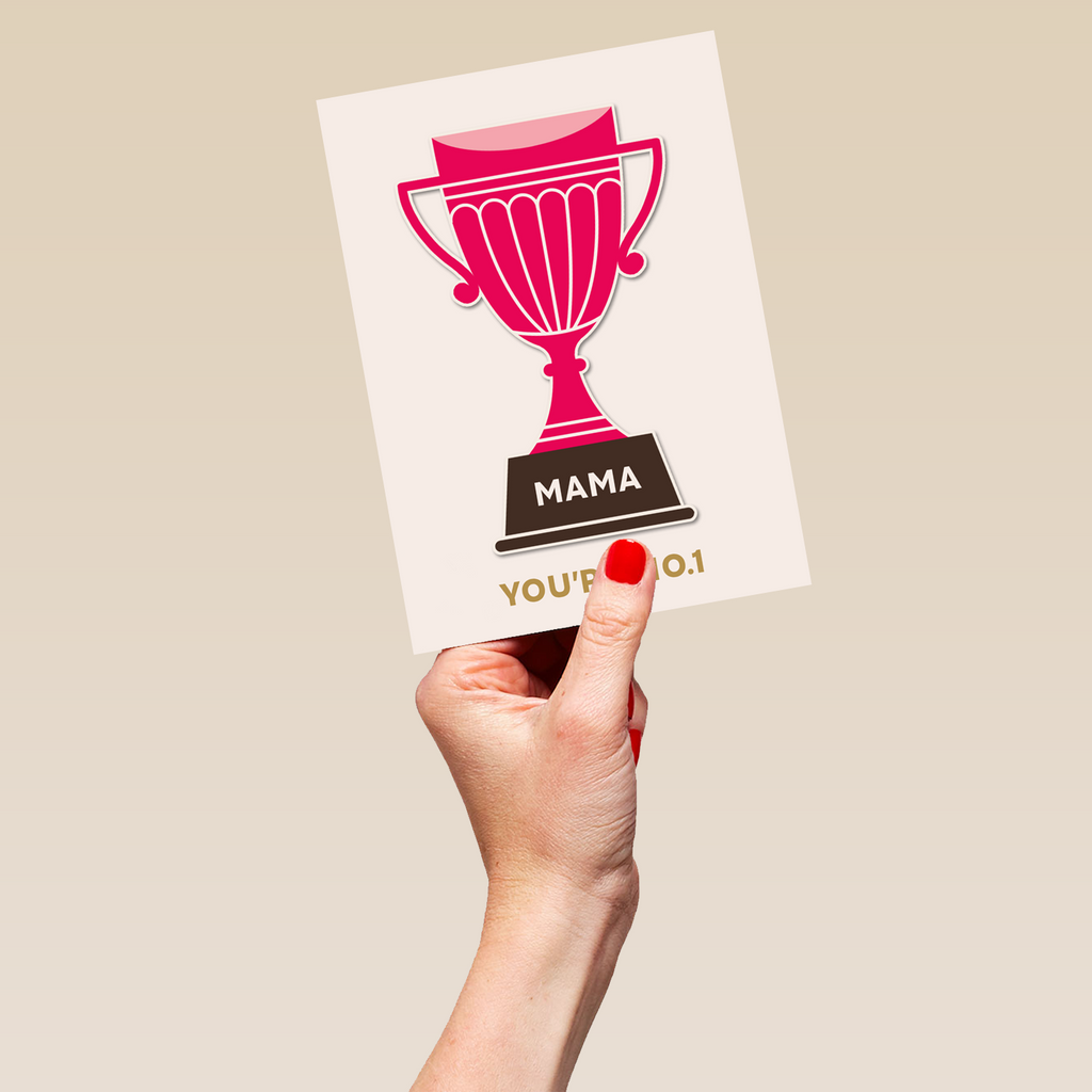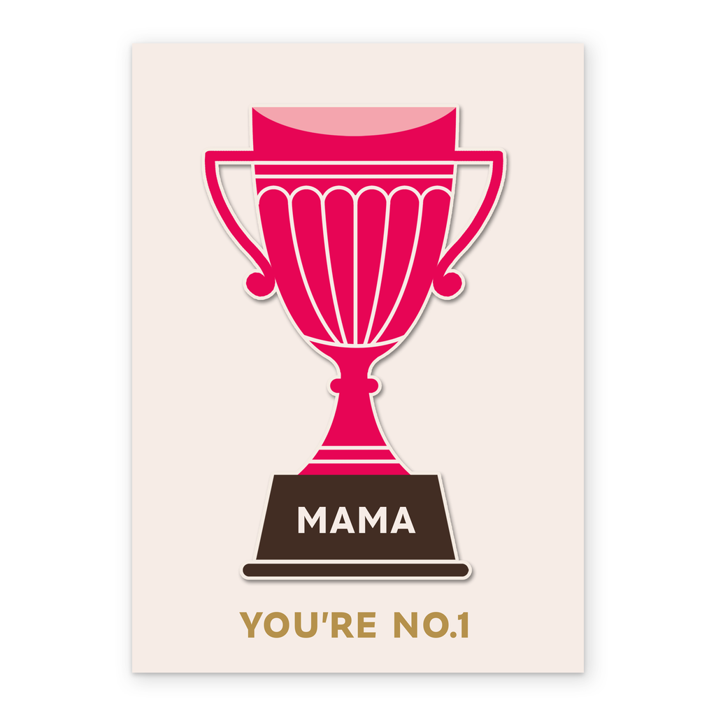 Printed on premium-quality board, this card features a pink #1 trophy, with the message 'Mama, you're No.1', space to personalise your message, and comes complete with a co-ordinating white envelope.