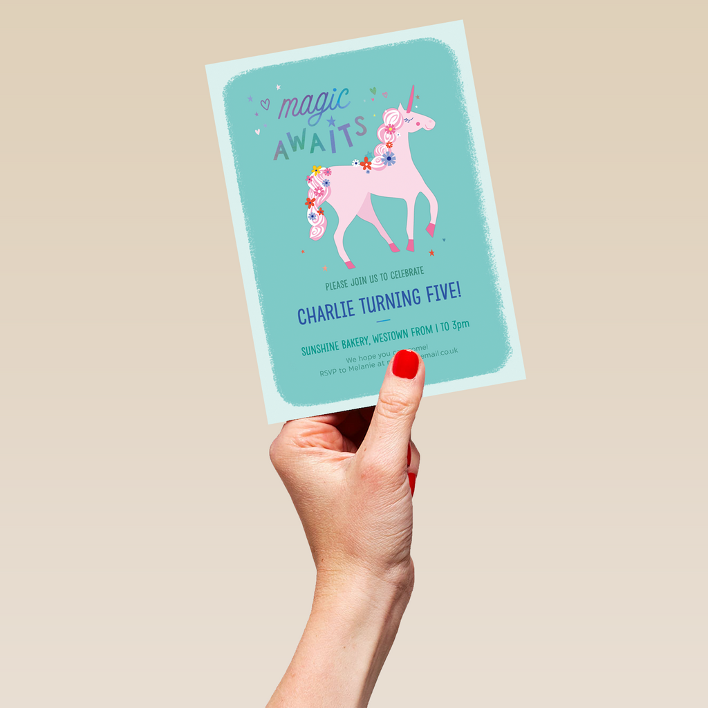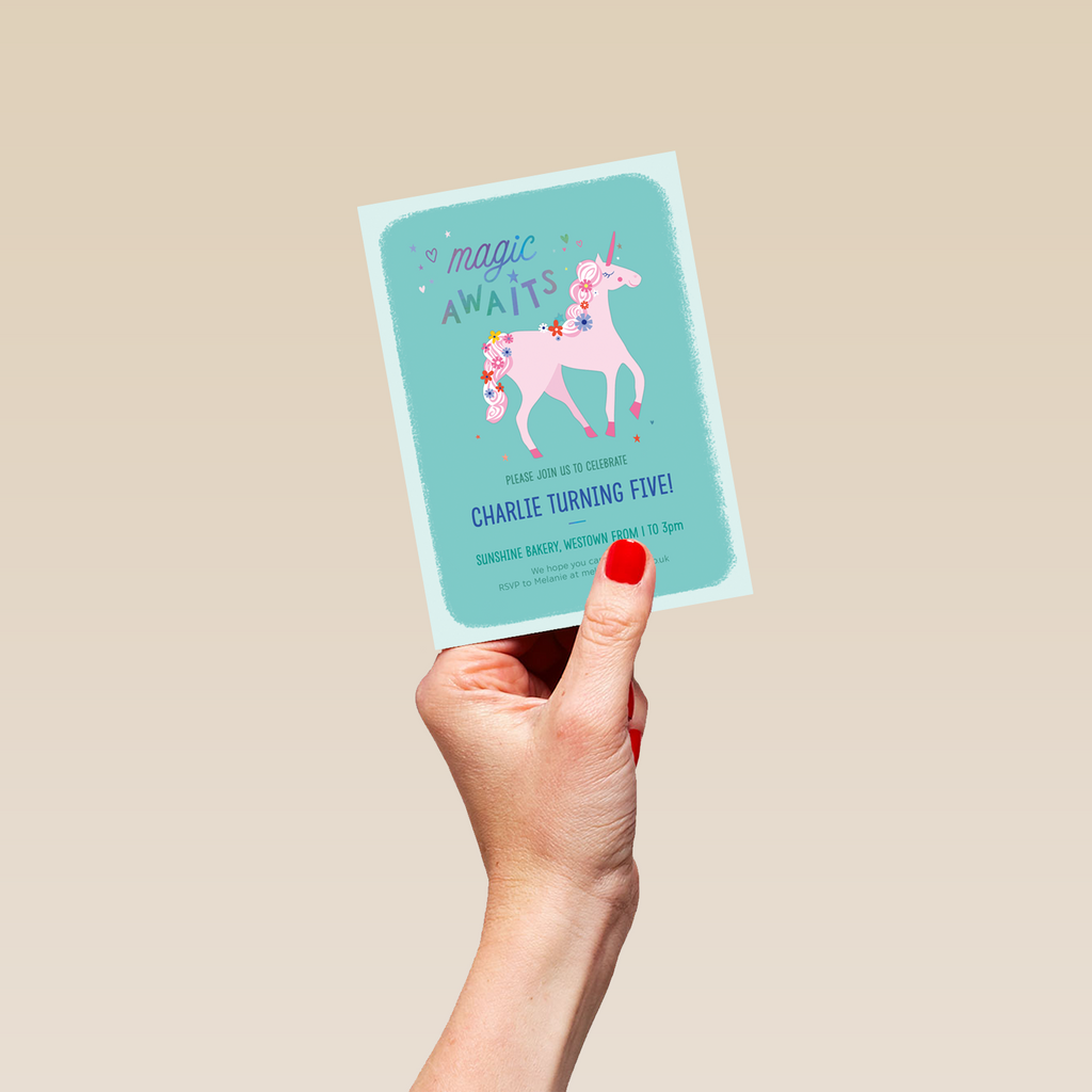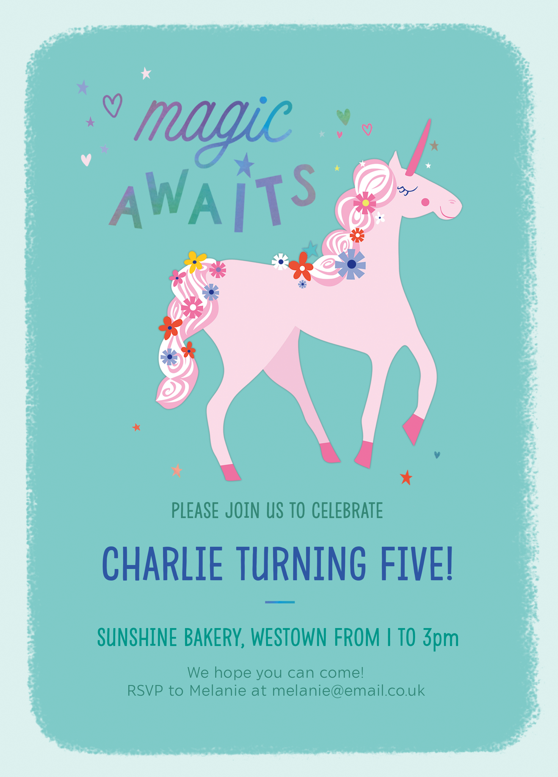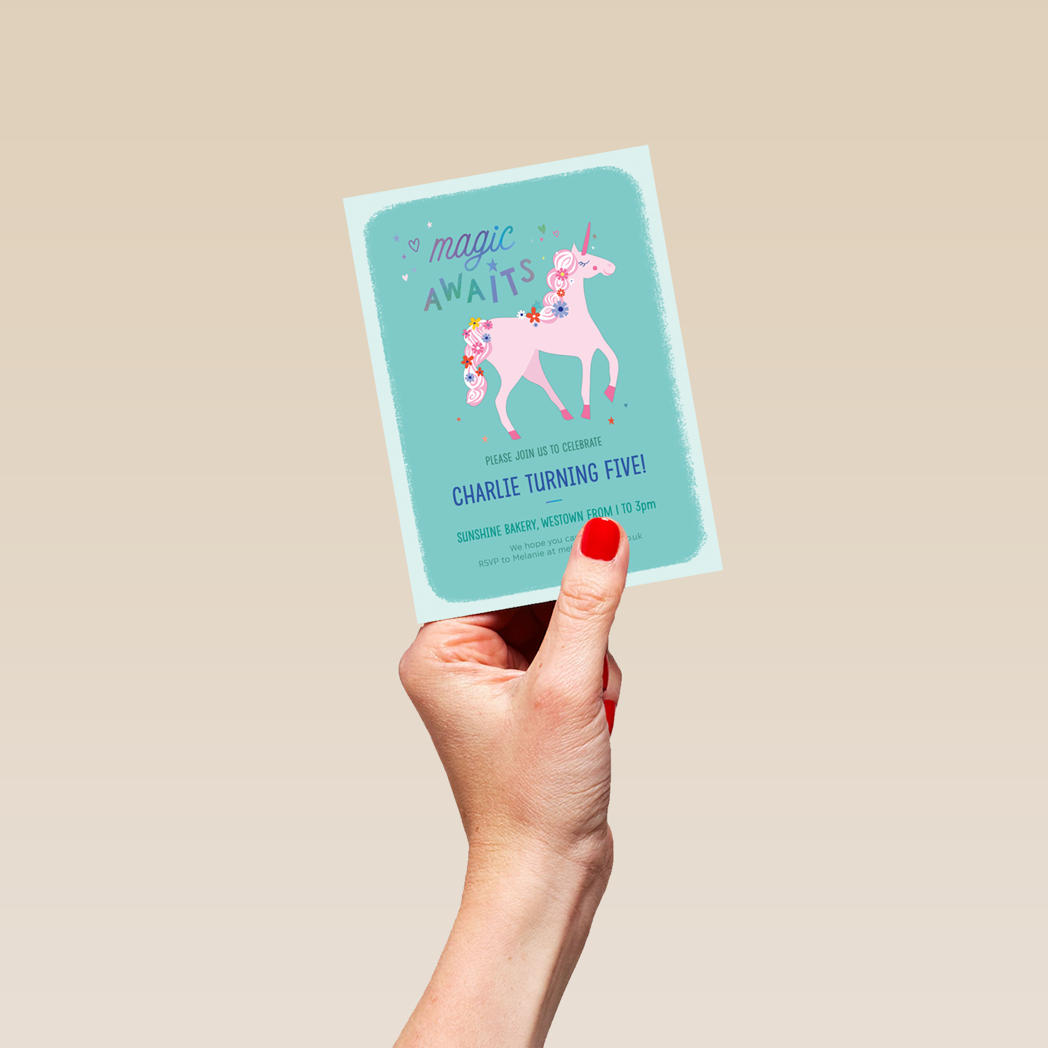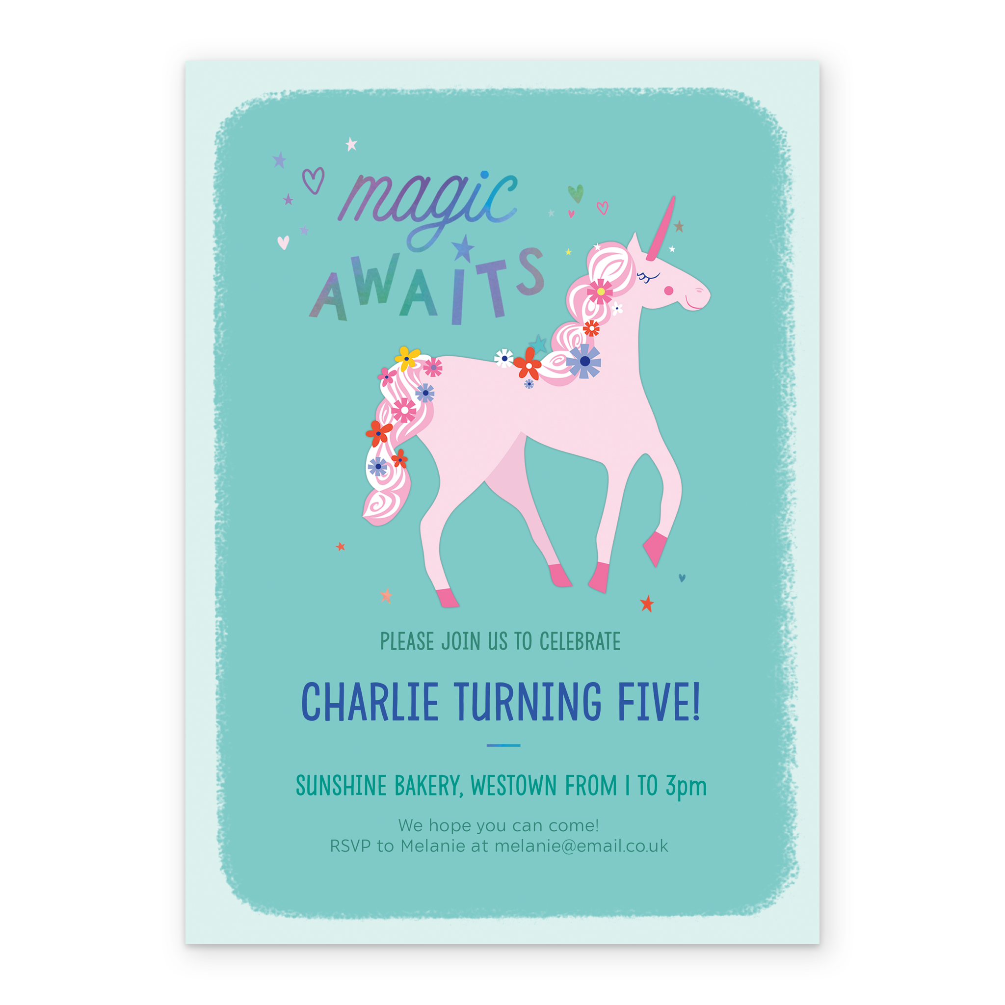 Printed on premium-quality board, this card features editable space for a date, address and contact details, a pink unicorn with a floral mane design, with the message 'Magic Awaits. Please join us to celebrate [Name] turning five!', space to personalise a name and age, and comes complete with a co-ordinating white envelope.