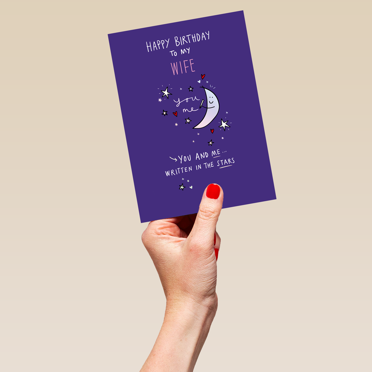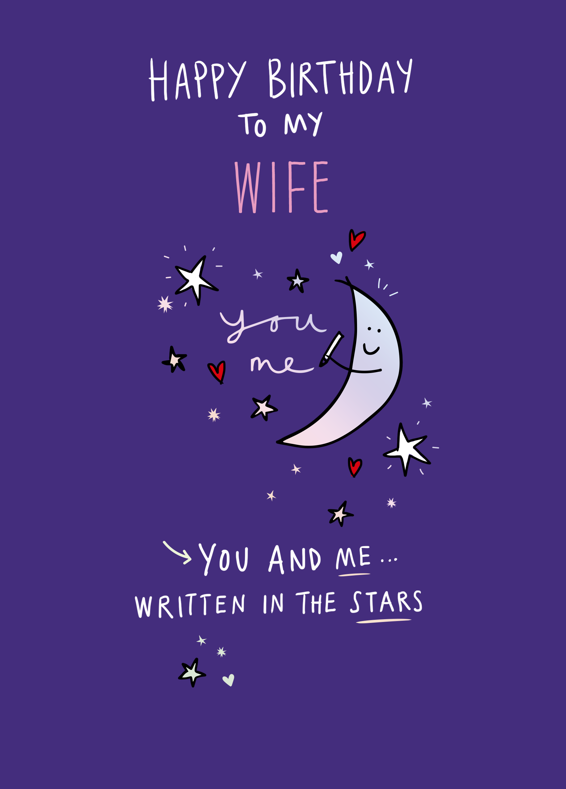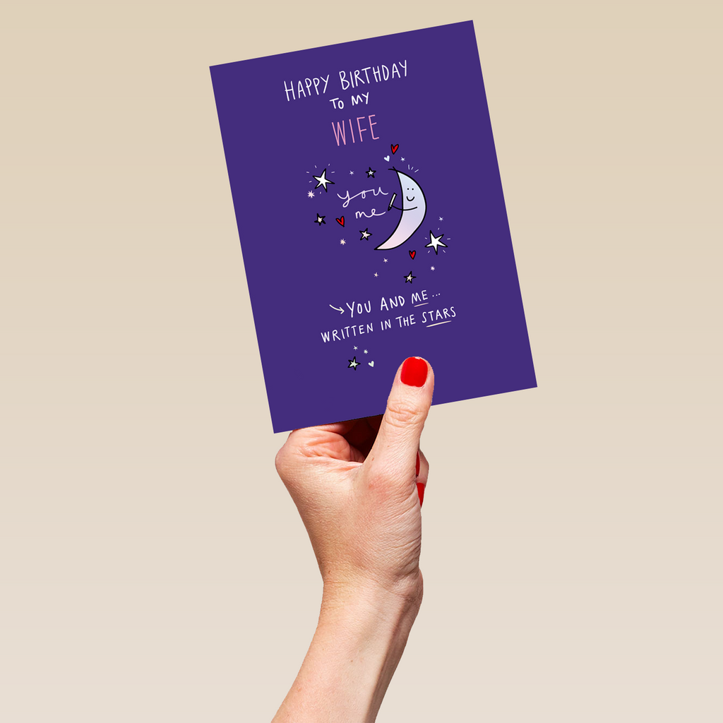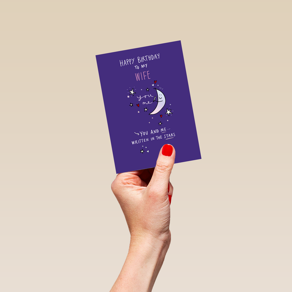 Printed on premium-quality board, this card features a purple background with a moon and stars, with the message 'Happy Birthday to My [NAME] You and me... written in the stars', space to personalise a name, and comes complete with a co-ordinating white envelope.