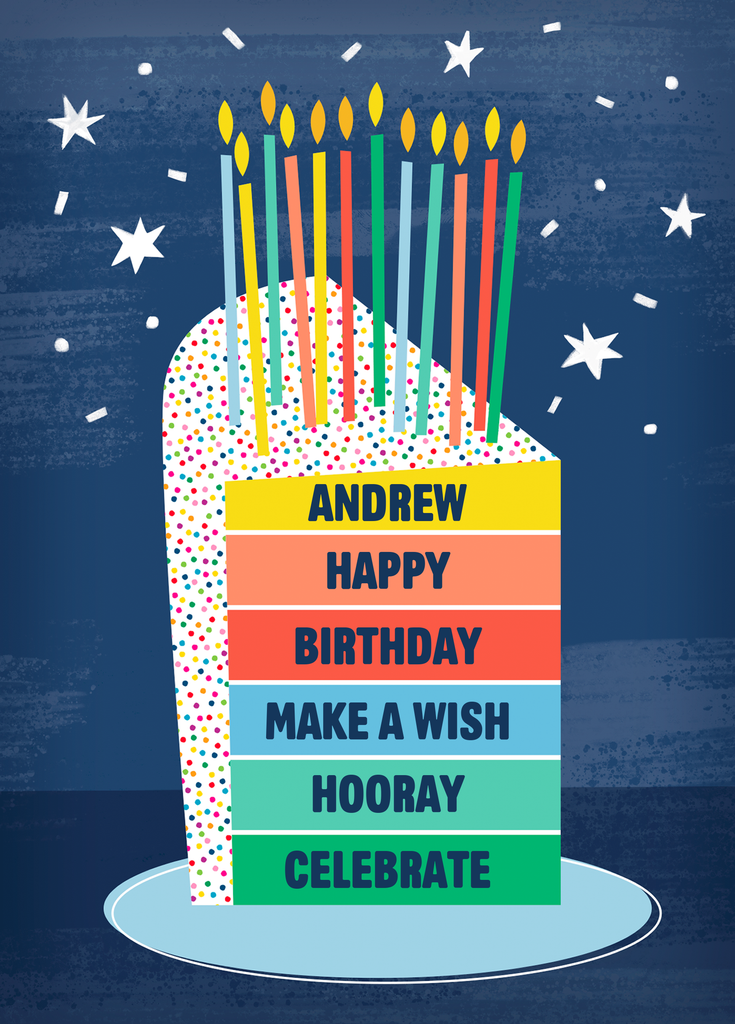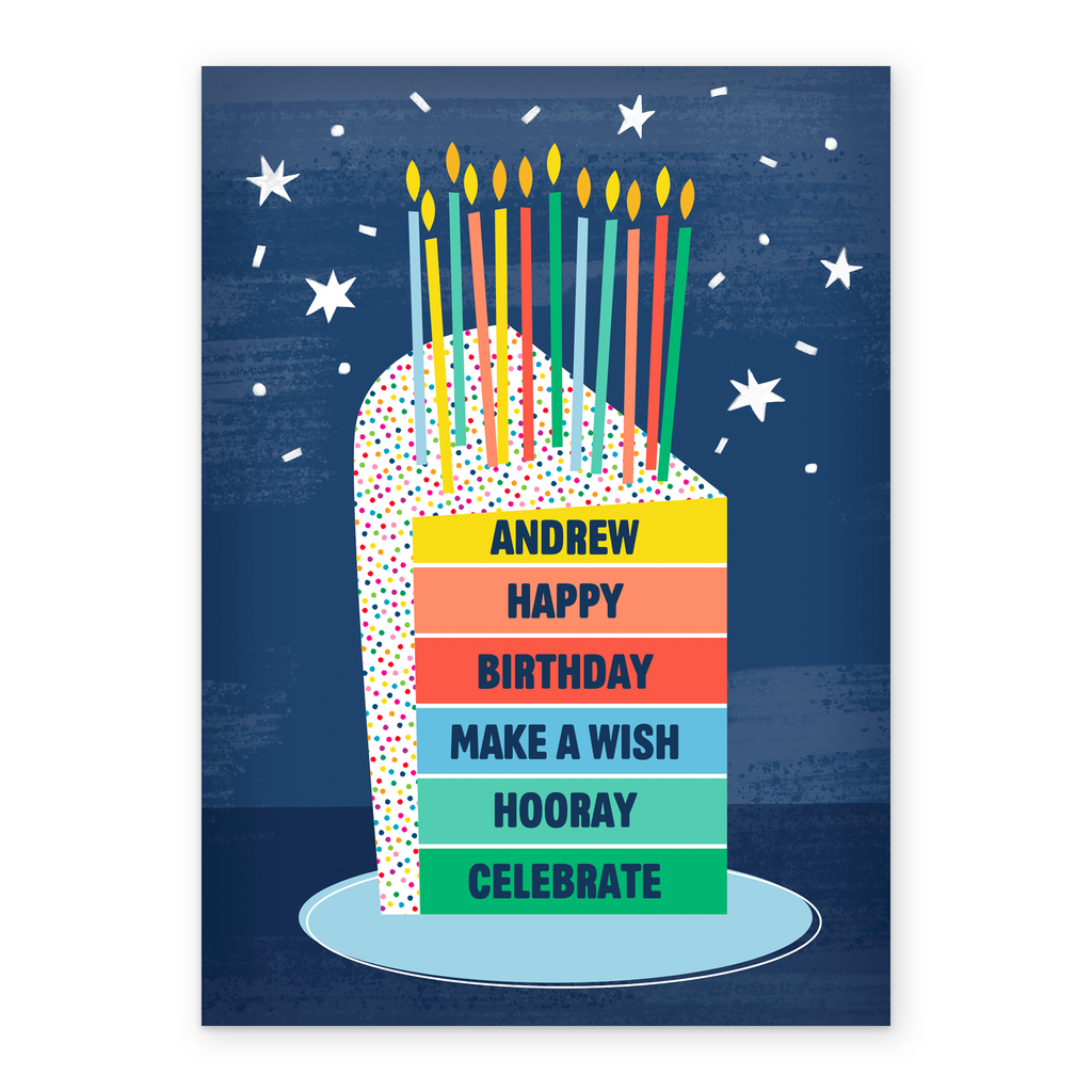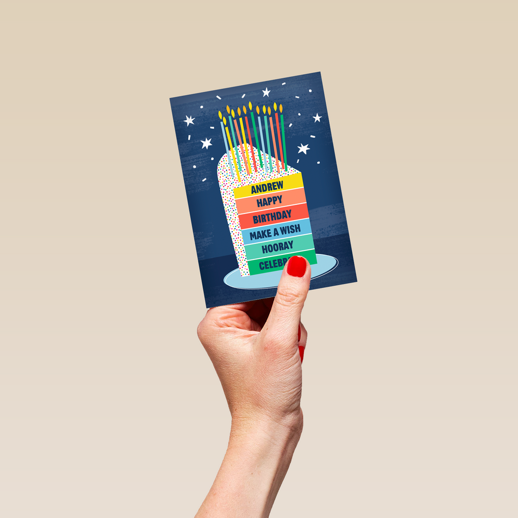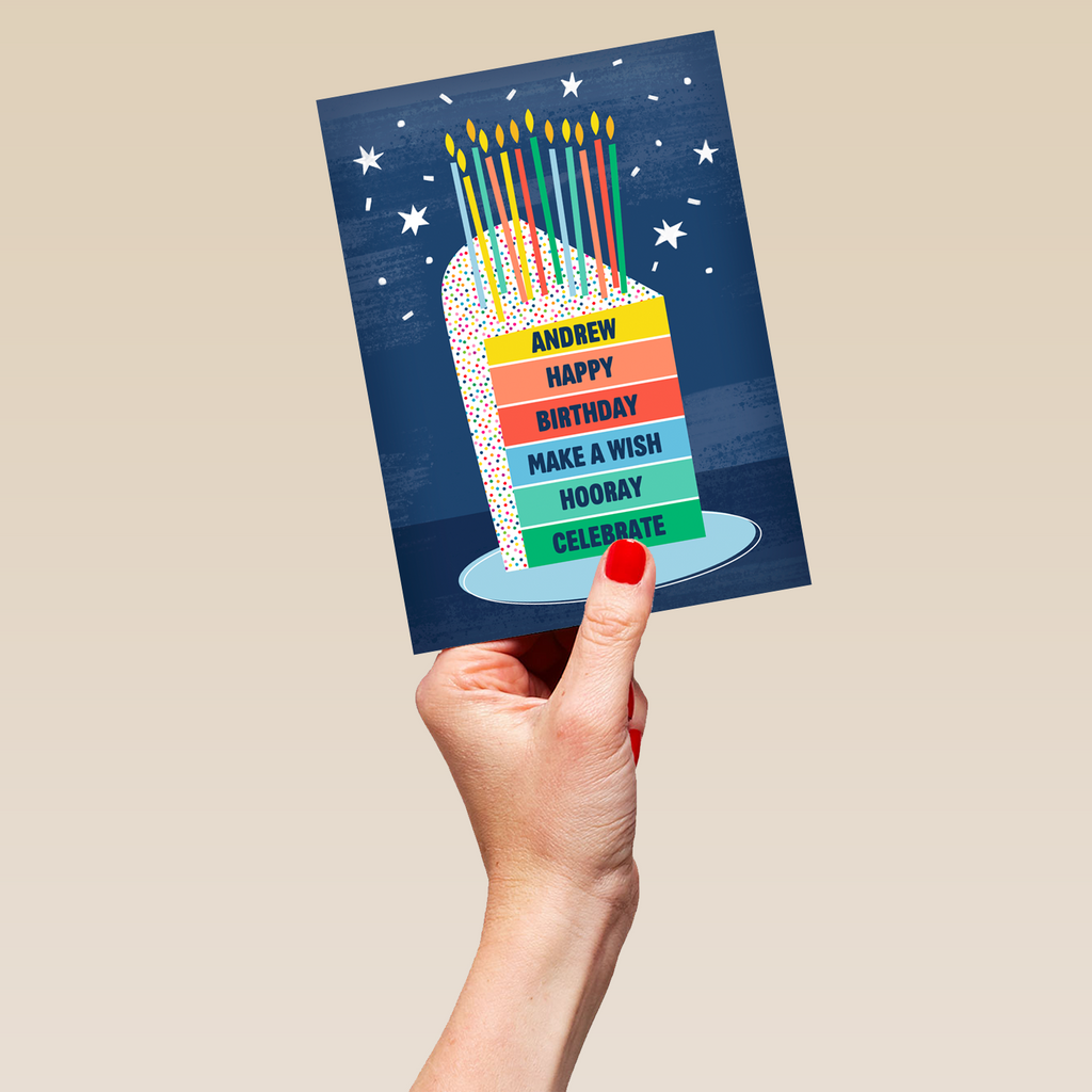 Printed on premium-quality board, this card features a colourful layered birthday cake with candles, with the message 'Happy Birthday, Make A Wish, Hooray, Celebrate', space to personalise your message, and comes complete with a co-ordinating white envelope.