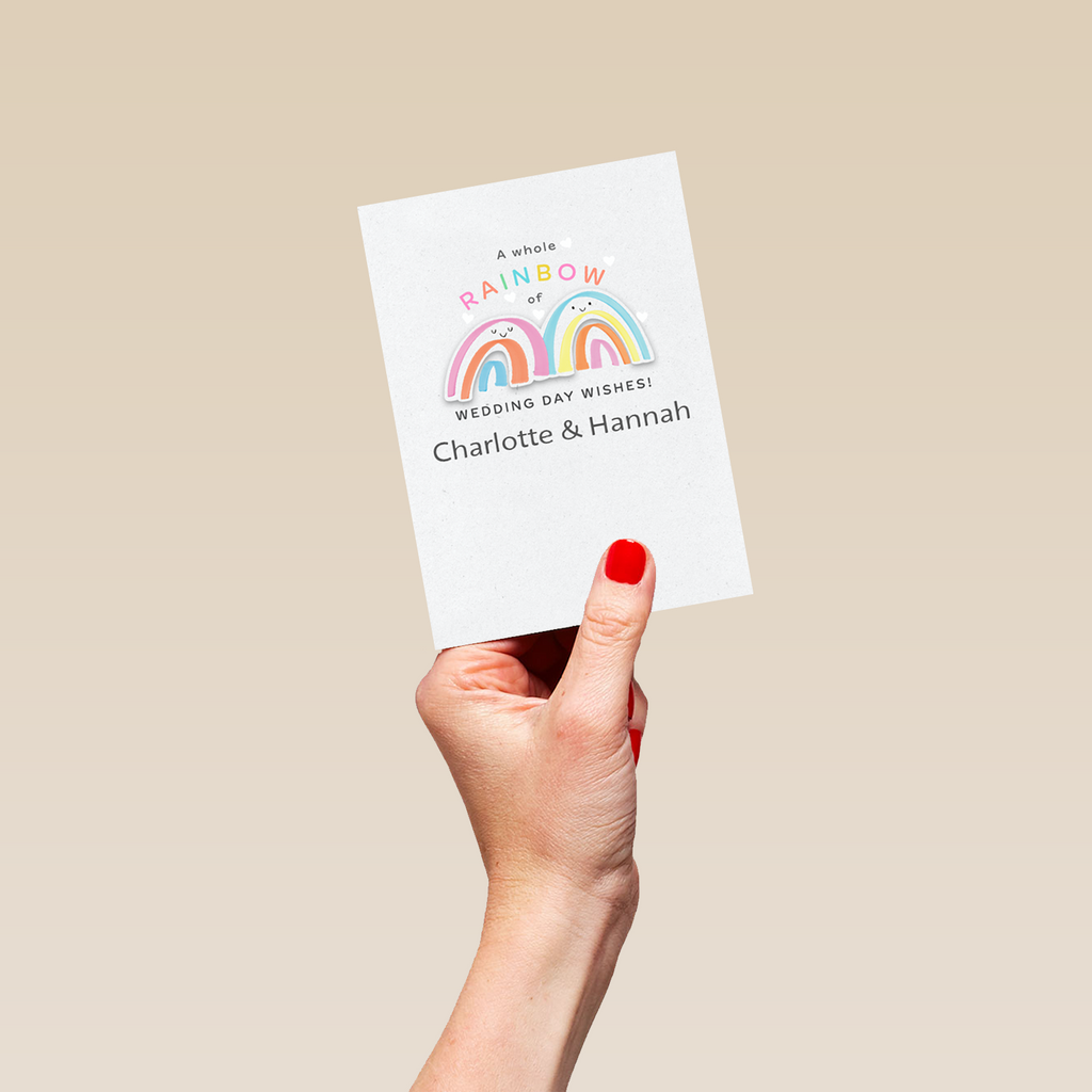 Show them you care with a personalised editable rainbow wedding congratulations card from Hallmark. Our wedding cards are printed on premium quality, FSC®-certified card & delivered nationwide. This card is available as standard 12cm by 16.7cm and large 15.5cm by 21.6cm.