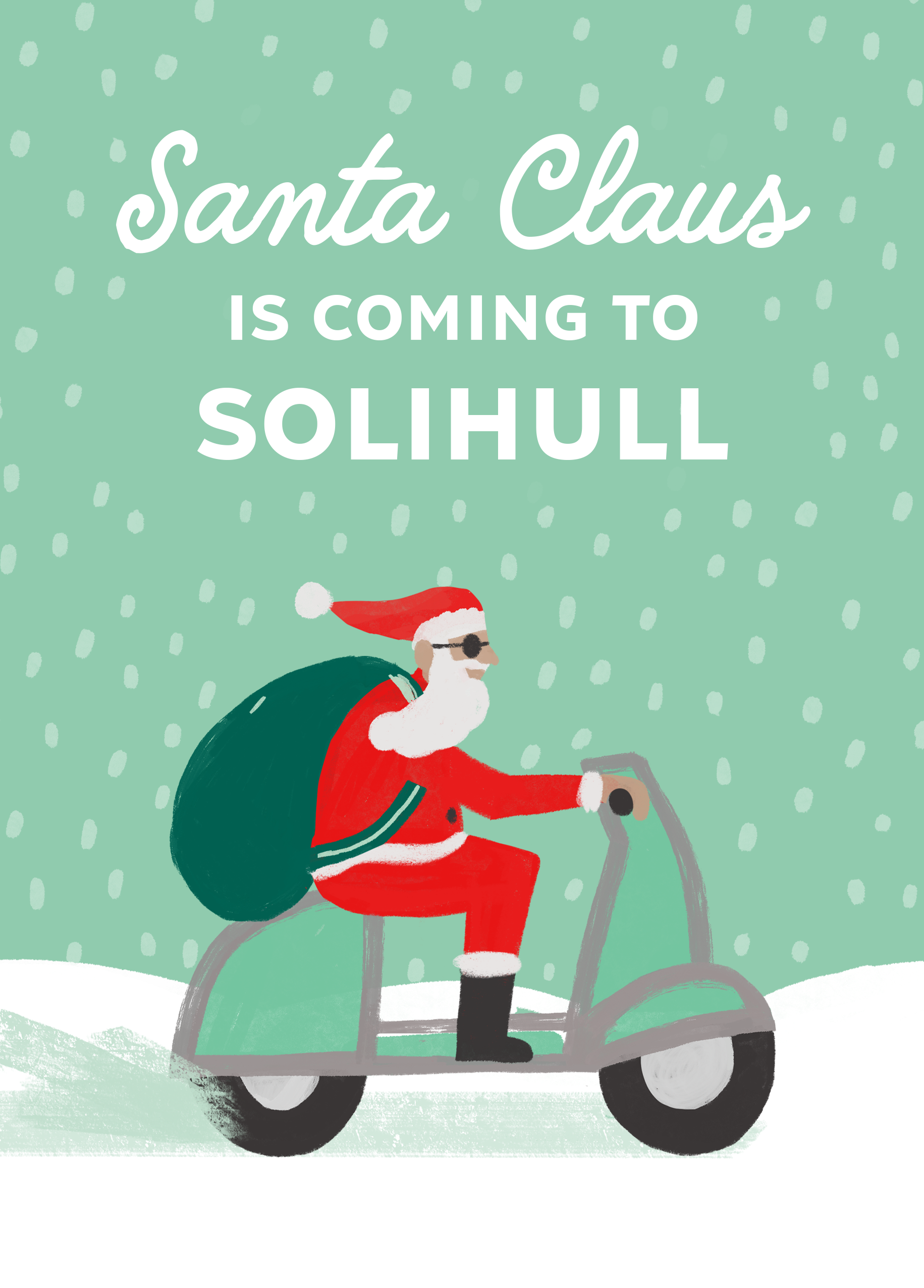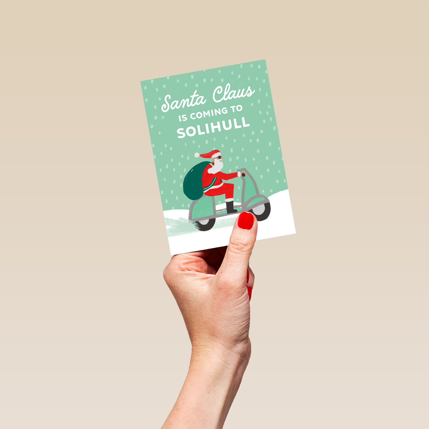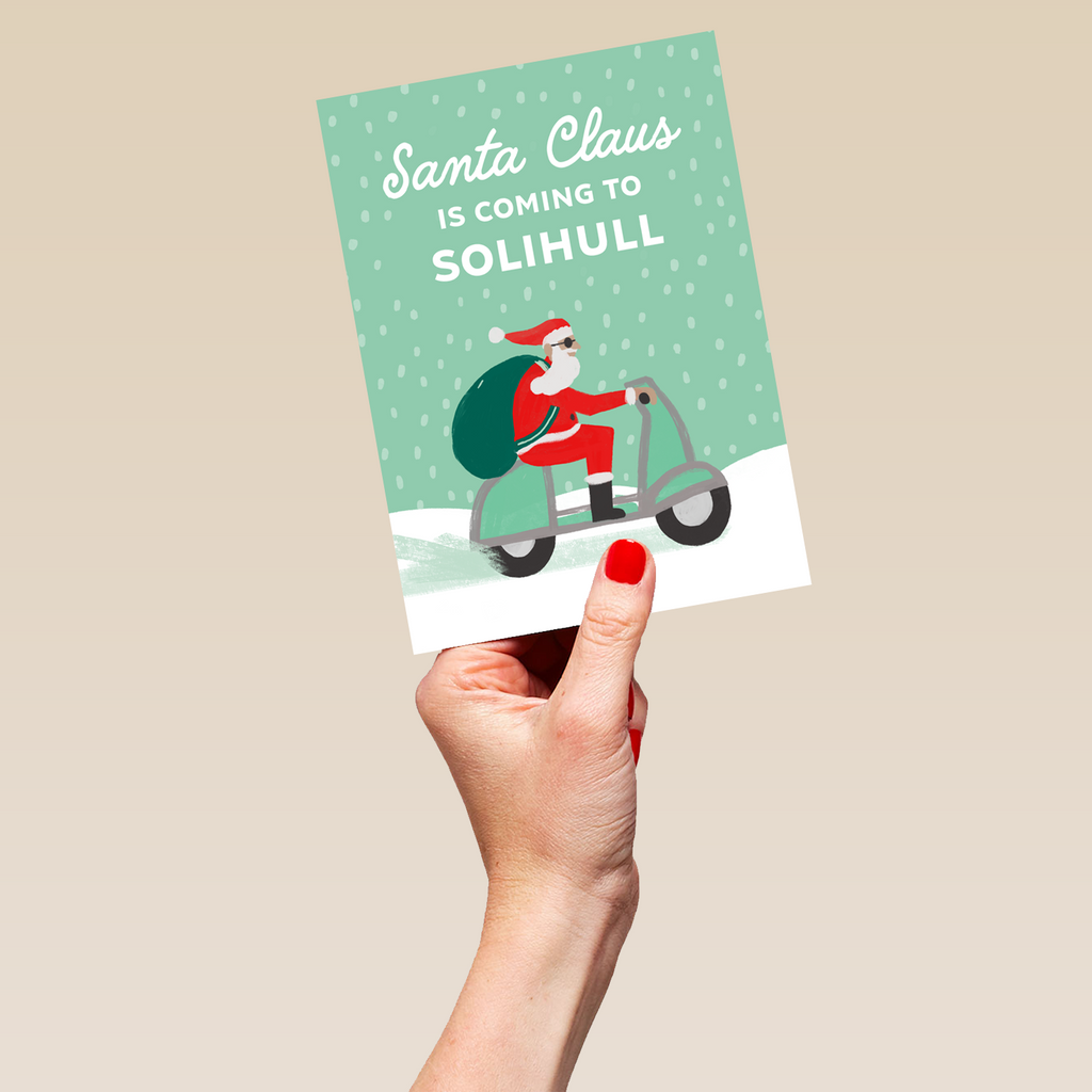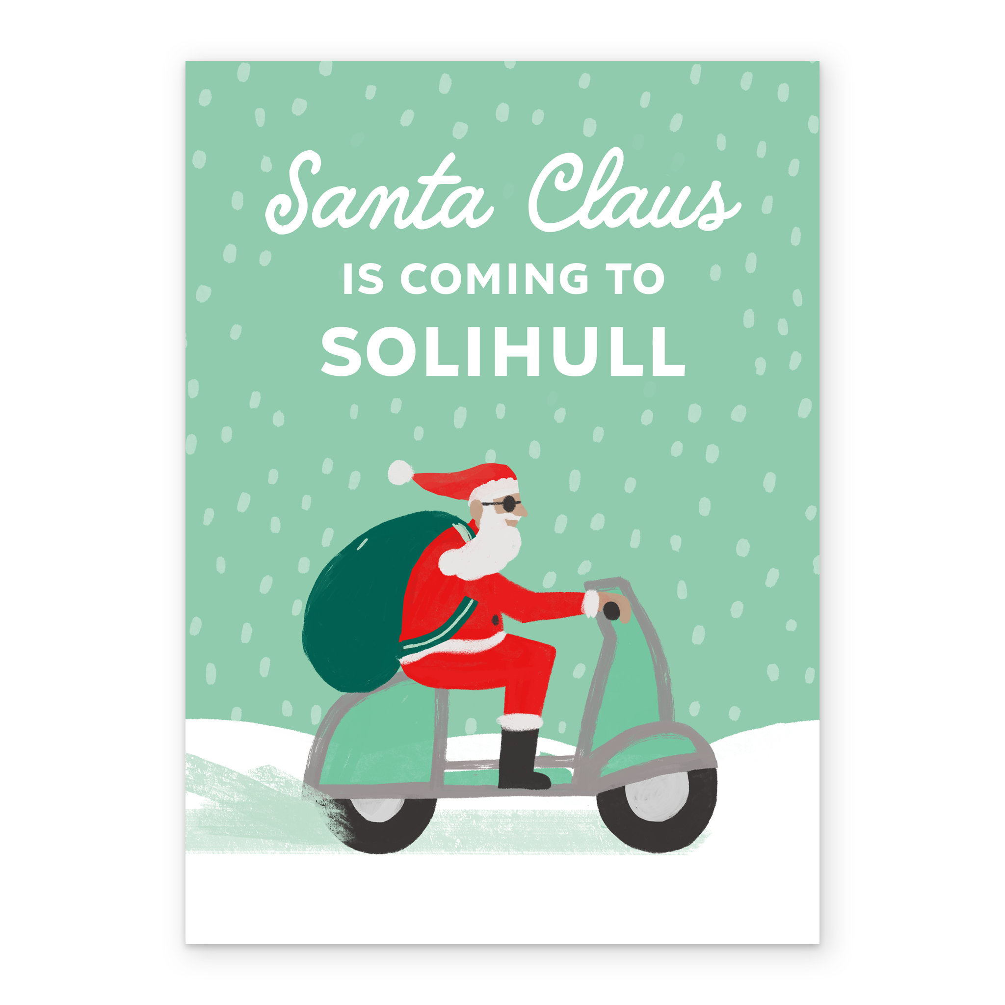 Printed on premium-quality board, this card features an illustration of Santa on a Moped and his sack full of presents on his back, with the message 'Santa Claus is coming to [Place Name]', space to personalise your message, and comes complete with a co-ordinating white envelope.