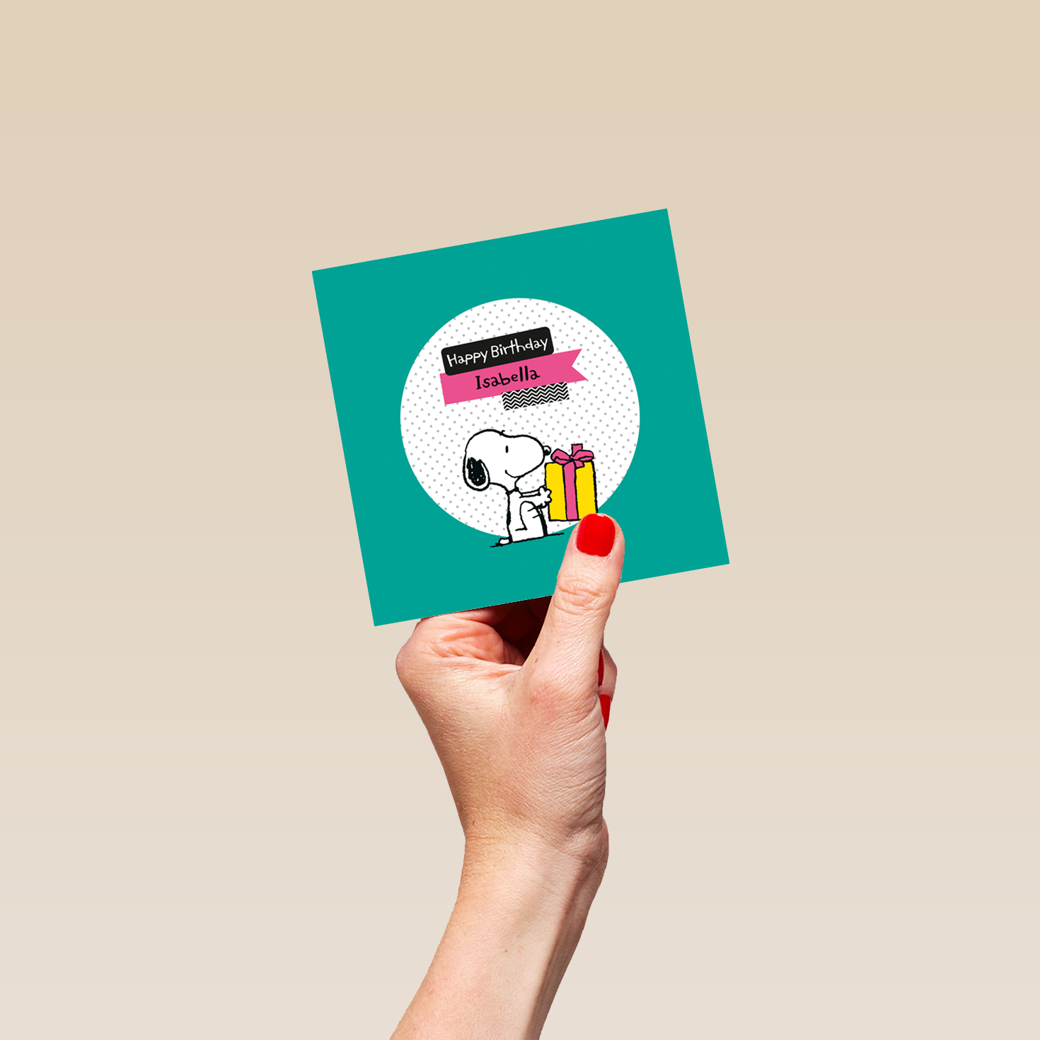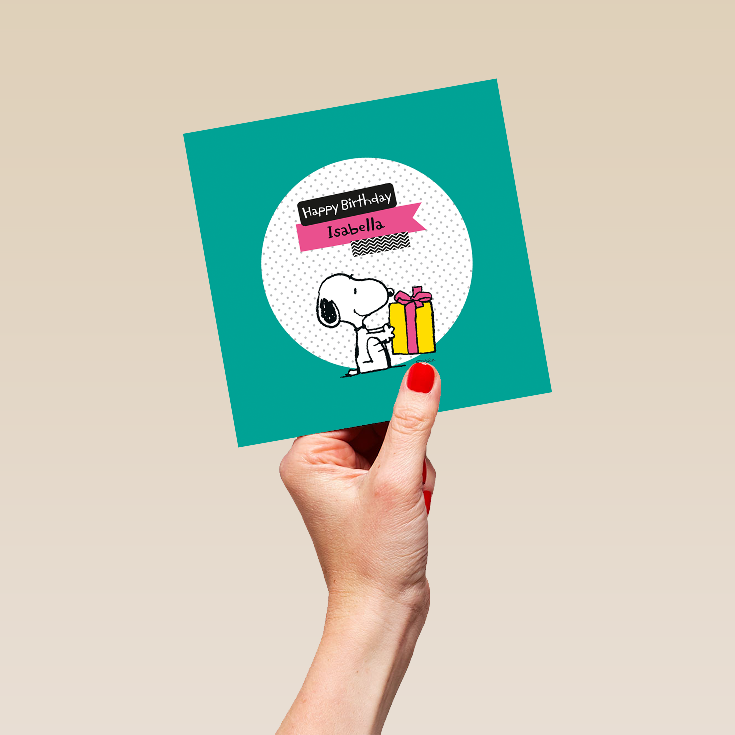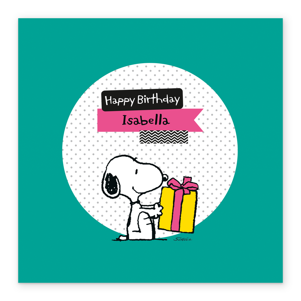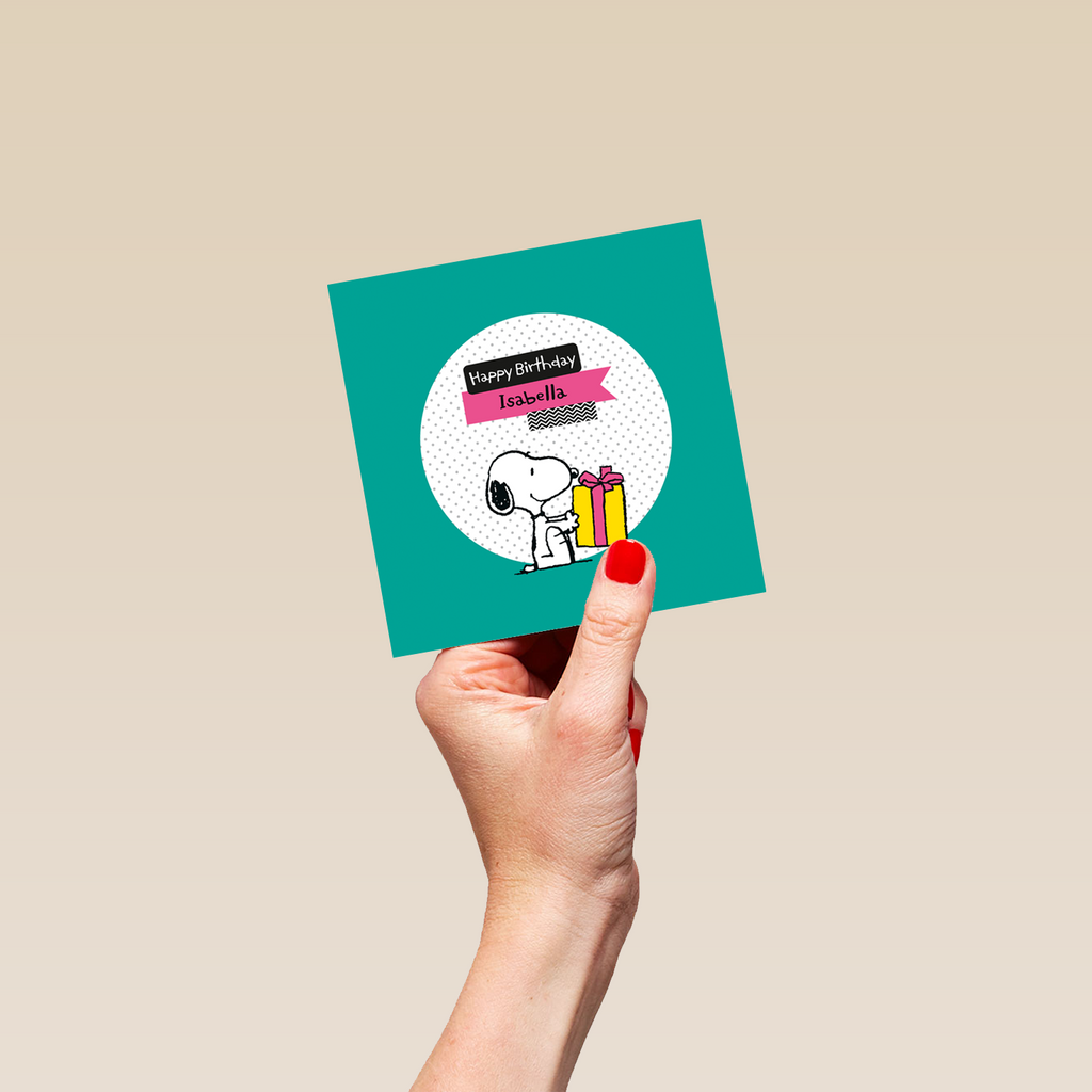 Printed on premium-quality board, this card features PEANUTS' SNOOPY with a present, with the message 'Happy Birthday', space to personalise a name, and comes complete with a co-ordinating white envelope.