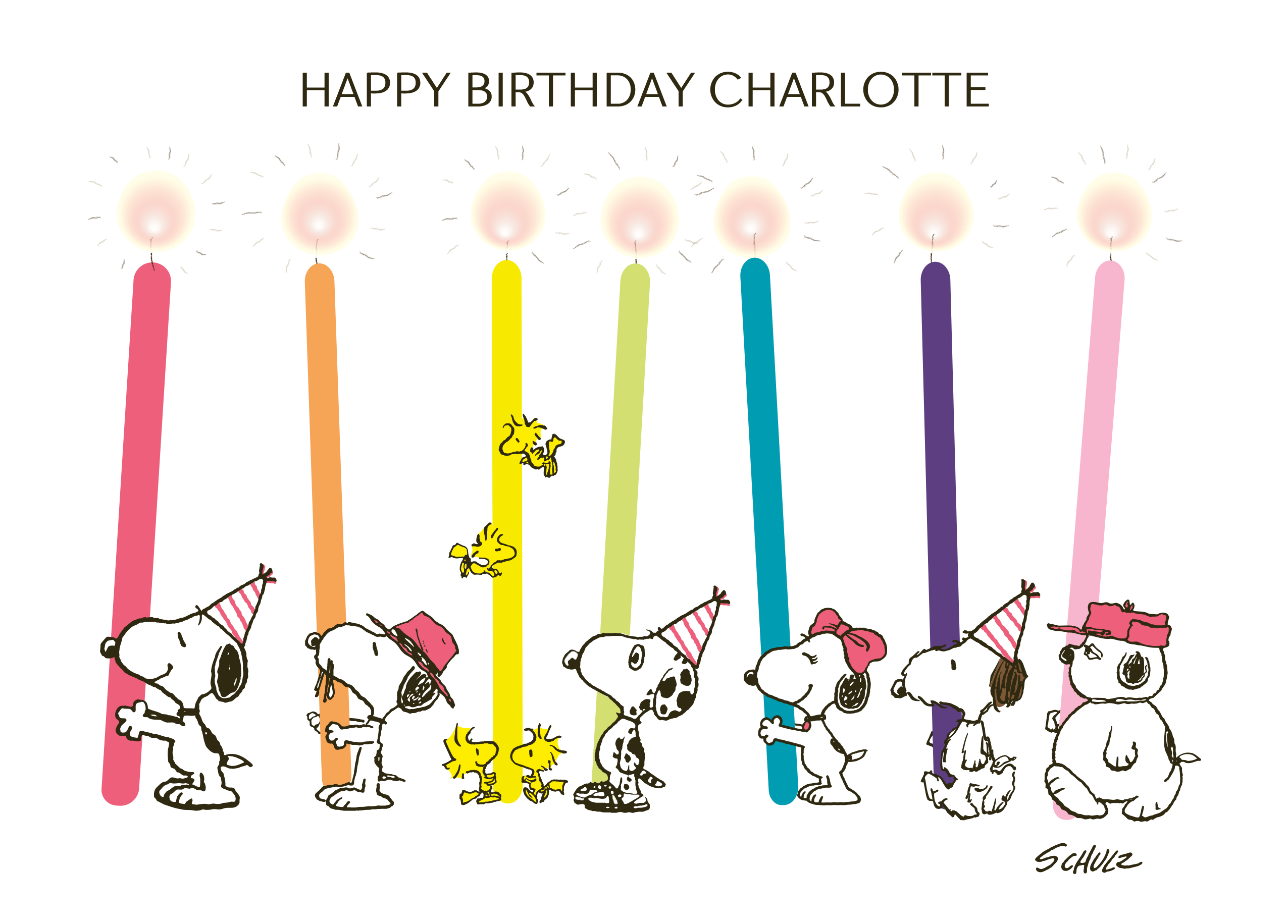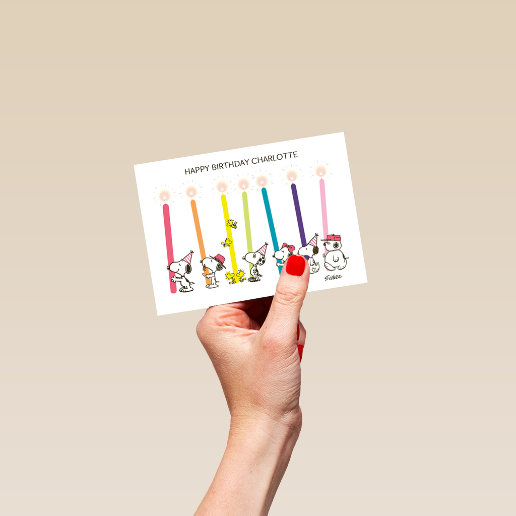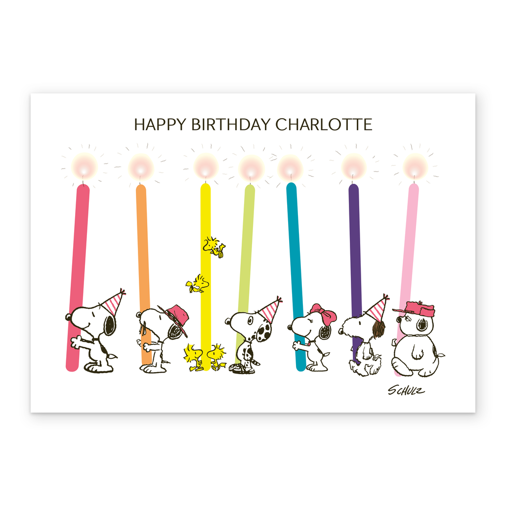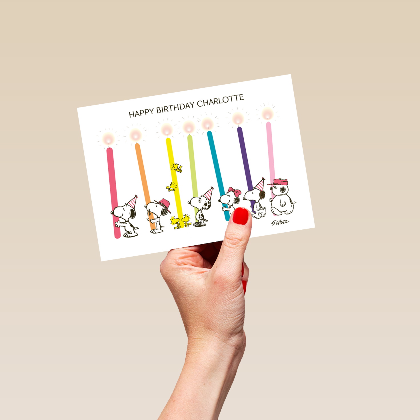 Printed on premium-quality board, this card features PEANUTS' SNOOPY and his beagle siblings with a collection of colourful birthday candles, with the message 'Happy Birthday', space to personalise a name, and comes complete with a co-ordinating white envelope.