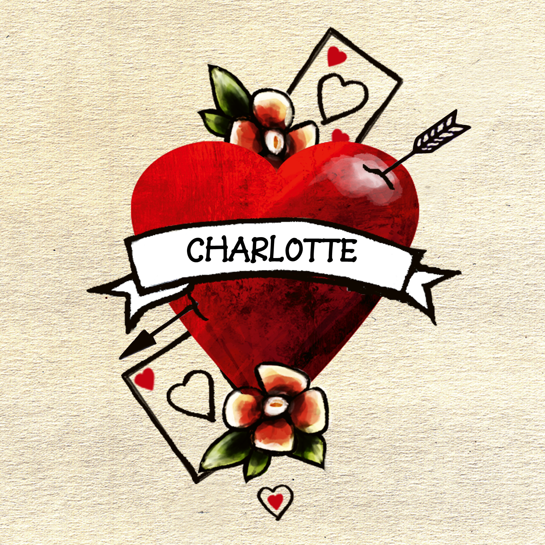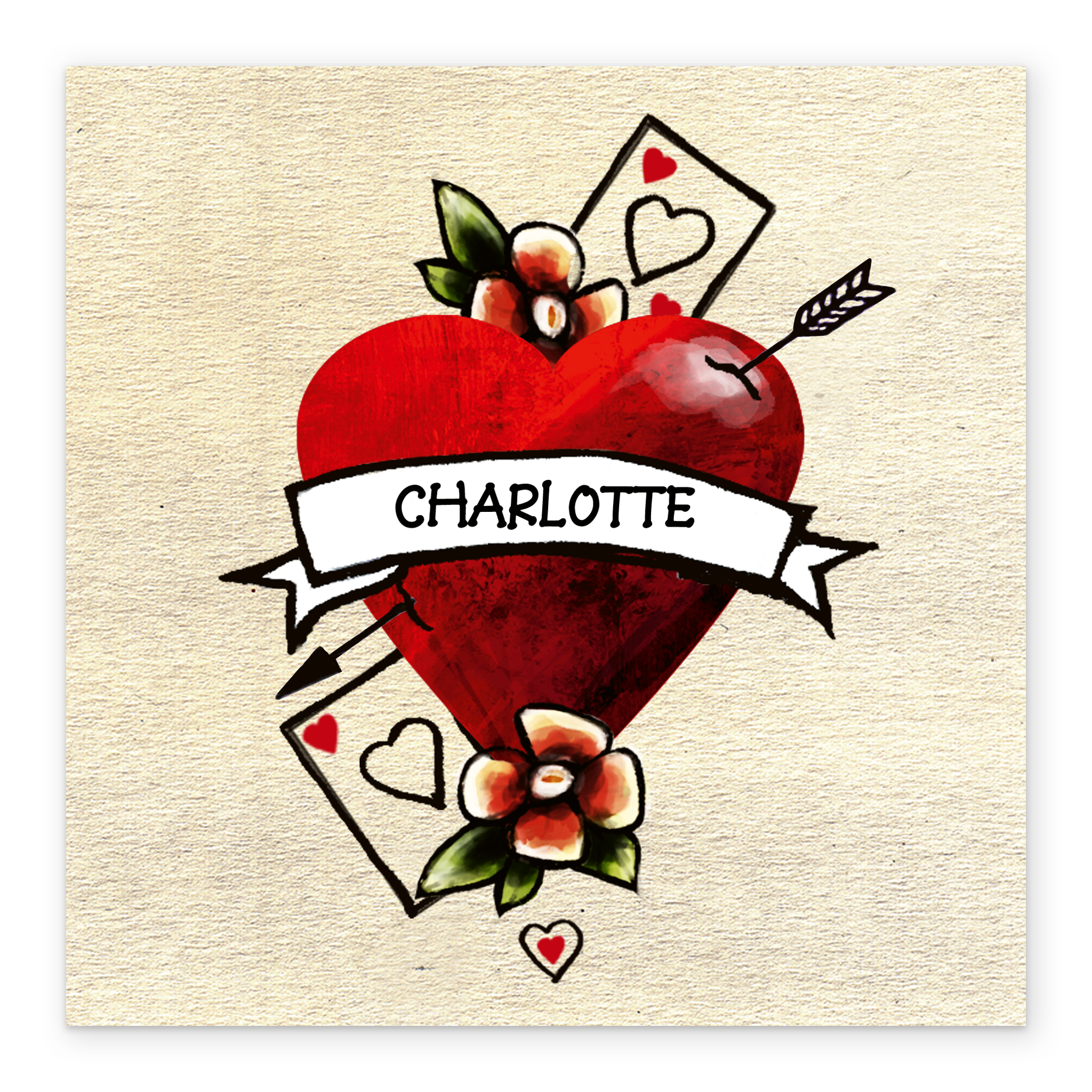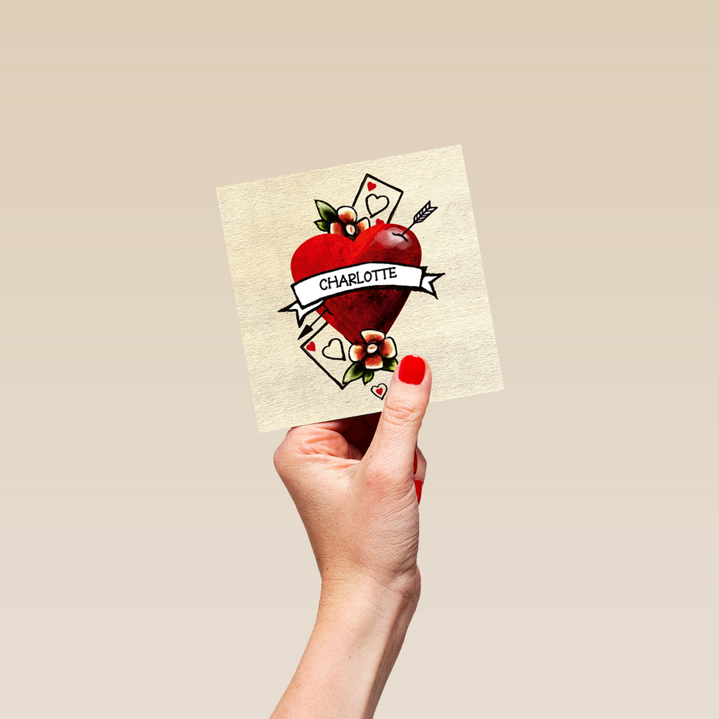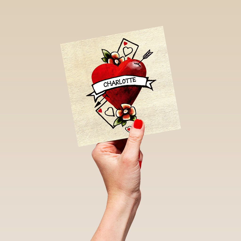 Printed on premium-quality board, this card features a tattoo styled illustration of a heart with a banner, flowers, hearts playing cards and an arrow, space to personalise a name, and comes complete with a co-ordinating white envelope.