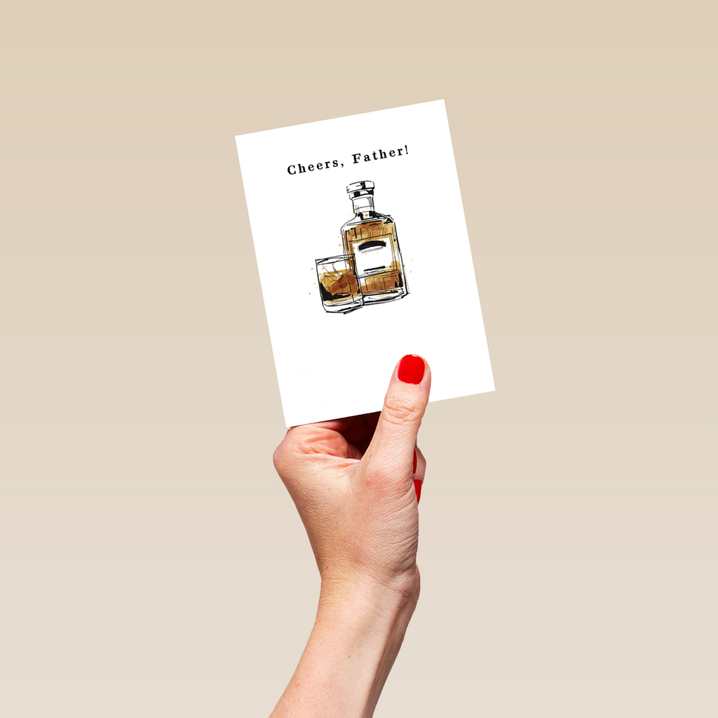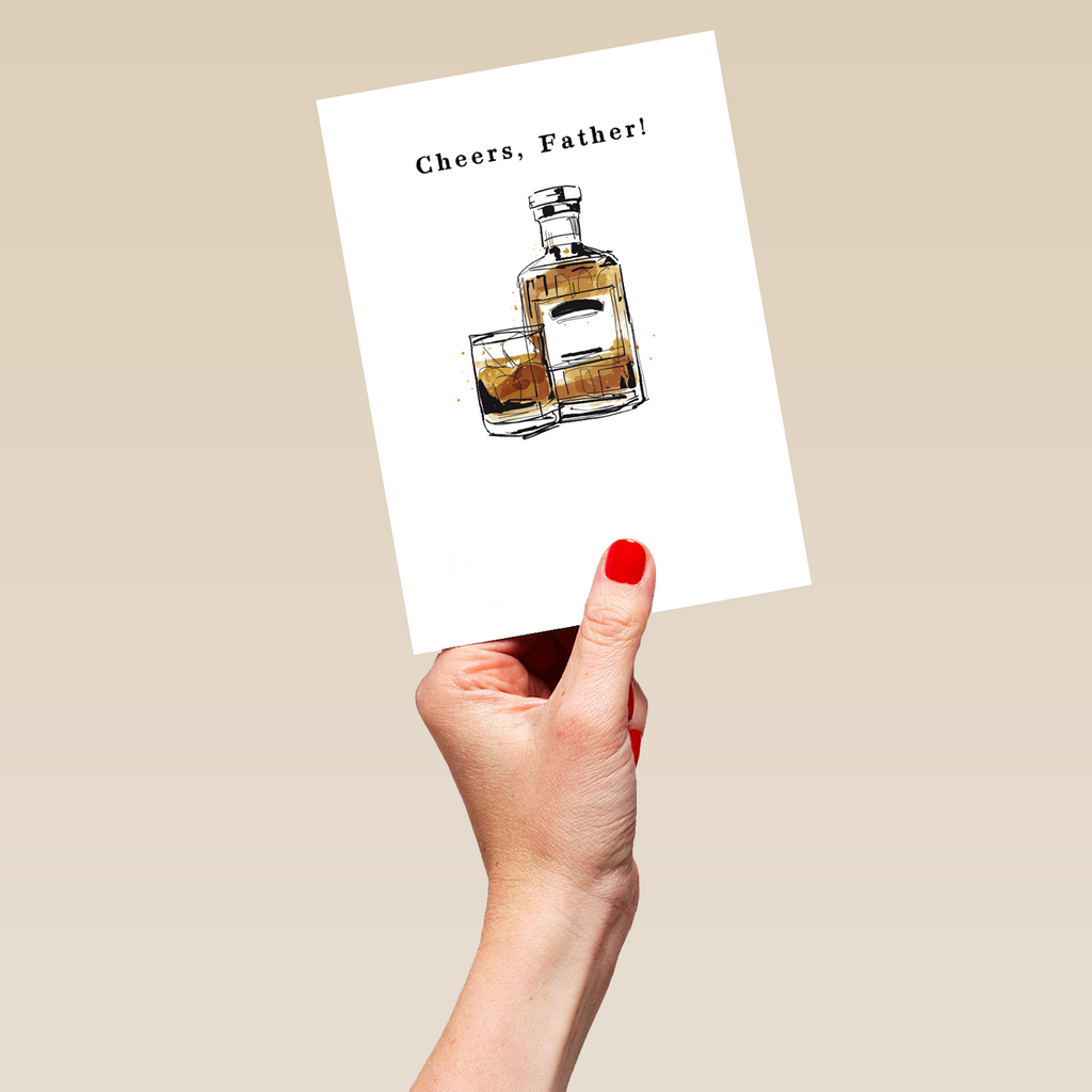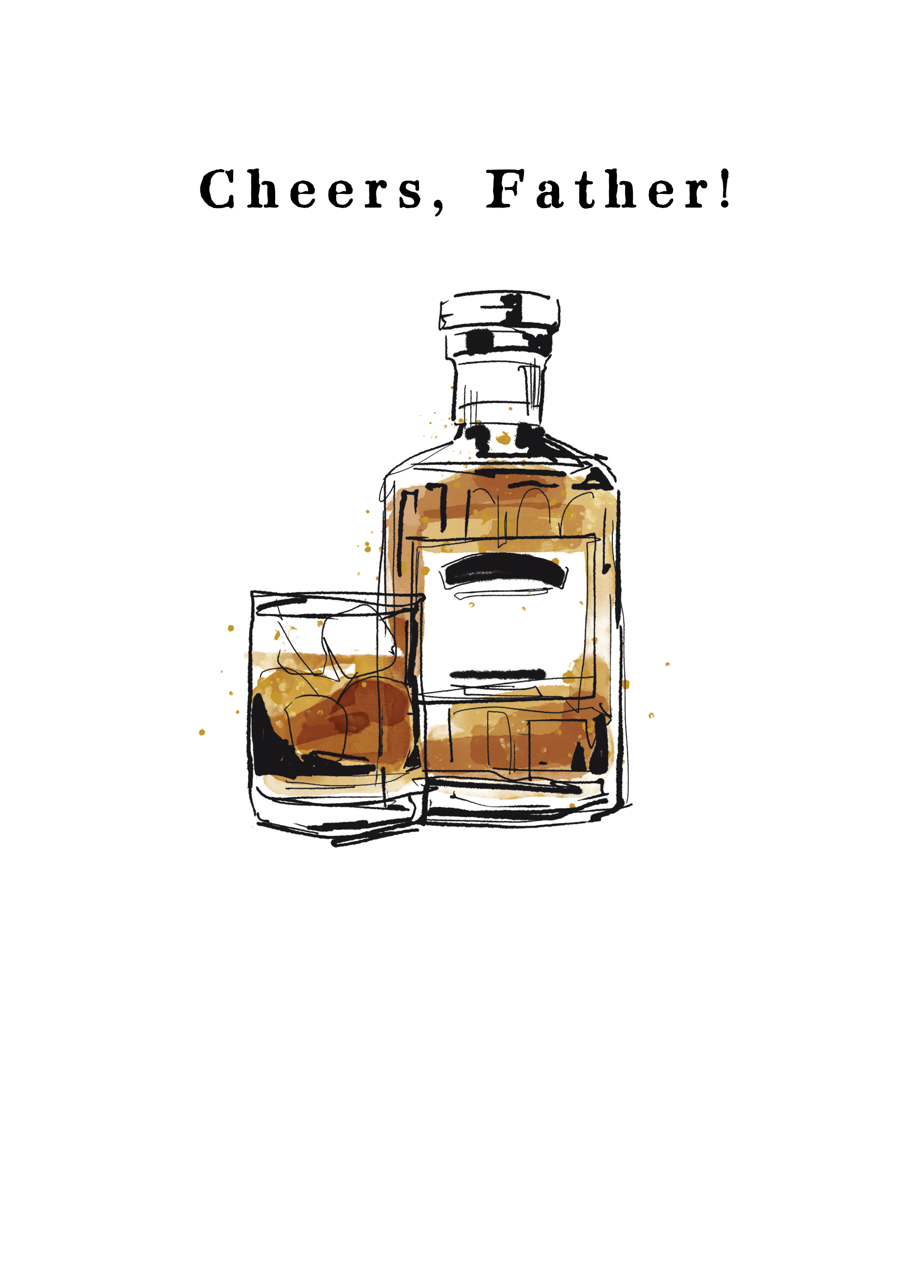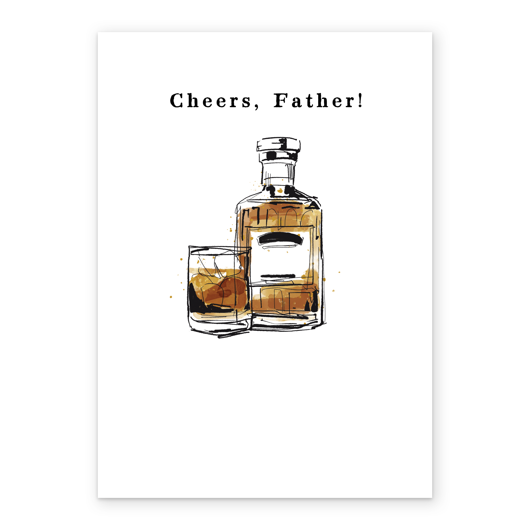 Printed on premium-quality board, this card features a whisky bottle and glass, with the message 'Cheers, Father!', space to personalise your message, and comes complete with a co-ordinating white envelope.