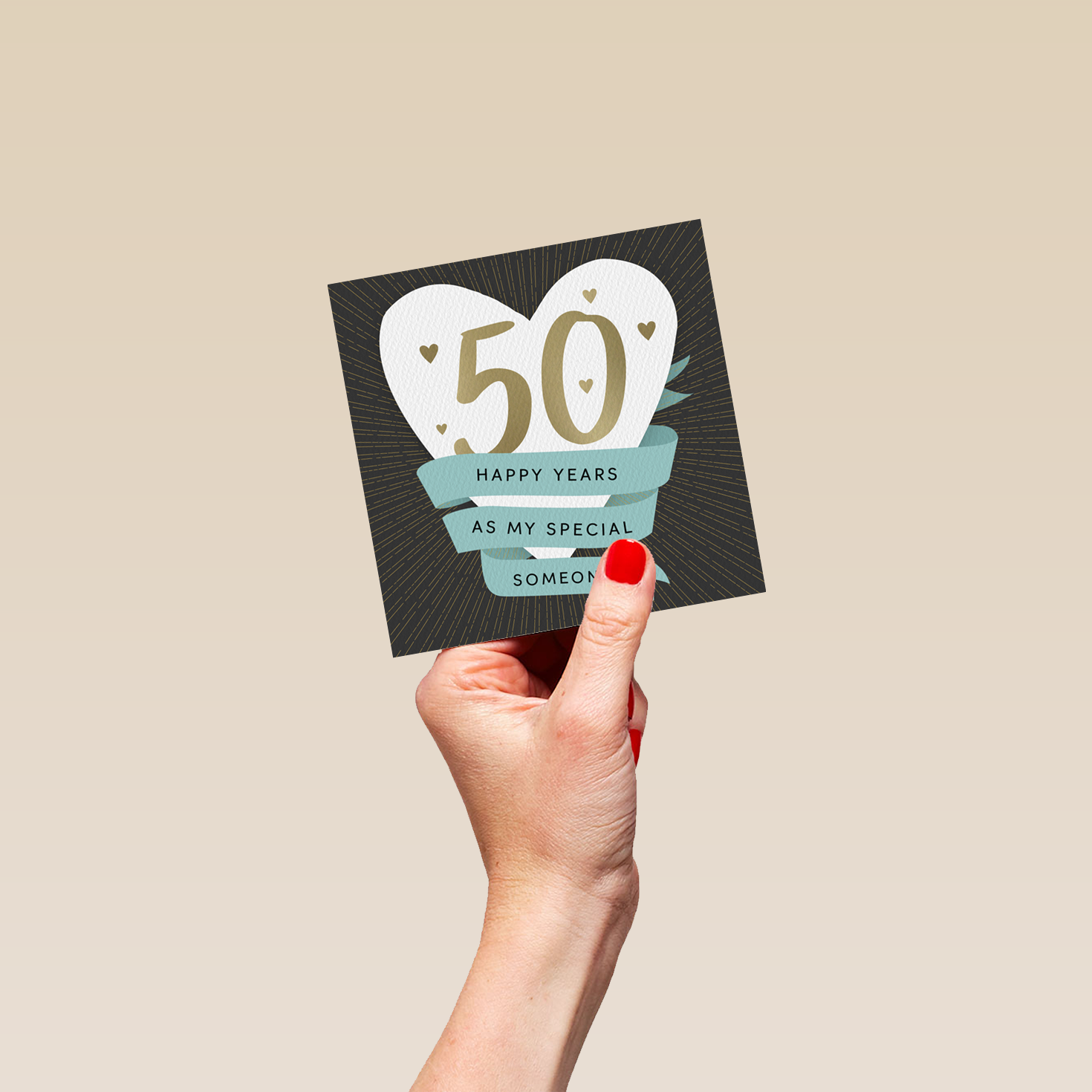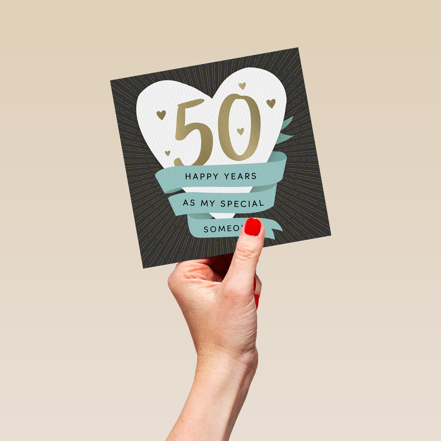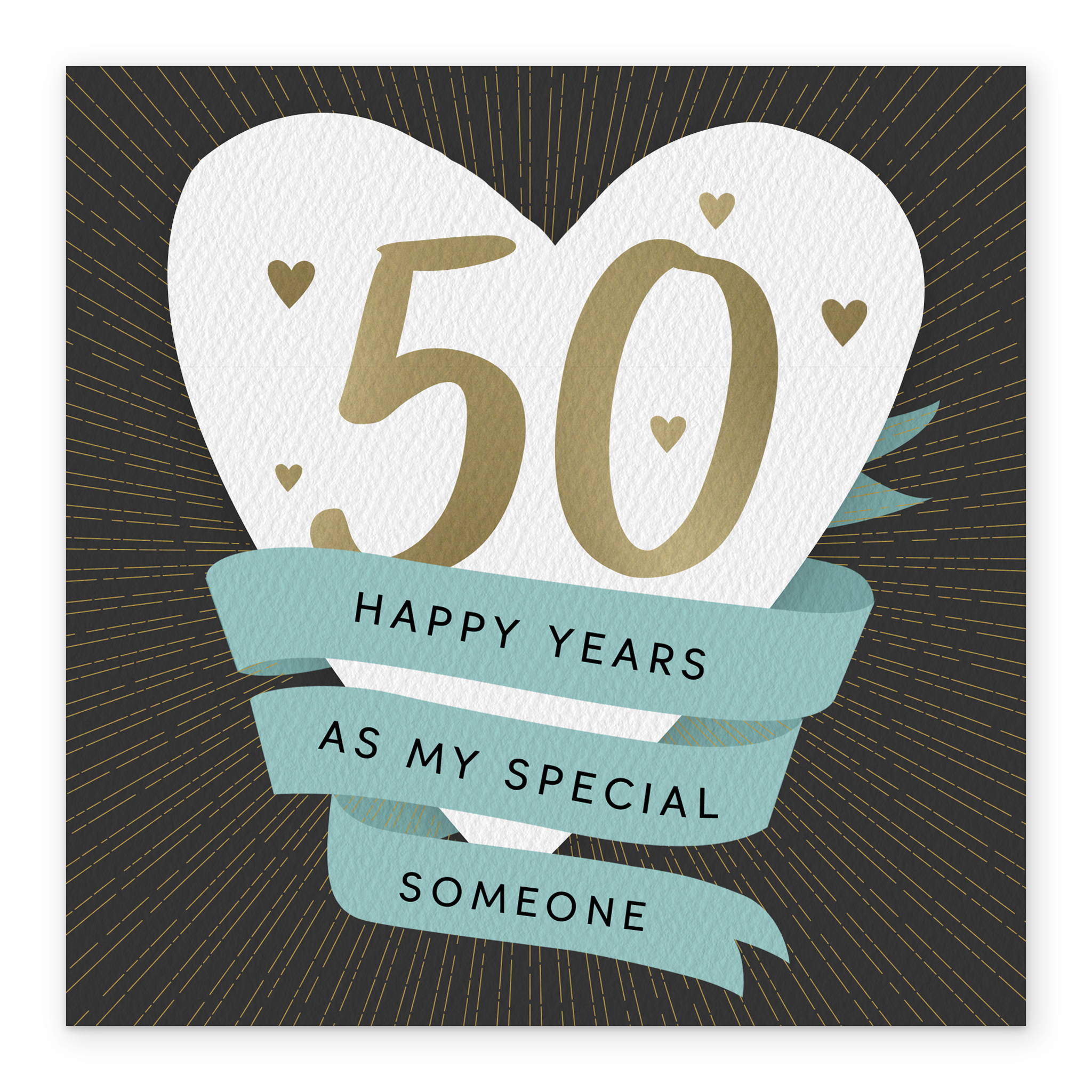 Printed on premium-quality board, this card features a white love heart with banner flag design, with the message '50 Happy Years As My Special Someone', space to personalise a name, and comes complete with a co-ordinating white envelope.