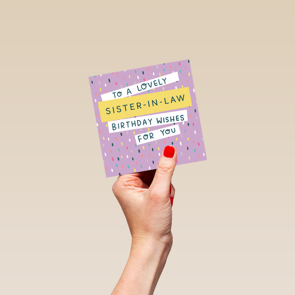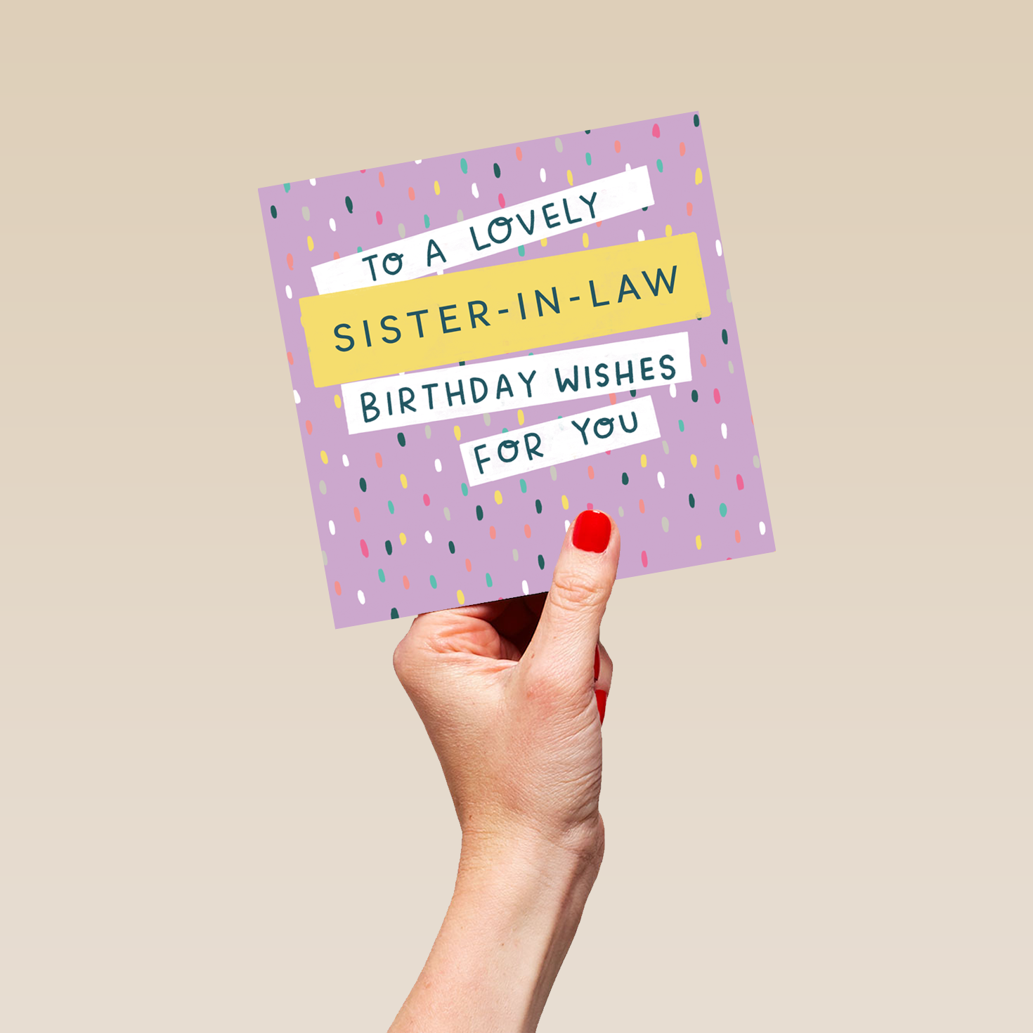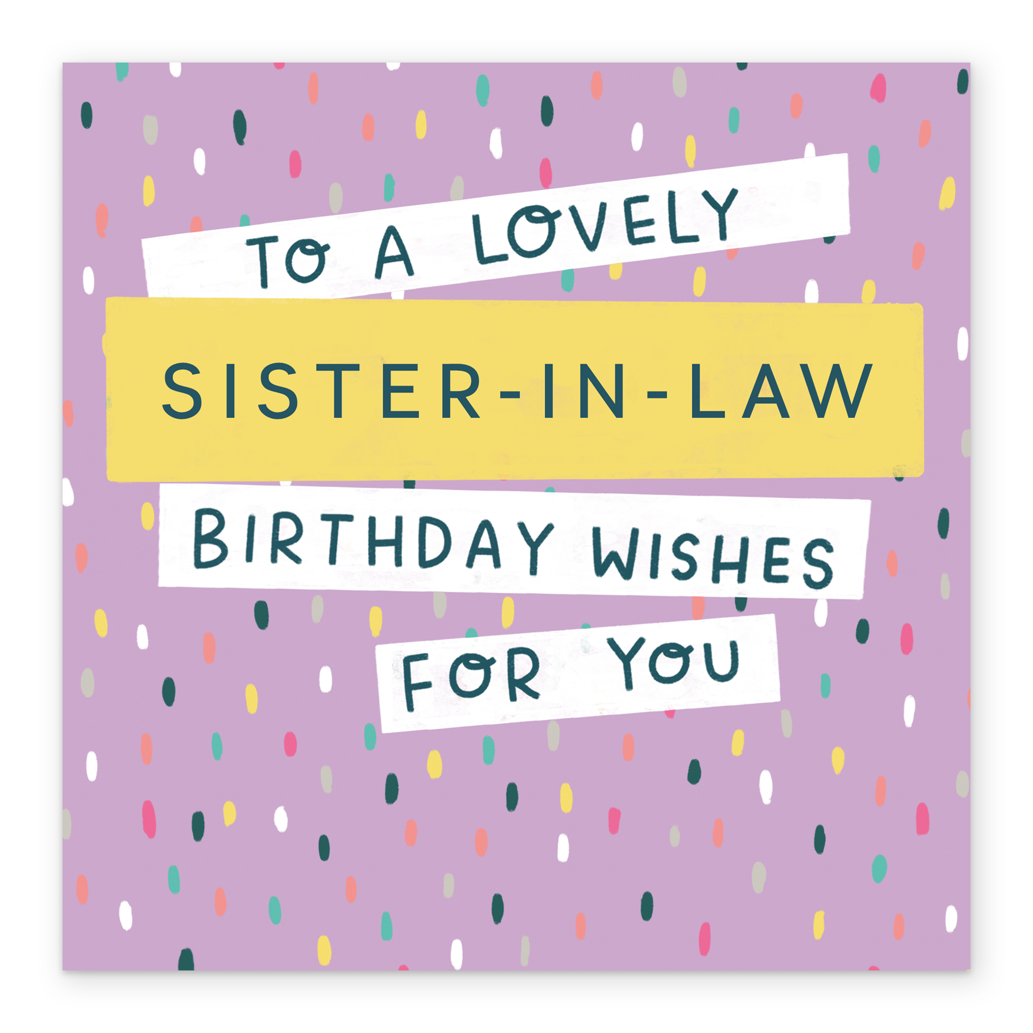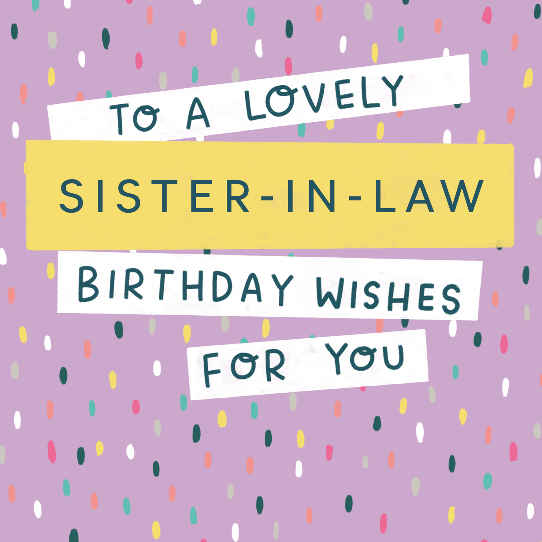 Printed on premium-quality board, this card features bright text blocks on a confetti patterned lilac background, with the message 'To A Lovely Sister-In-Law, Birthday Wishes For You', space to personalise your message, and comes complete with a co-ordinating white envelope.