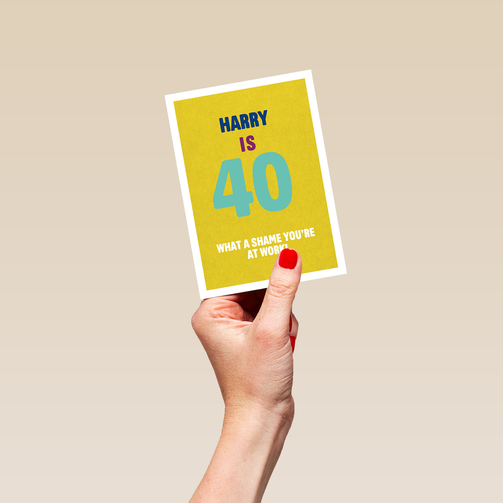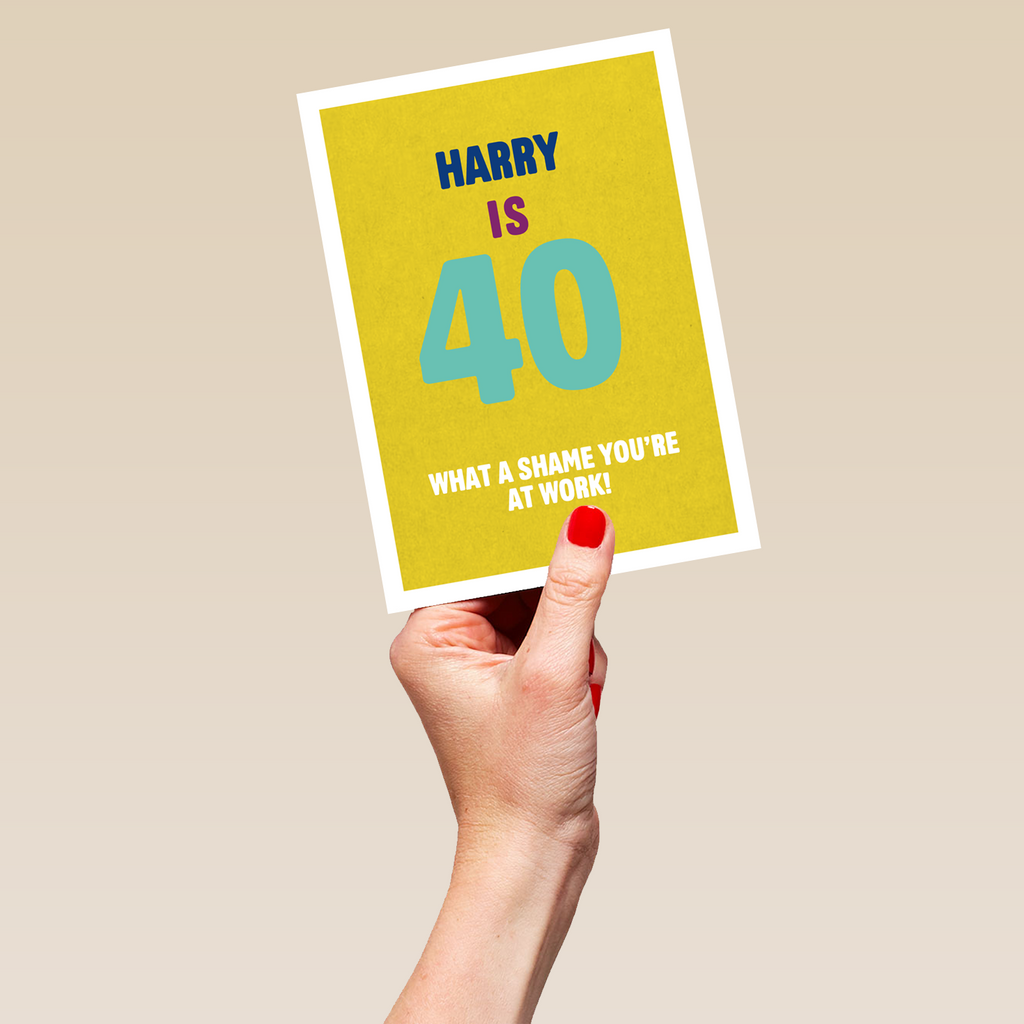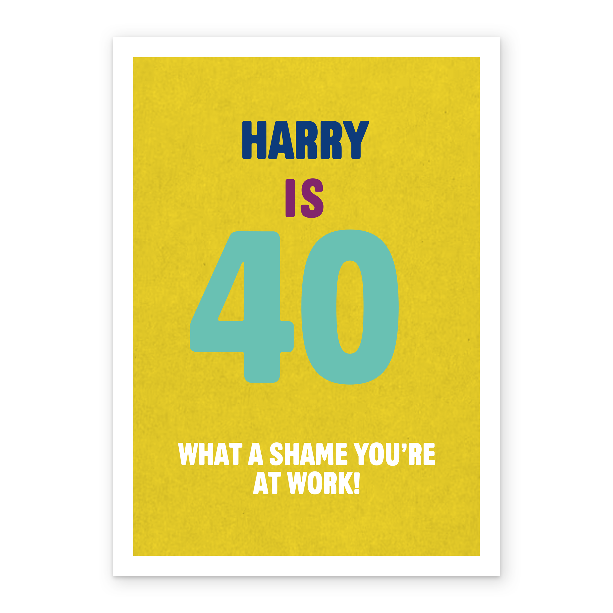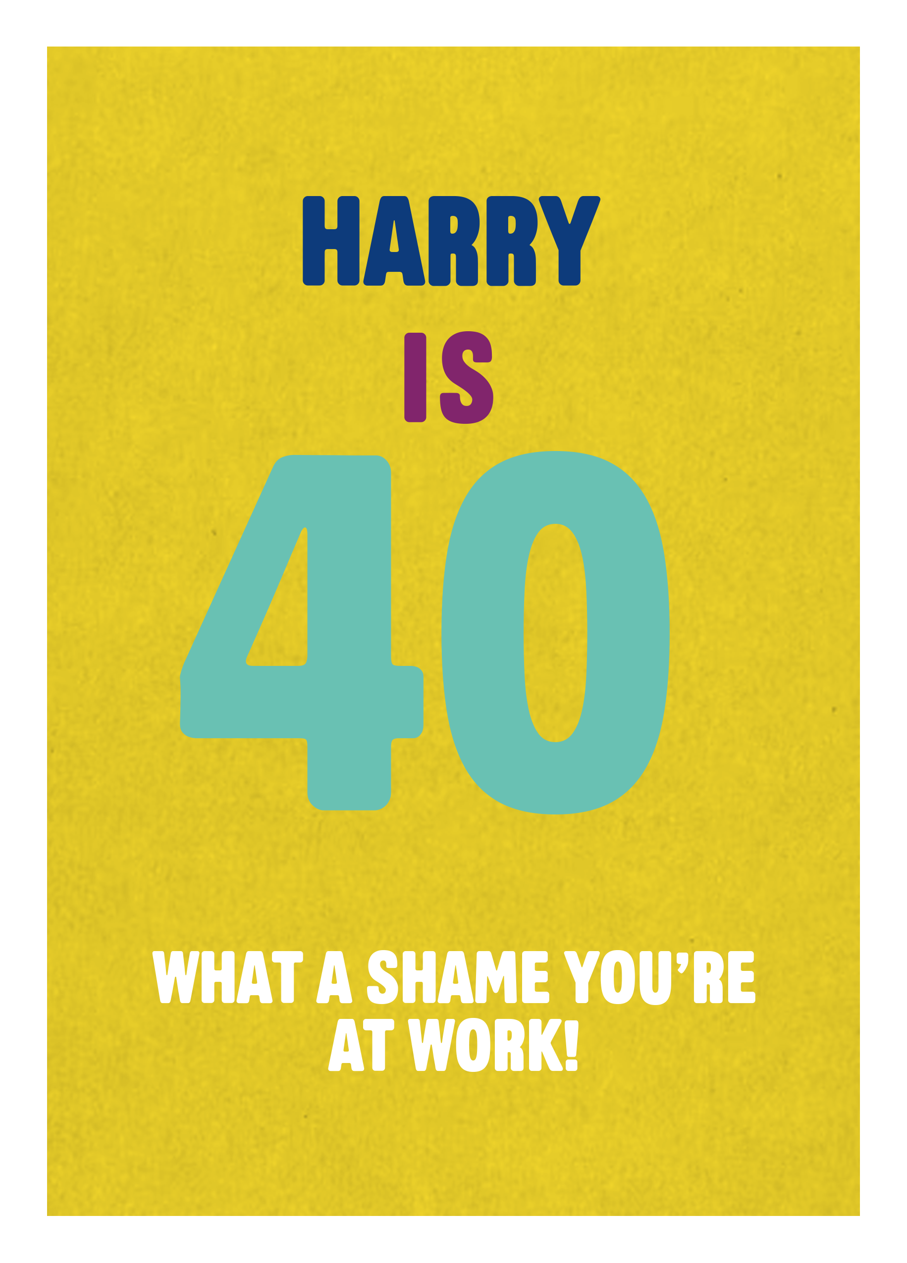 Printed on premium-quality board, this card features a funny and bold text based design with an editable age for a 30th, 40th, 50th (and more) milestone birthday, with the message '[Name] is [Age]. What a shame you're at work!', space to personalise your message, and comes complete with a co-ordinating white envelope.