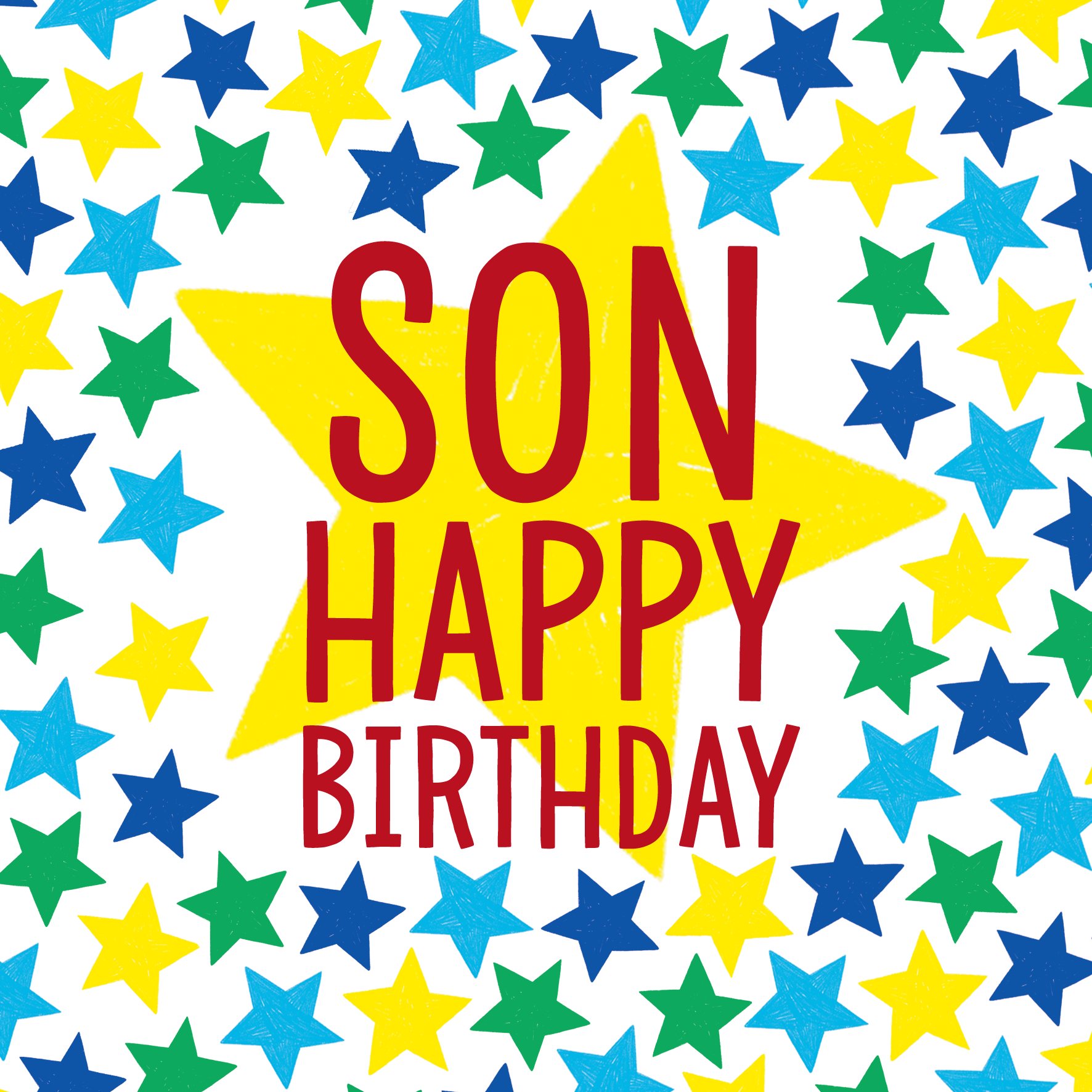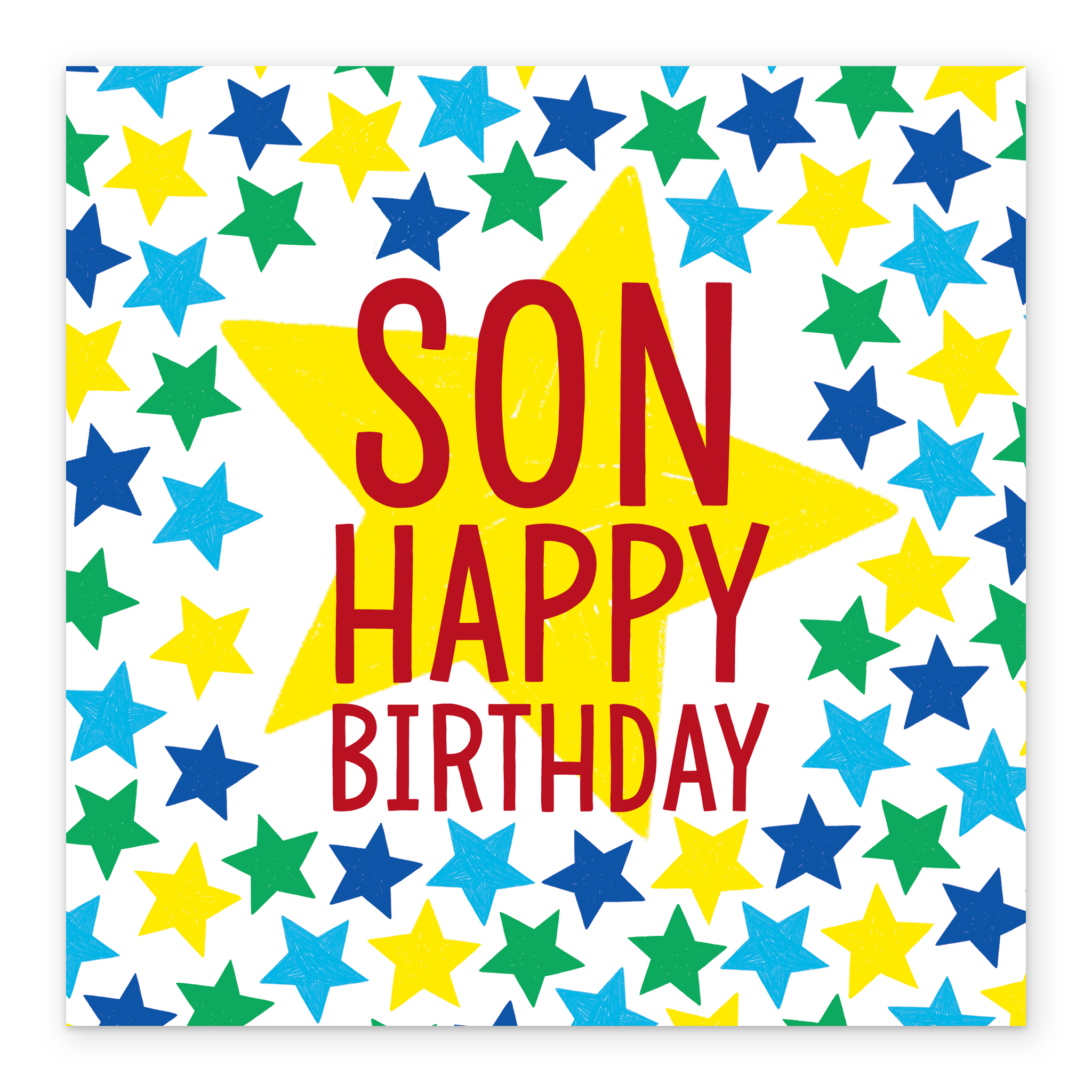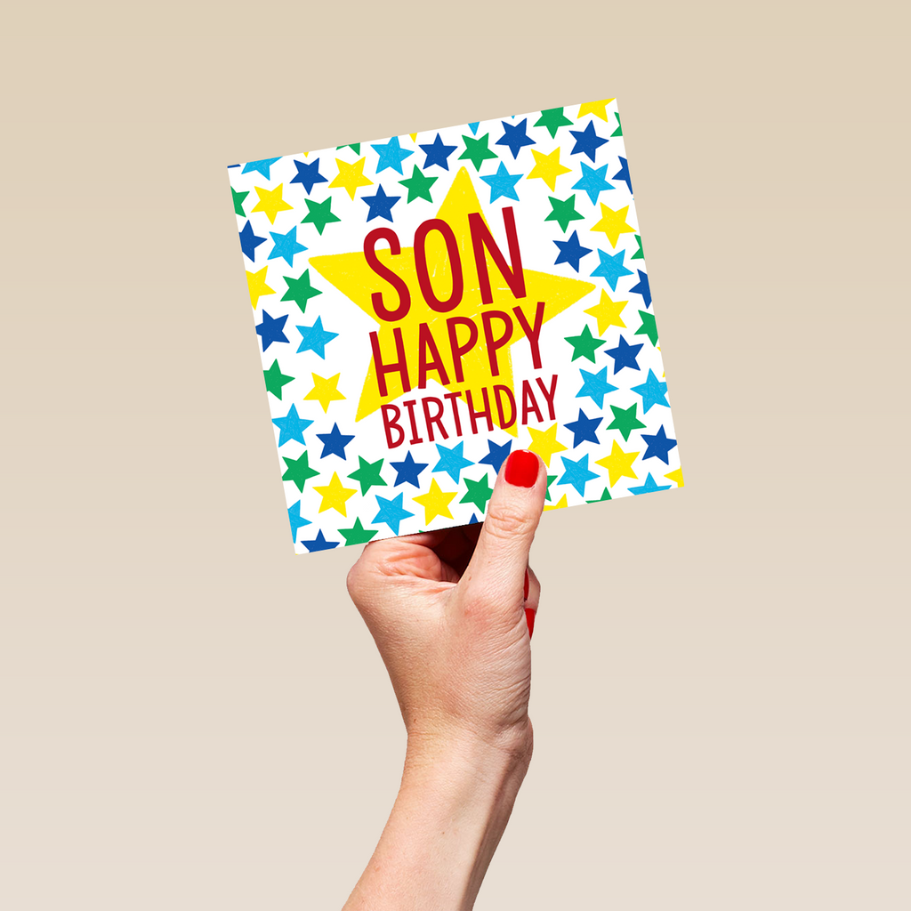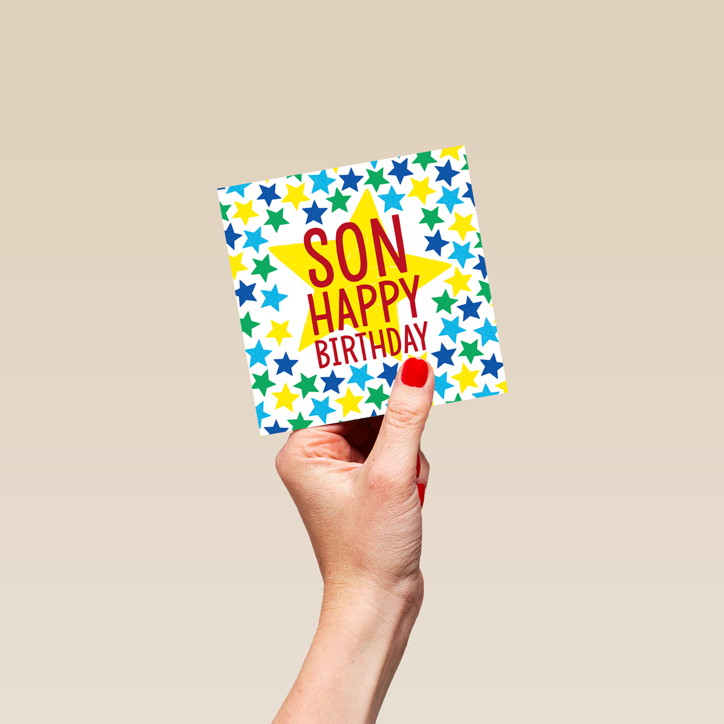 Printed on premium-quality board, this card features blue, green and yellow stars with a large yellow star in the centre, with the message '[NAME] Happy Birthday', space to personalise a name, and comes complete with a co-ordinating white envelope.