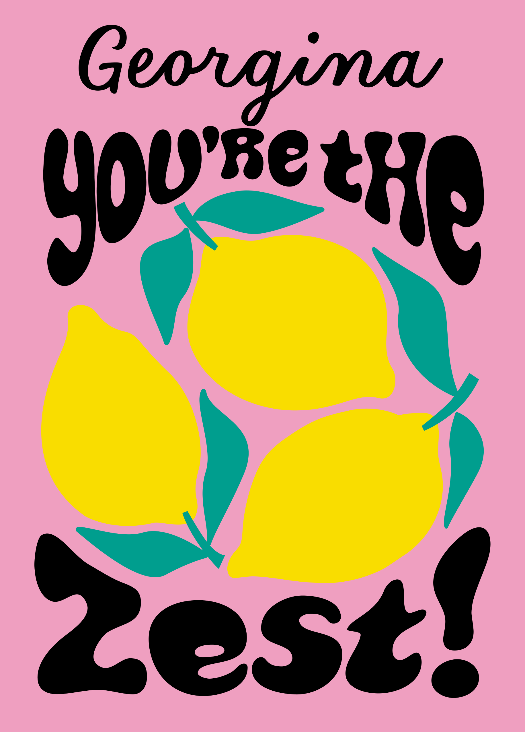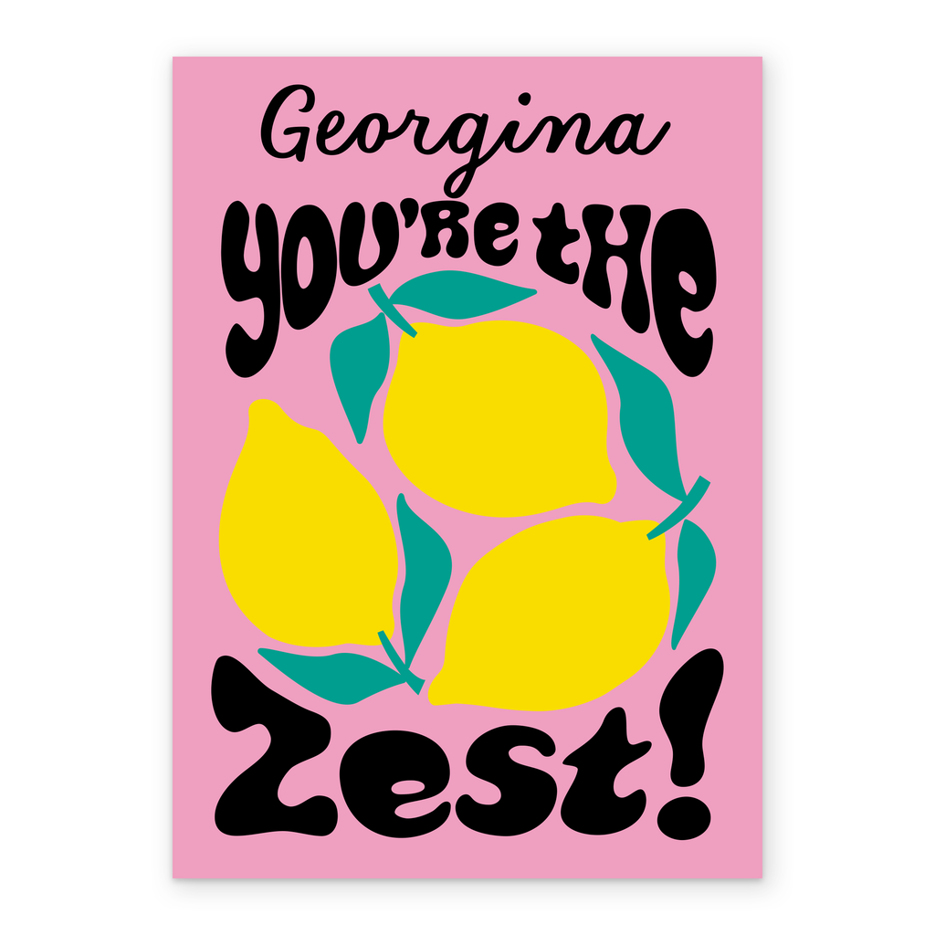 Printed on premium-quality board, this card features fun typography with an illustration of yellow lemons, with the message '[NAME] you're the zest!', and comes complete with a co-ordinating white envelope.