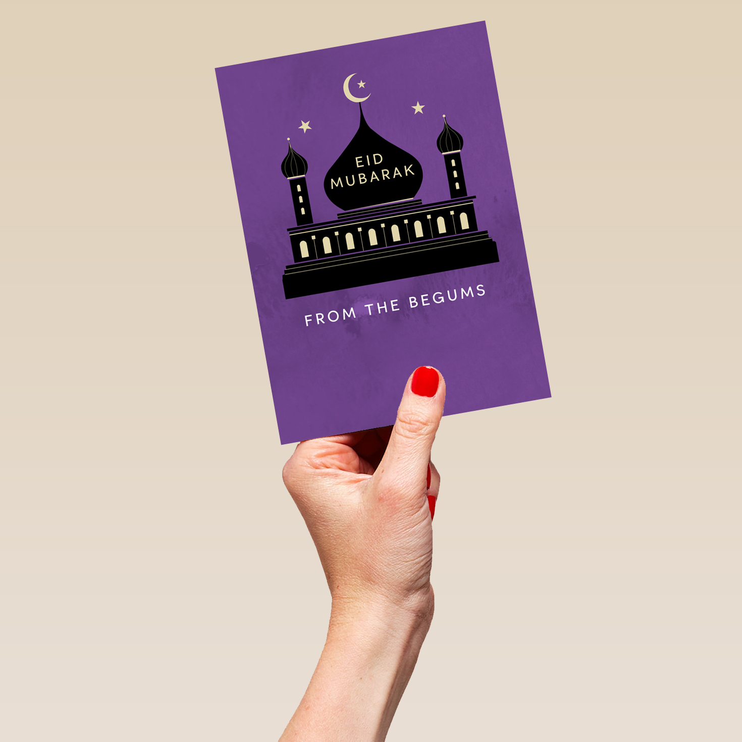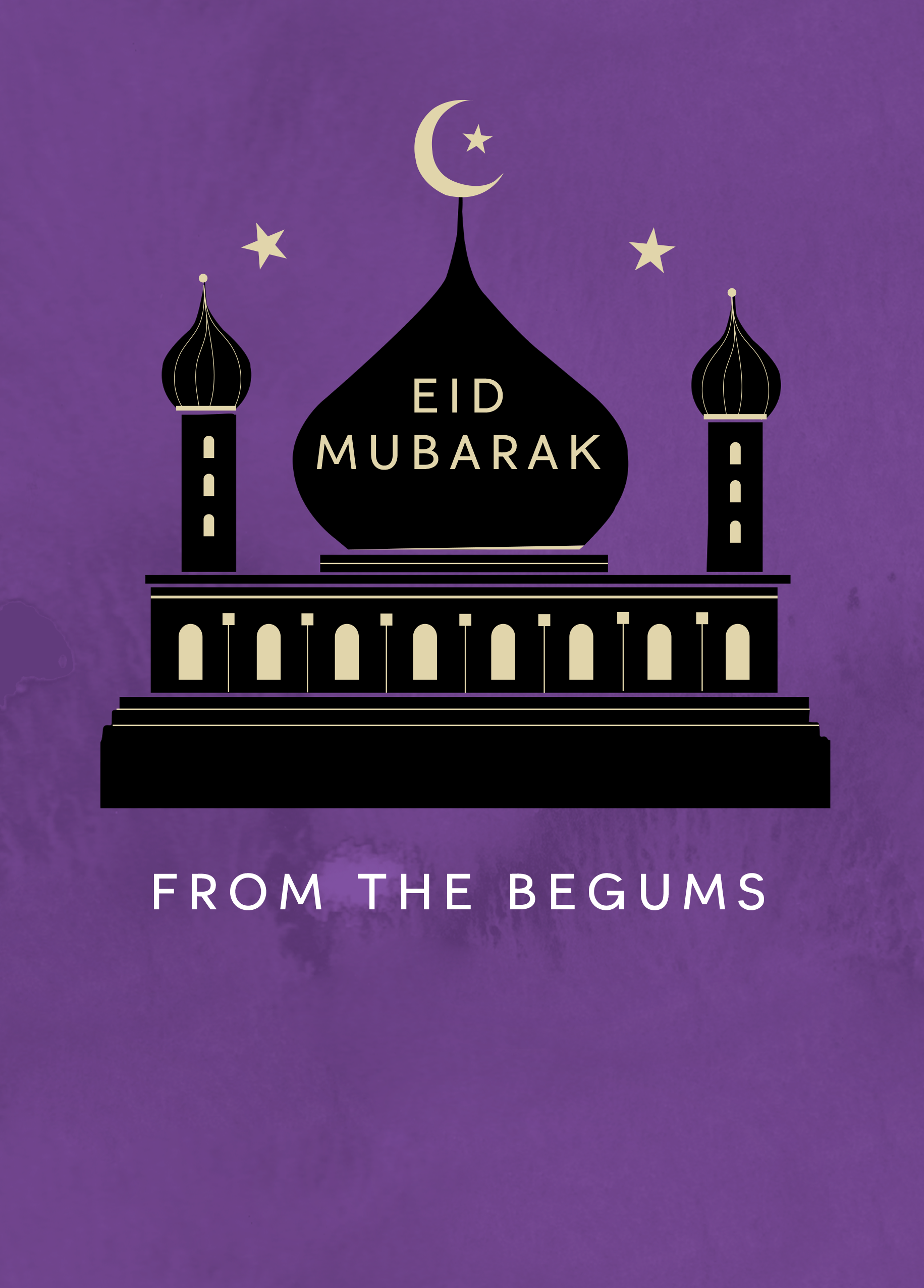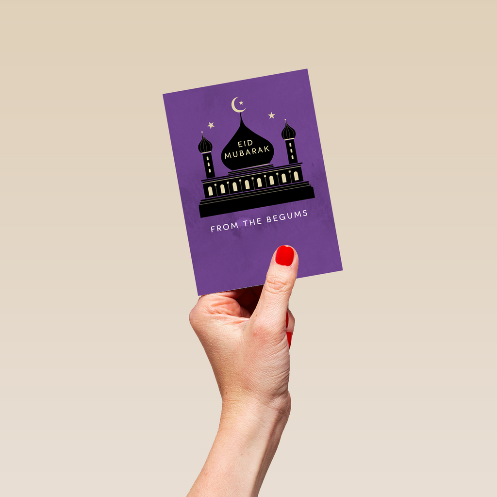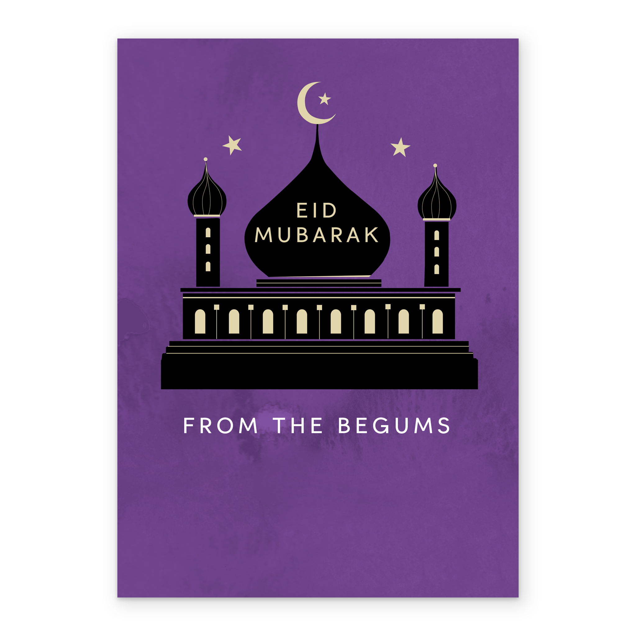 Printed on premium-quality board, this card features a silhouetted mosque radiating light through the windows with gold stars on a purple background, , with the message 'Eid Mubarak', space to personalise your message, and comes complete with a co-ordinating white envelope.