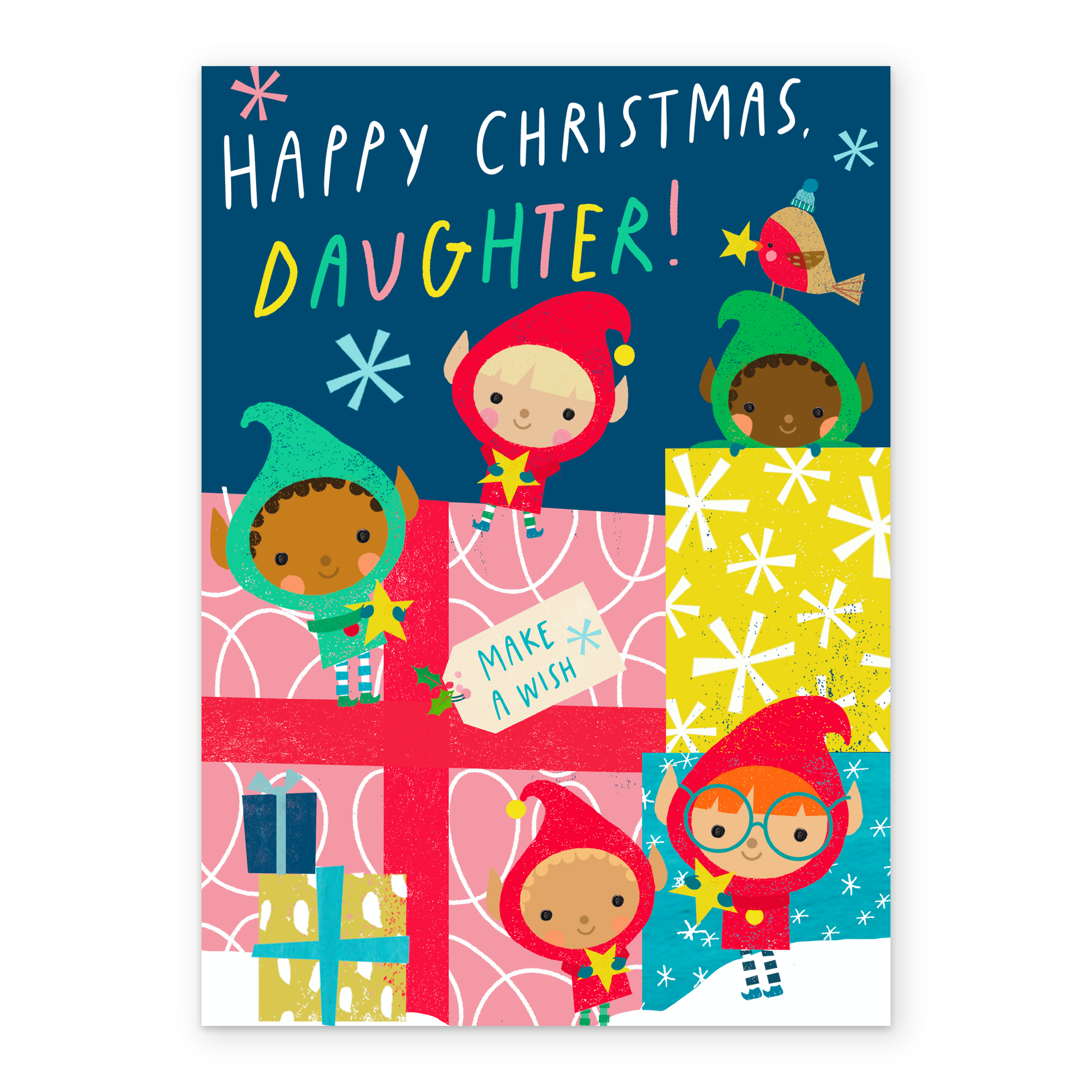 Show them you care with a personalised elves Christmas daughter card from Hallmark. Our Christmas cards are printed on premium quality, FSC®-certified card & delivered nationwide. This card is available as standard 12cm by 16.7cm and large 15.5cm by 21.6cm.