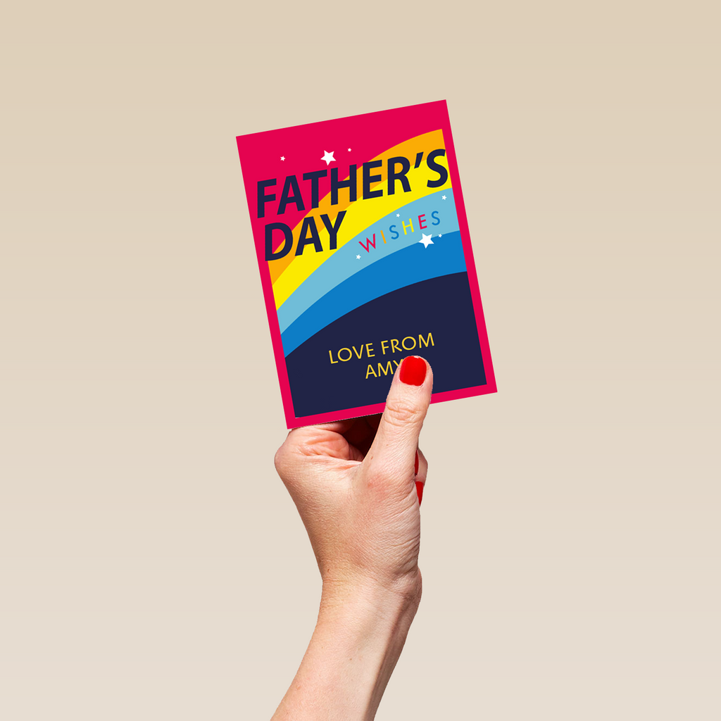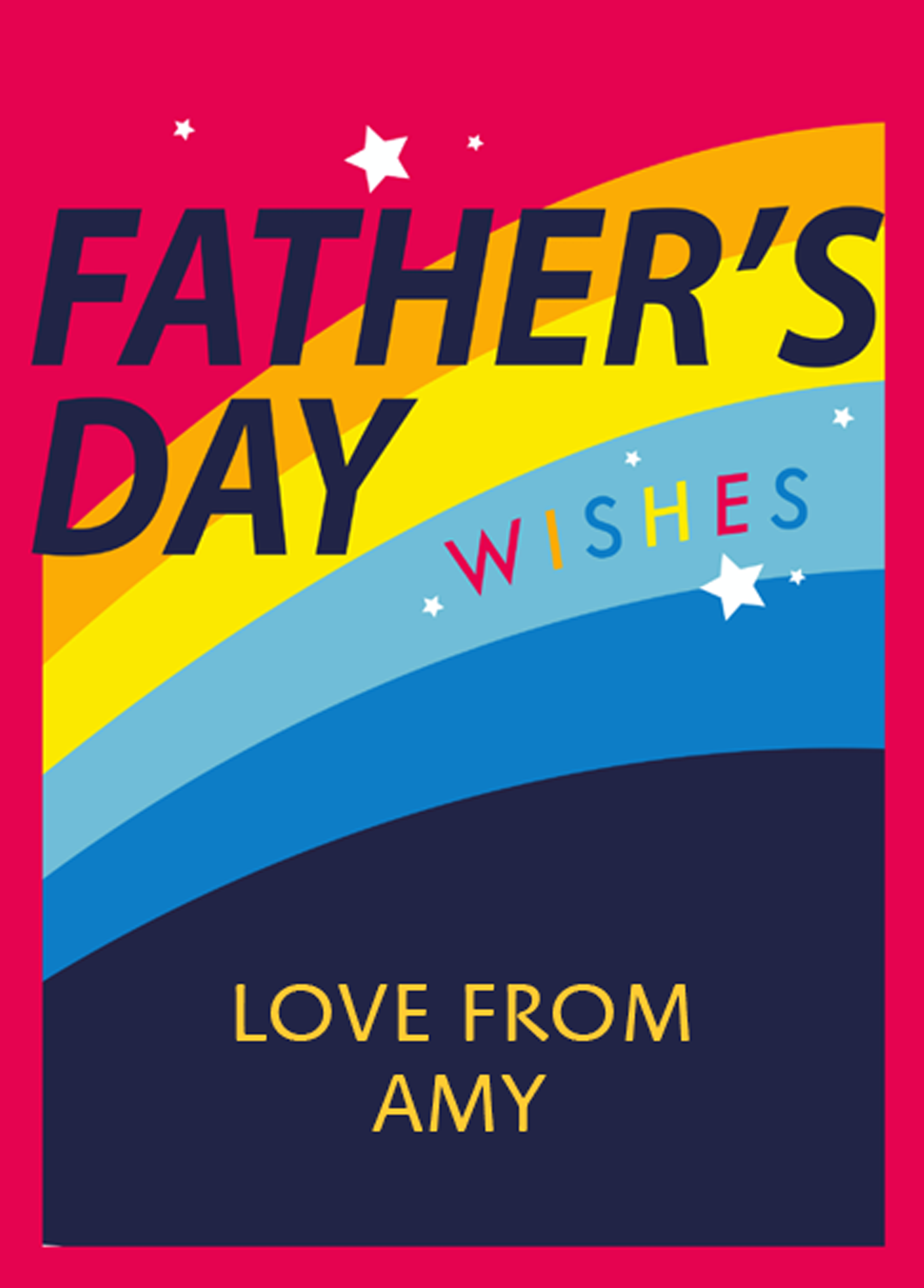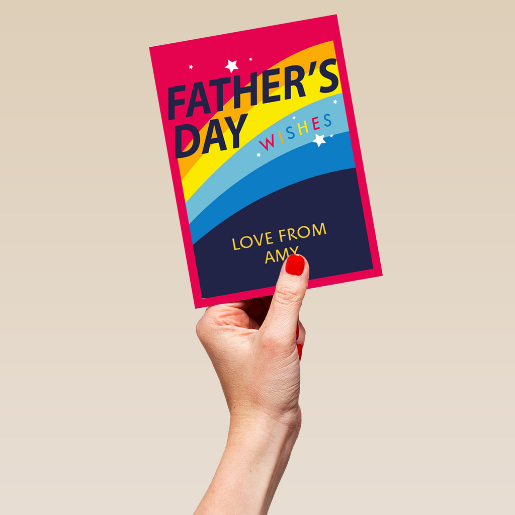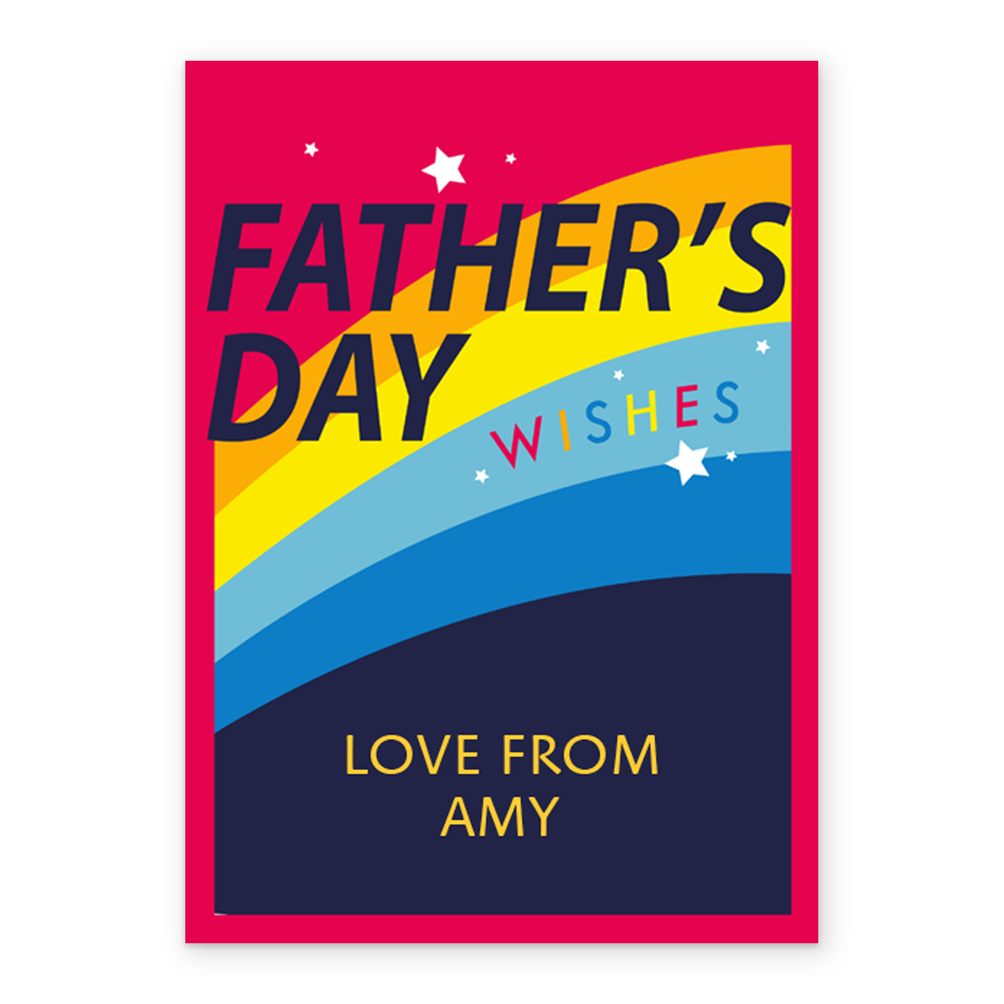 Show them you care with a personalised Father's Day wishes rainbow card from Hallmark. Our Father's Day cards are printed on premium quality, FSC®-certified card & delivered nationwide.This card is available as standard 12cm by 16.7cm and large 15.5cm by 21.6cm.