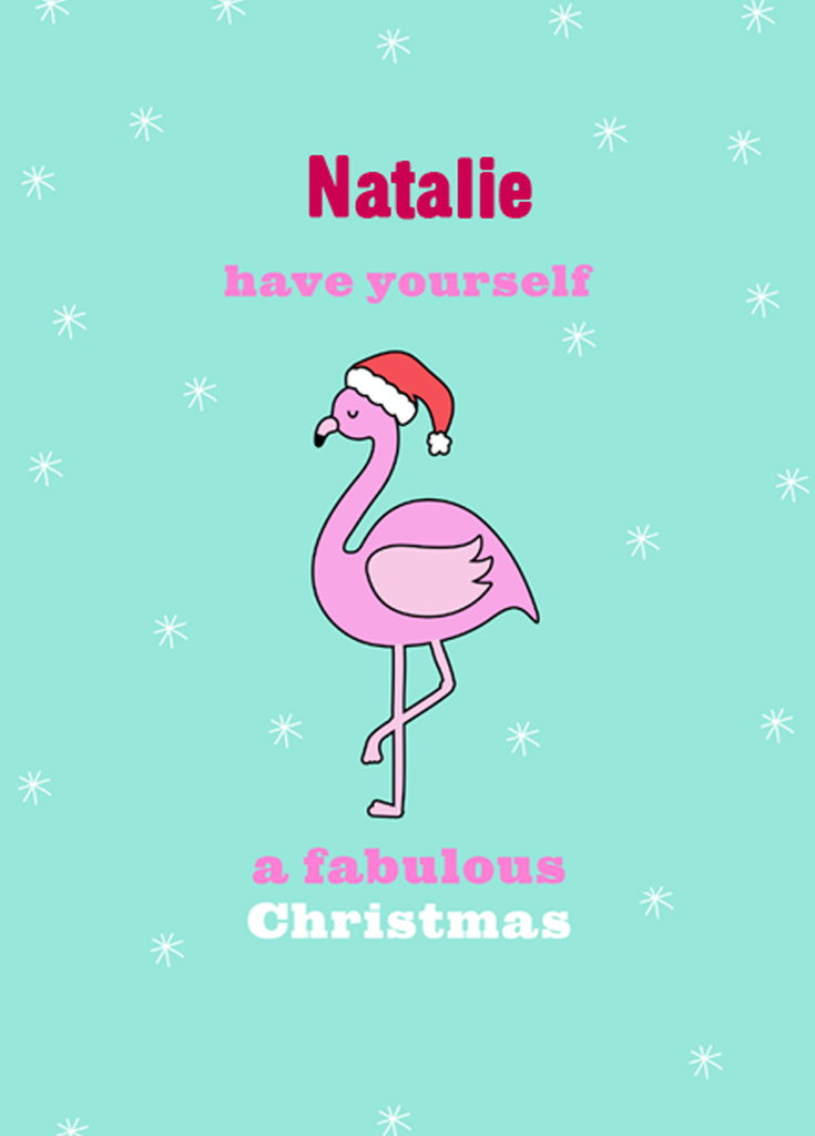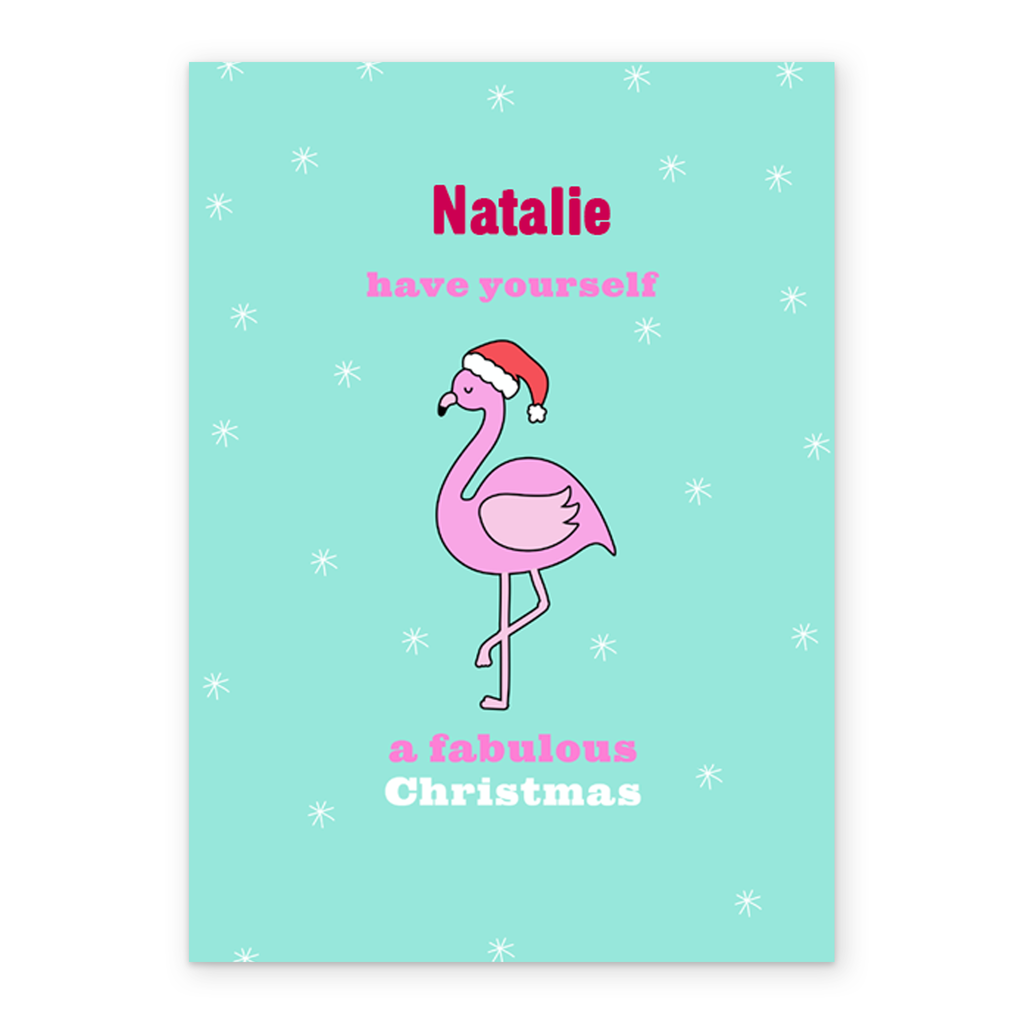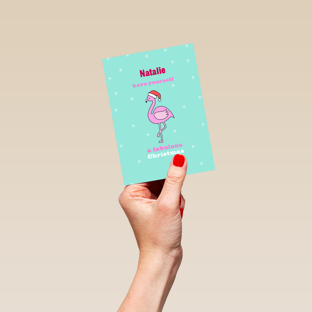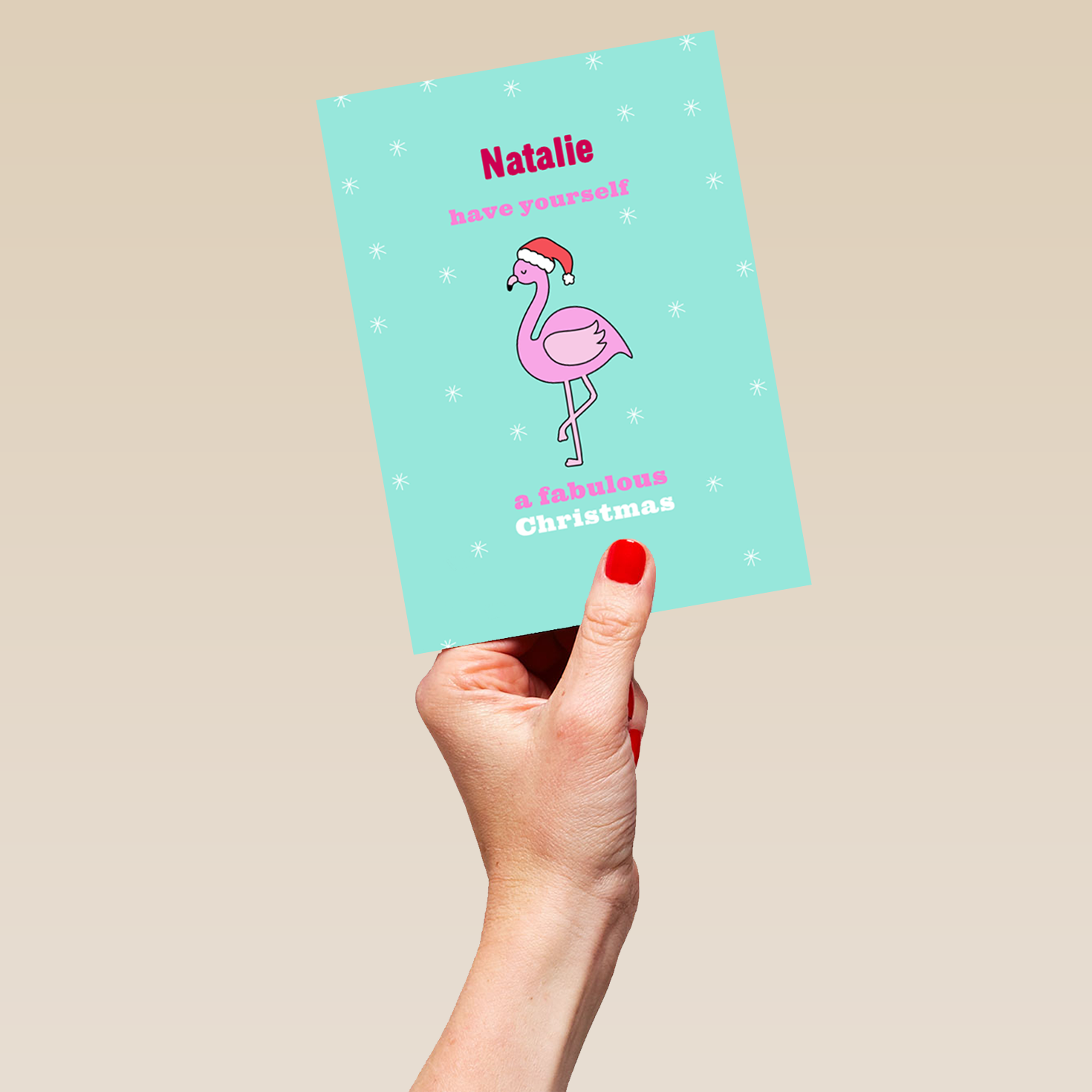 Show them you care with a personalised festive merry flamingo card from Hallmark. Our Christmas cards are printed on premium quality, FSC®-certified card & delivered nationwide. This card is available as standard 12cm by 16.7cm and large 15.5cm by 21.6cm.