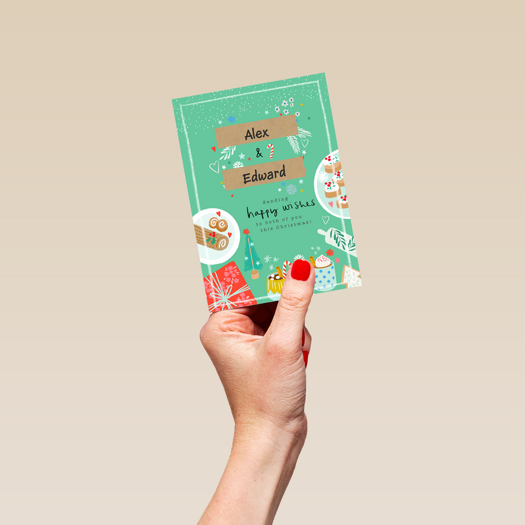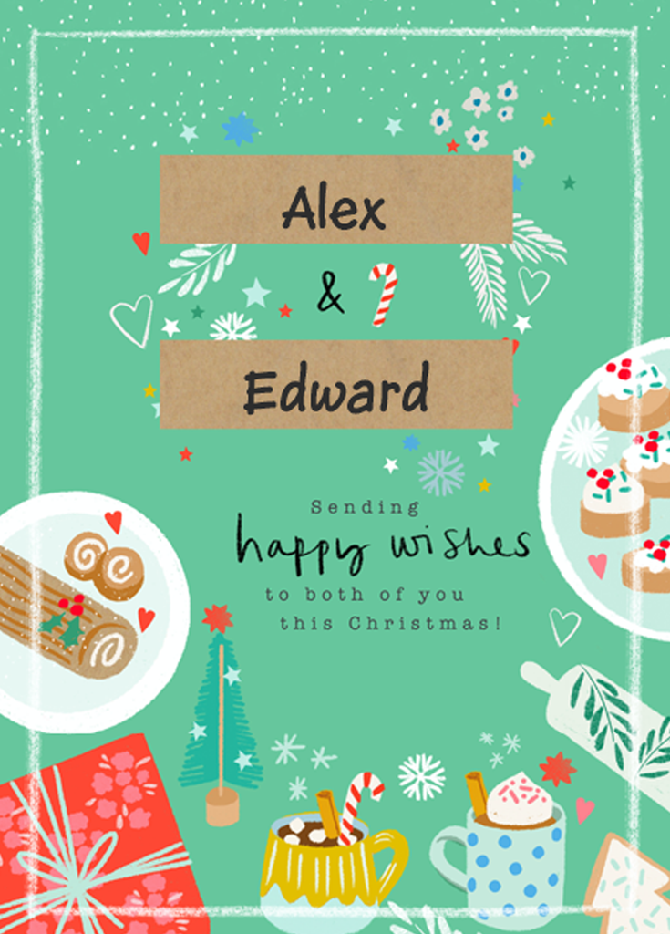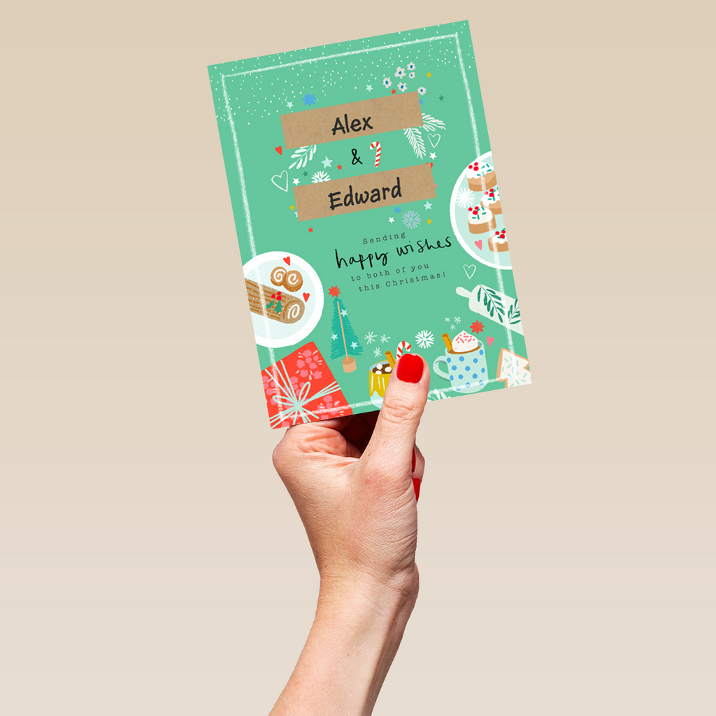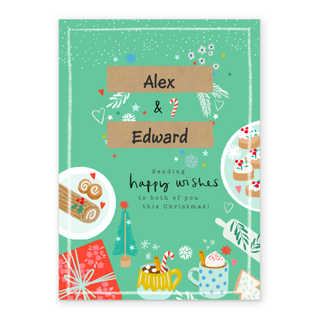 Printed on premium-quality board, this card features space to personalise names, festive treats illustrations including a yule log, hot chocolate and cookies, and comes complete with a co-ordinating white envelope.
