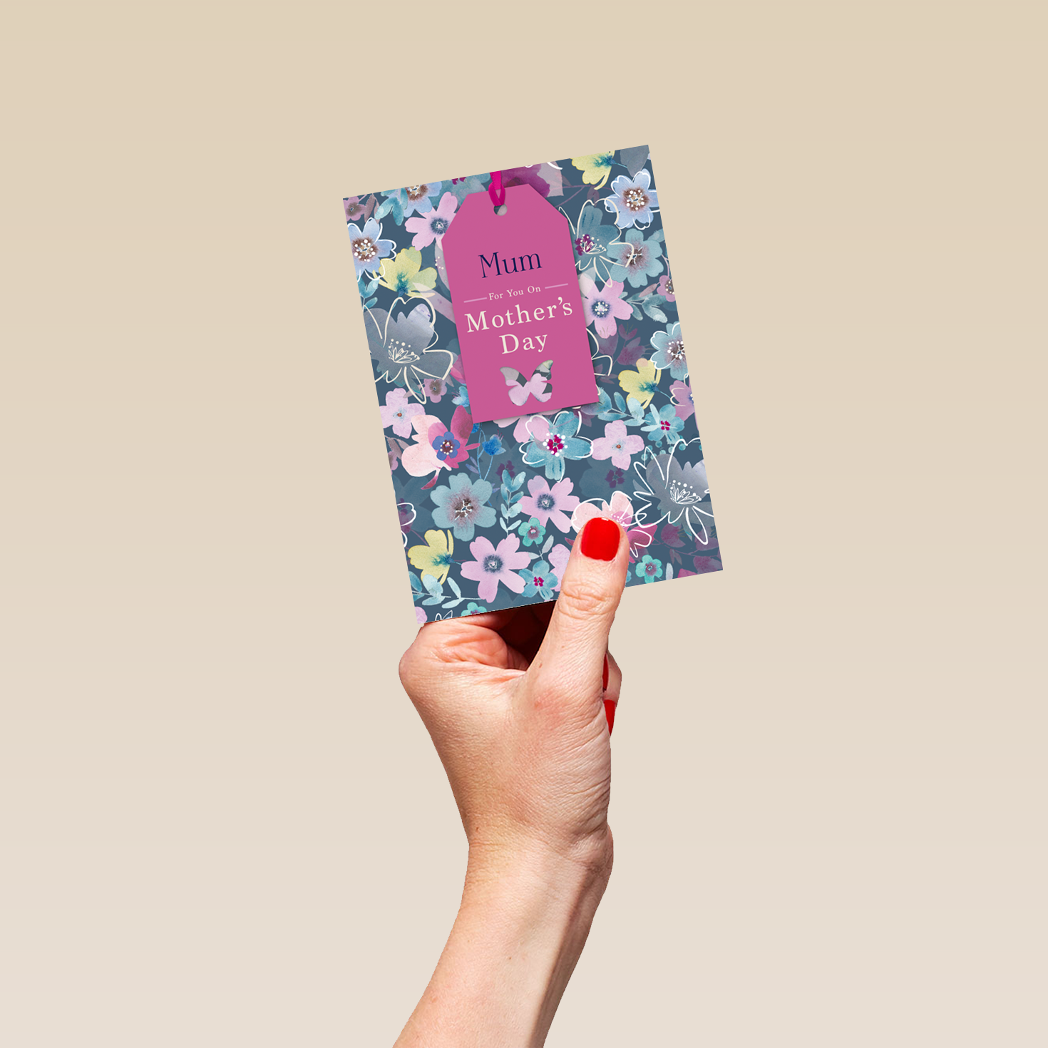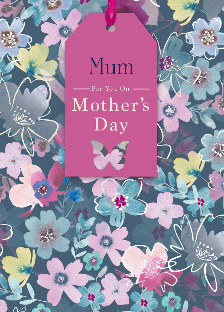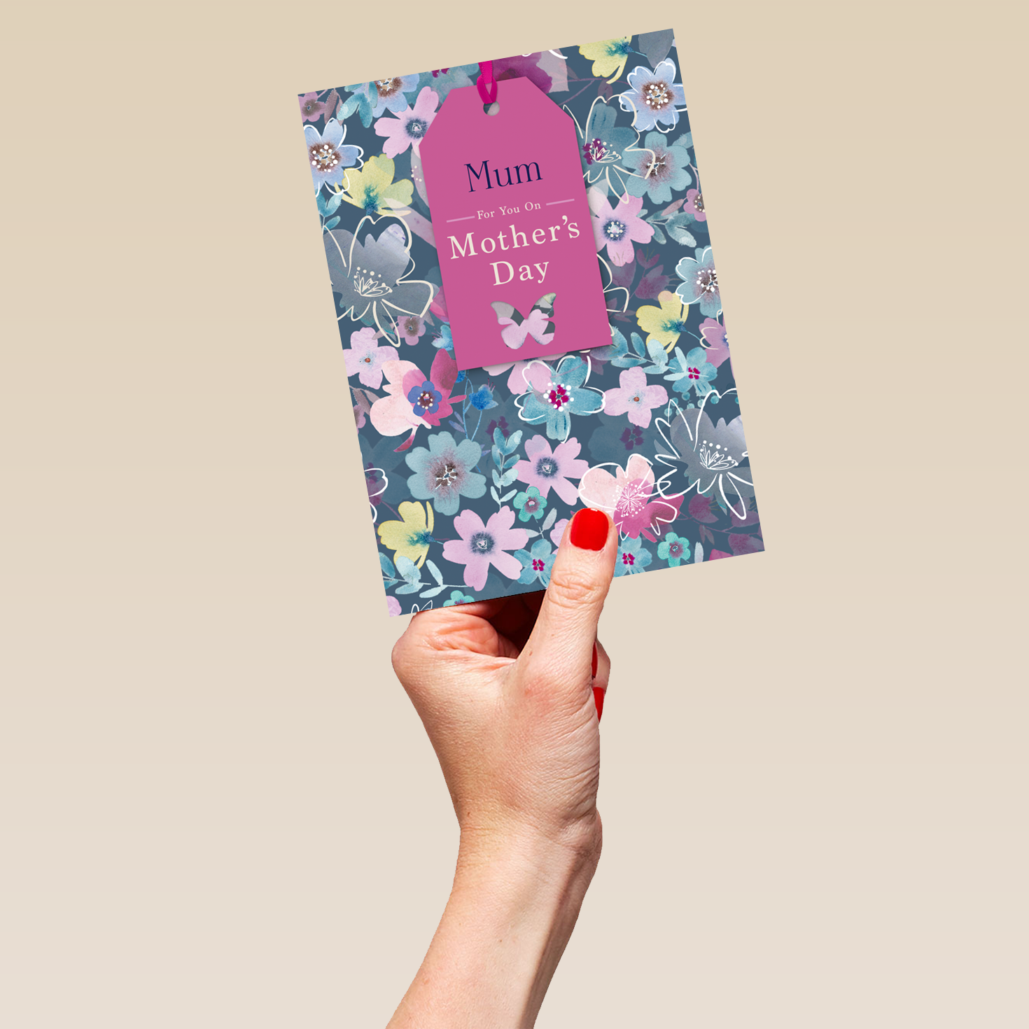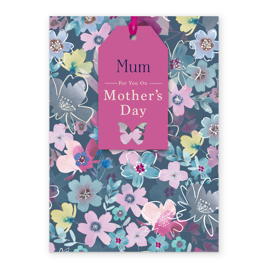 Printed on premium-quality board, this card features colourful illustrated flowers and a butterfly label-effect design on a dark green background, with the message 'Mum For You On Mother's Day', space to personalise a name, and comes complete with a co-ordinating white envelope.