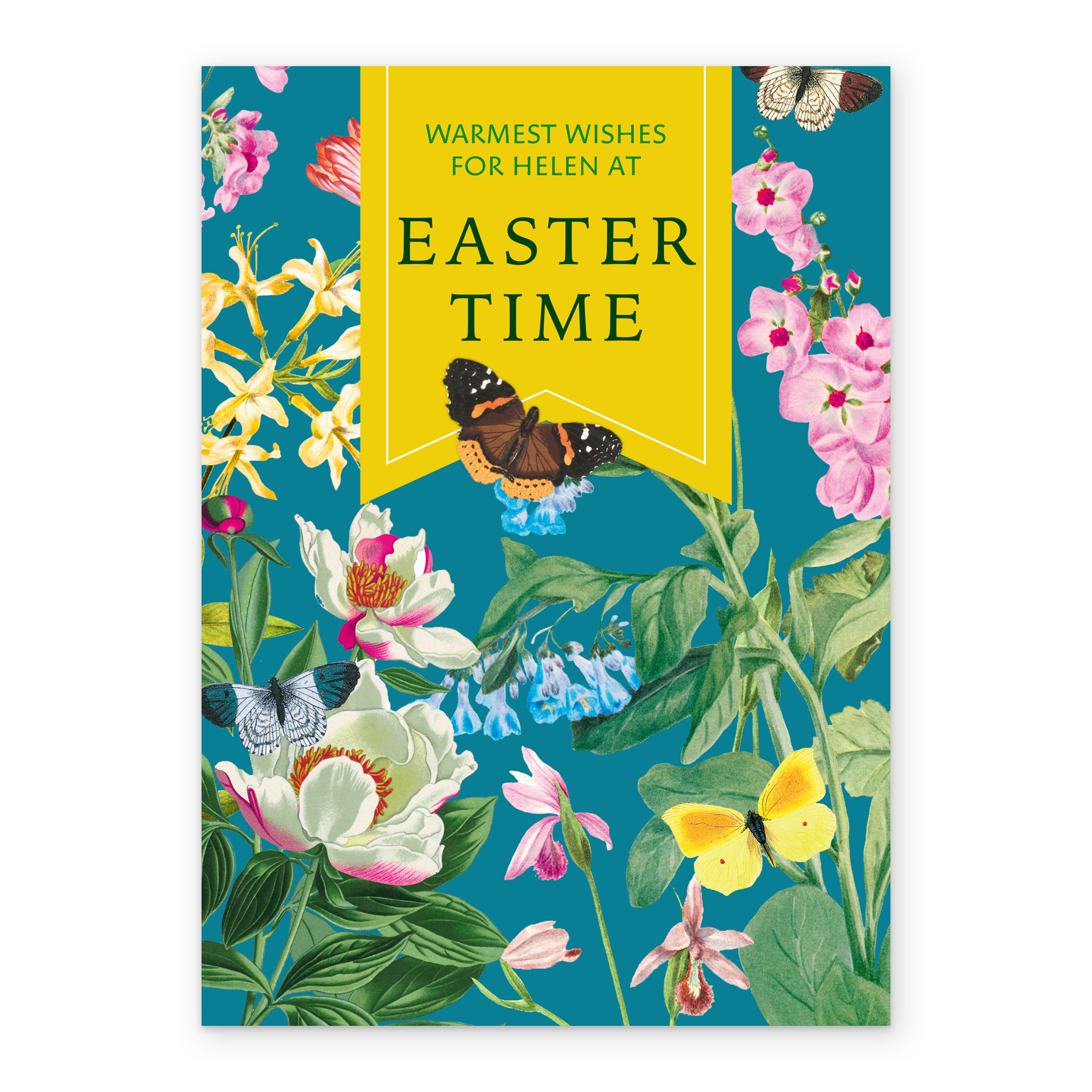 Printed on premium-quality board, this card features a traditional floral design with colourful spring flowers, butterflies and a yellow banner at the top, on a turquoise background, with the message 'Warmest wishes for ___ at Easter time', space to personalise your message, and comes complete with a co-ordinating white envelope.