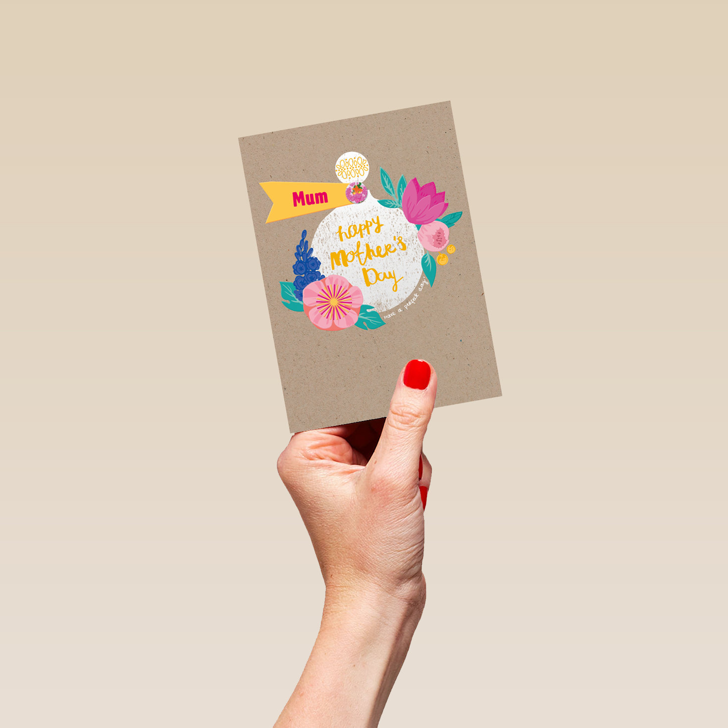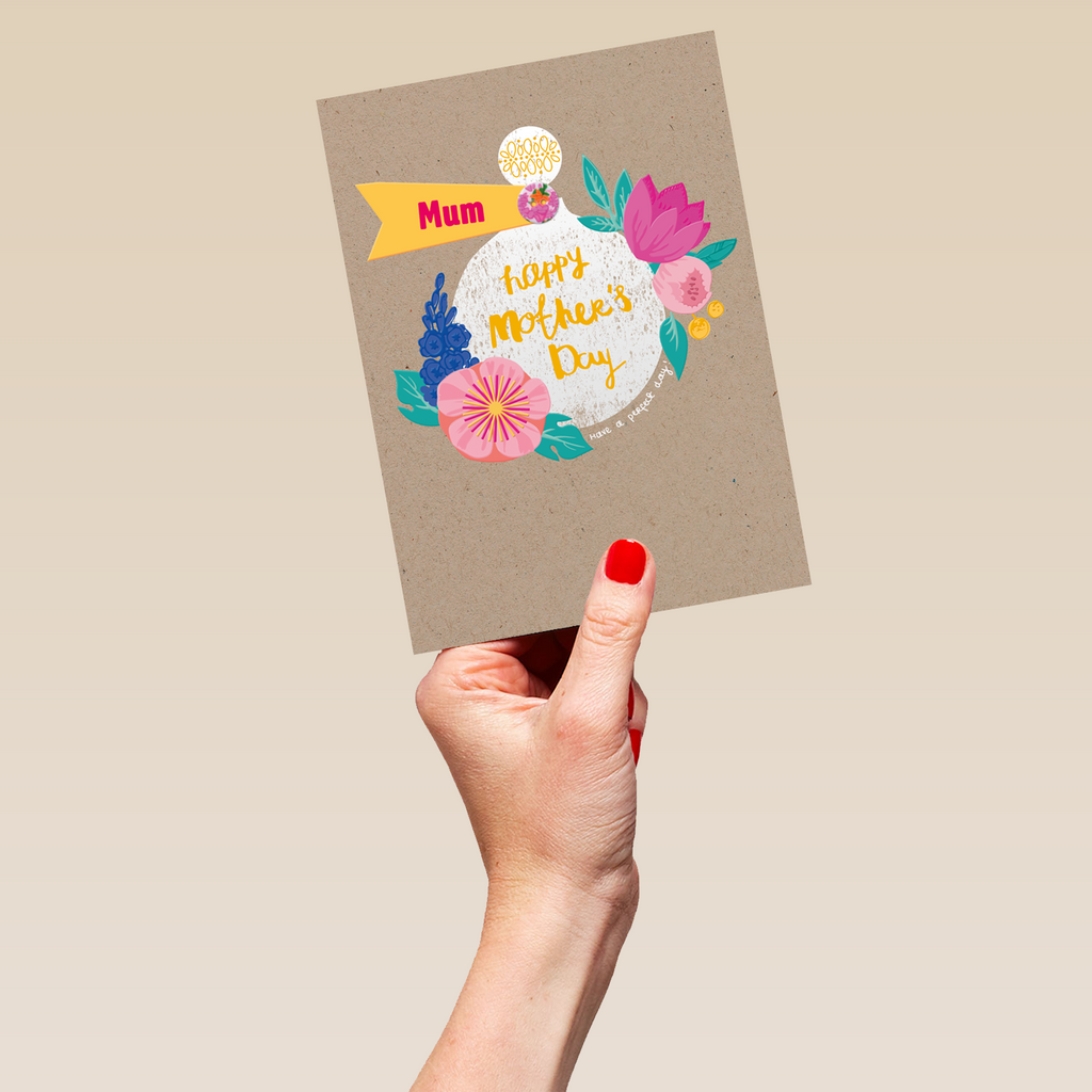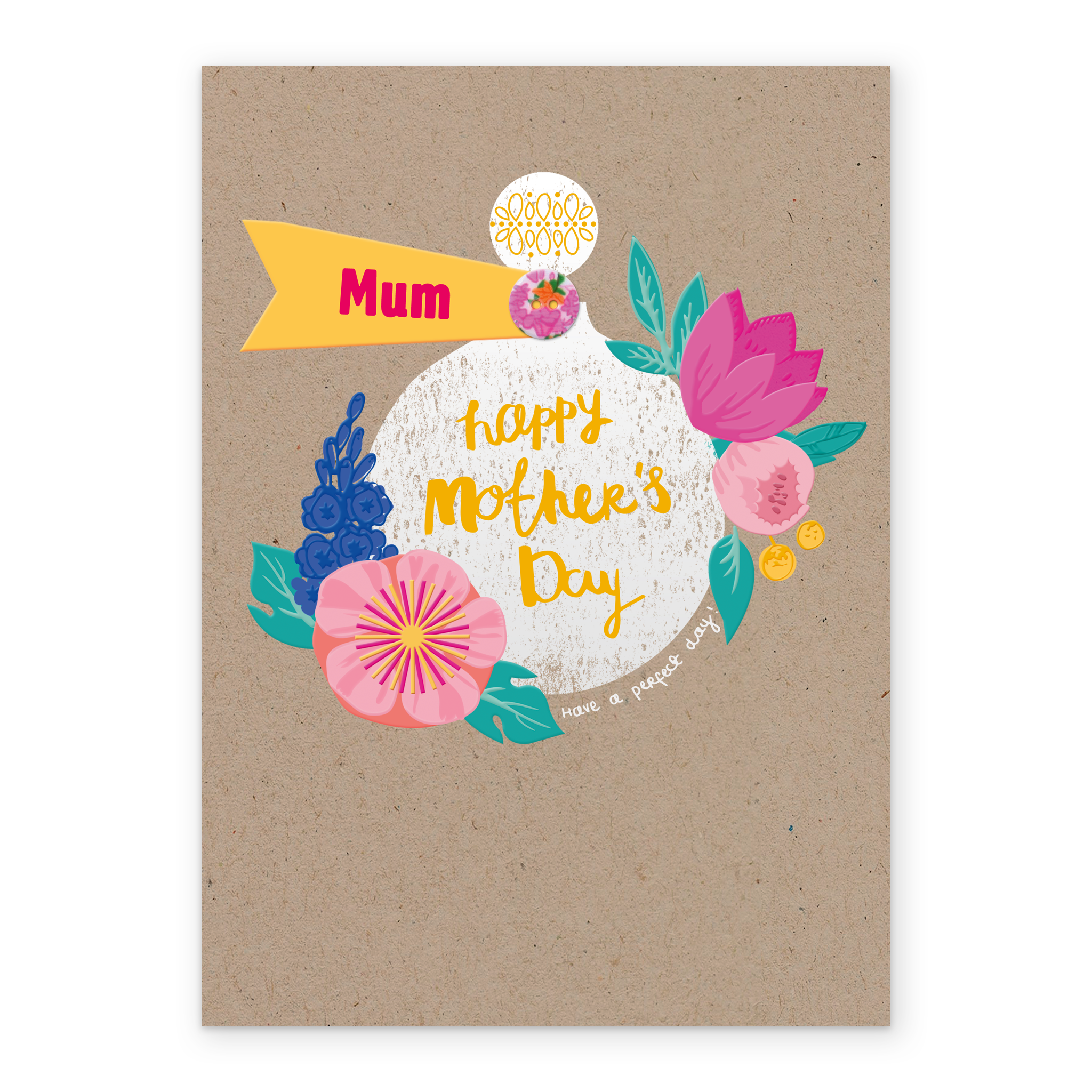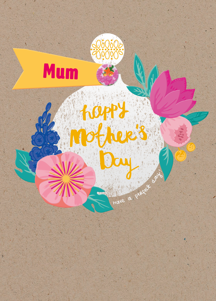 Printed on premium-quality board, this card features a contemporary white perfume bottle decorated with colourful flowers and a name tag, on a kraft-effect background, with the message 'Happy Mother's Day. Have a perfect day!', space to personalise a name, and comes complete with a co-ordinating white envelope.