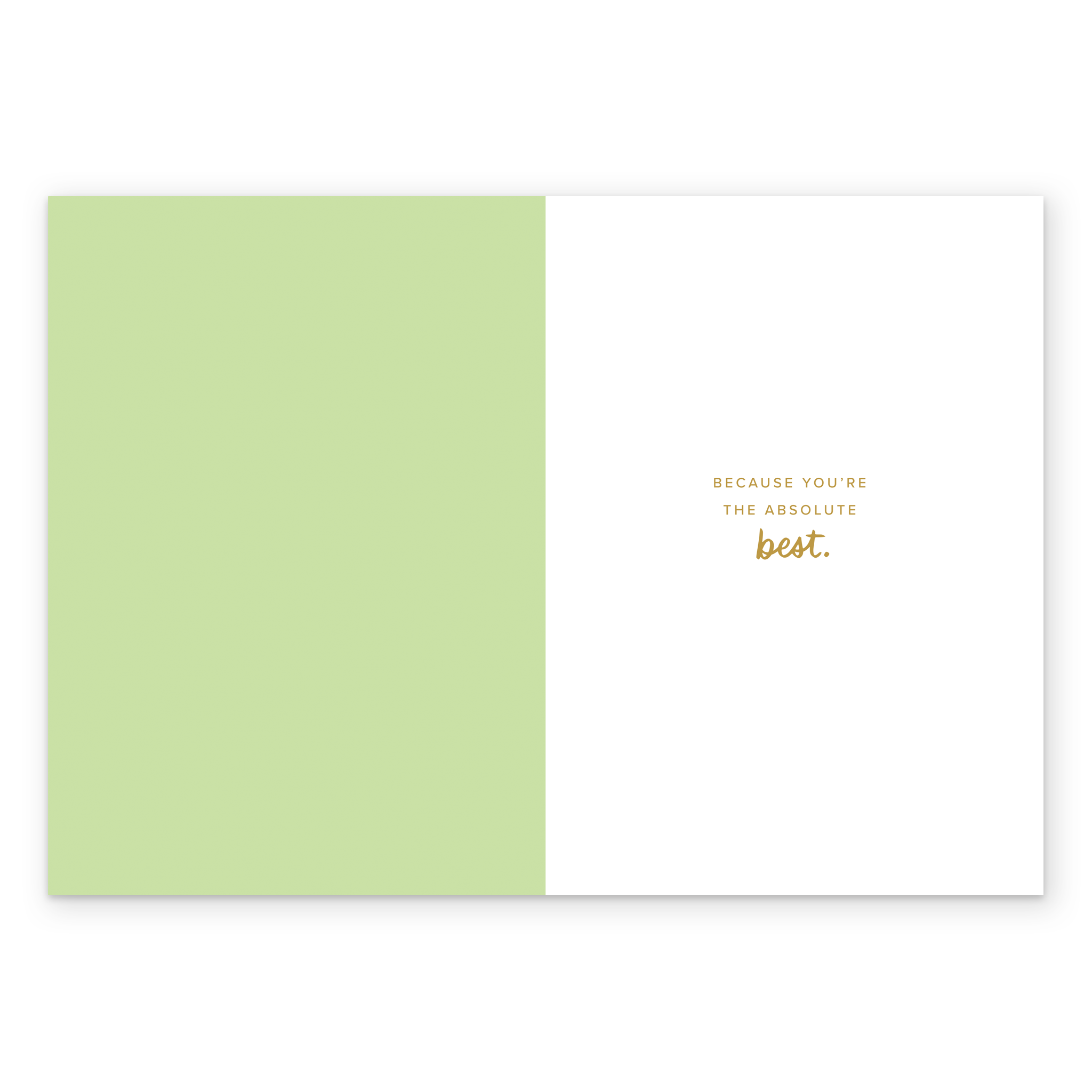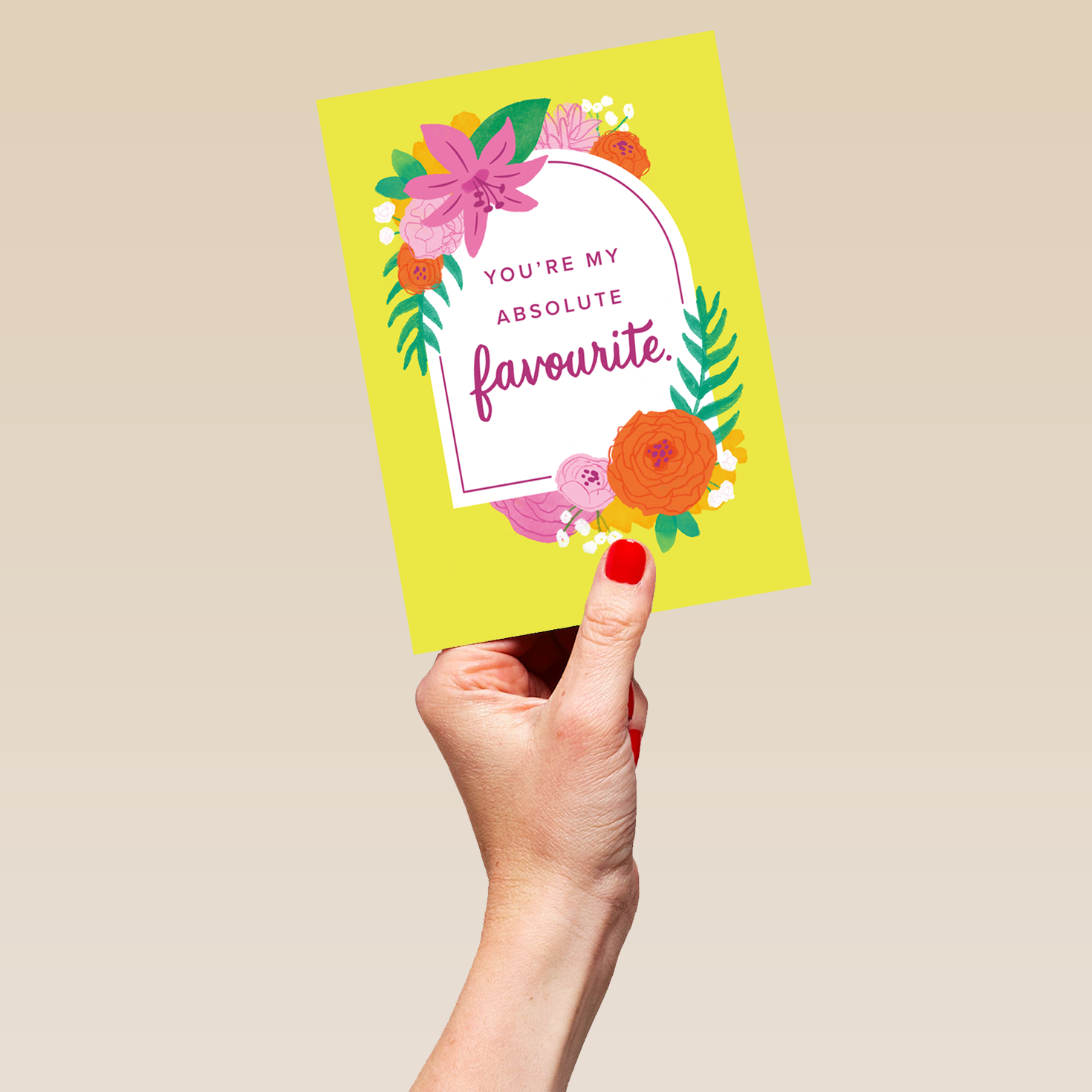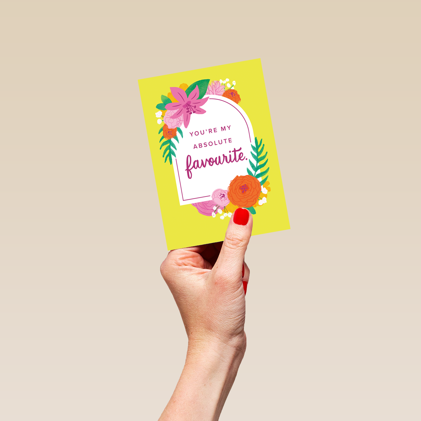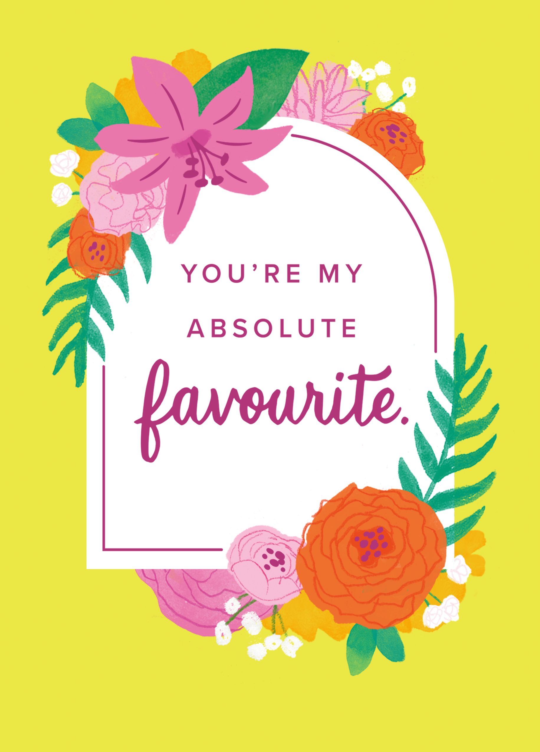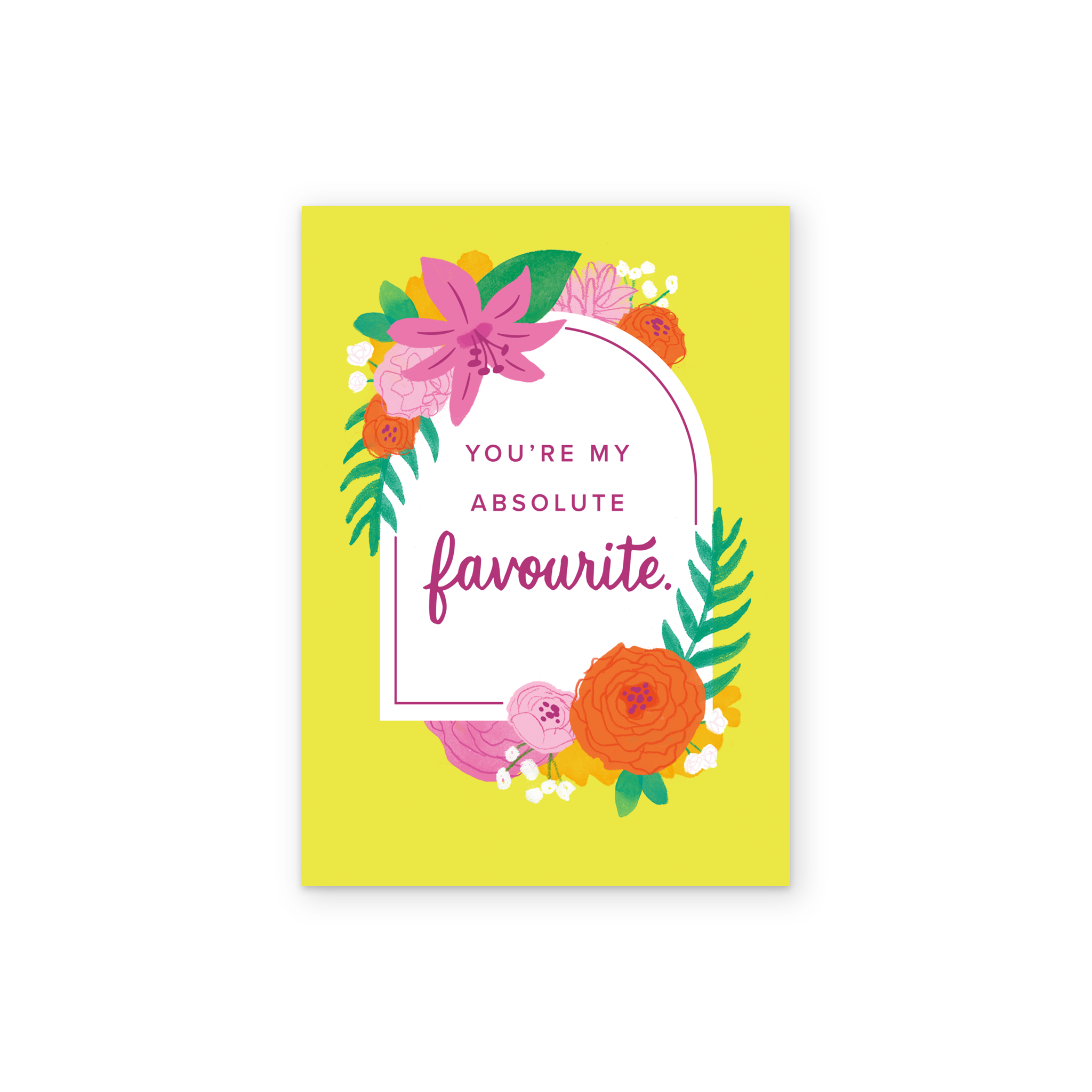 Printed on premium-quality board, this card features a vibrant yellow background with an arch-shaped central panel surrounded by beautifully illustrated red and pink flowers alongside magenta lettering , with the message 'You're my absolute favourite.', and comes complete with a co-ordinating white envelope.