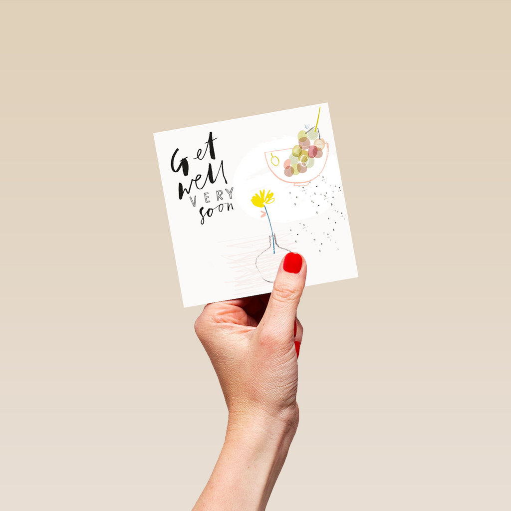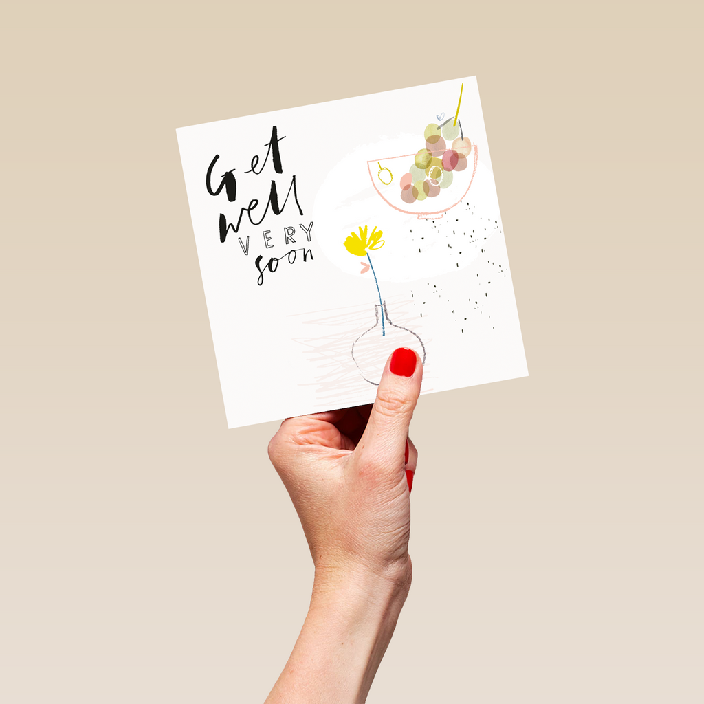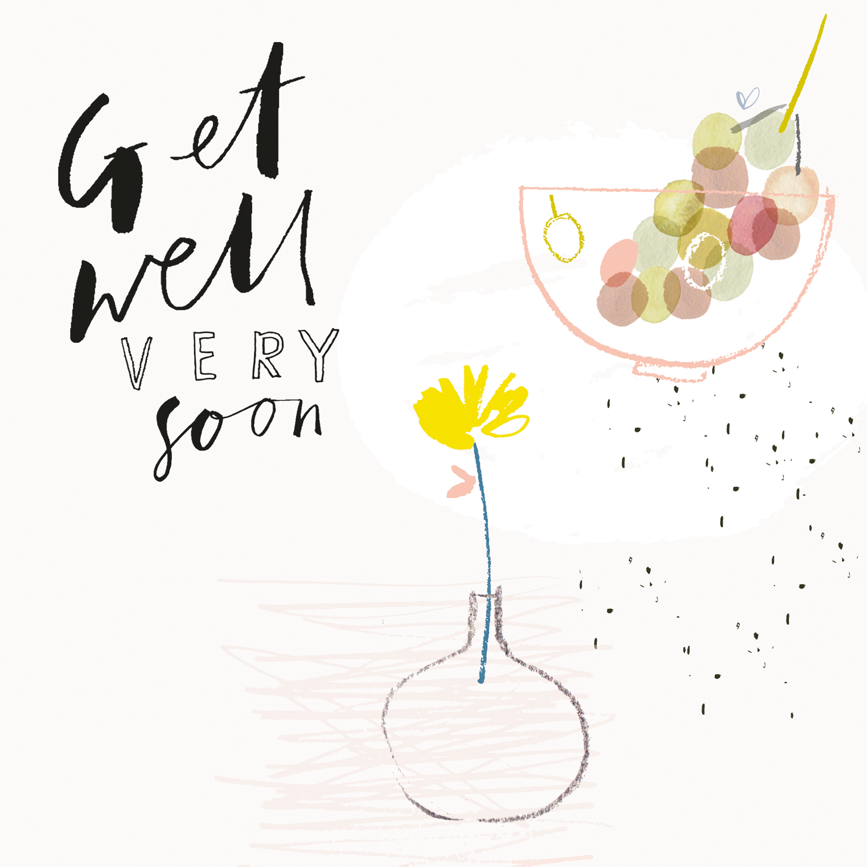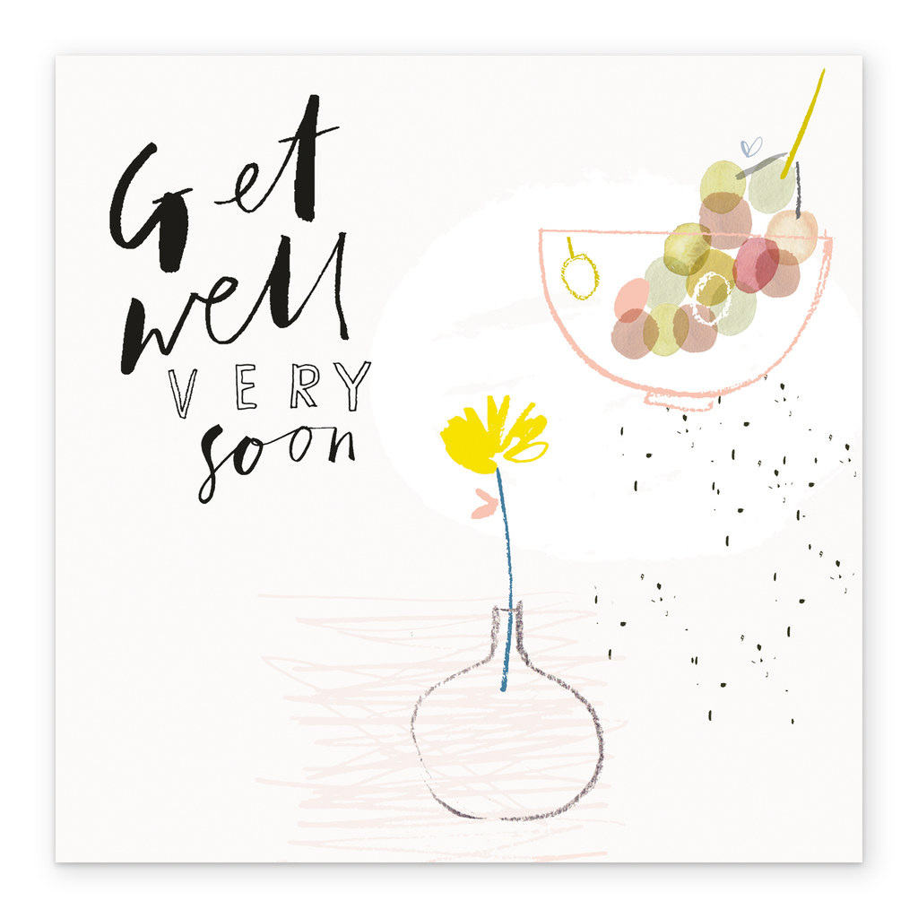 Printed on premium-quality board, this card features an artistic inspired flower in vase and grapes in a bowl, with the message 'Get well very soon', and comes complete with a co-ordinating white envelope.