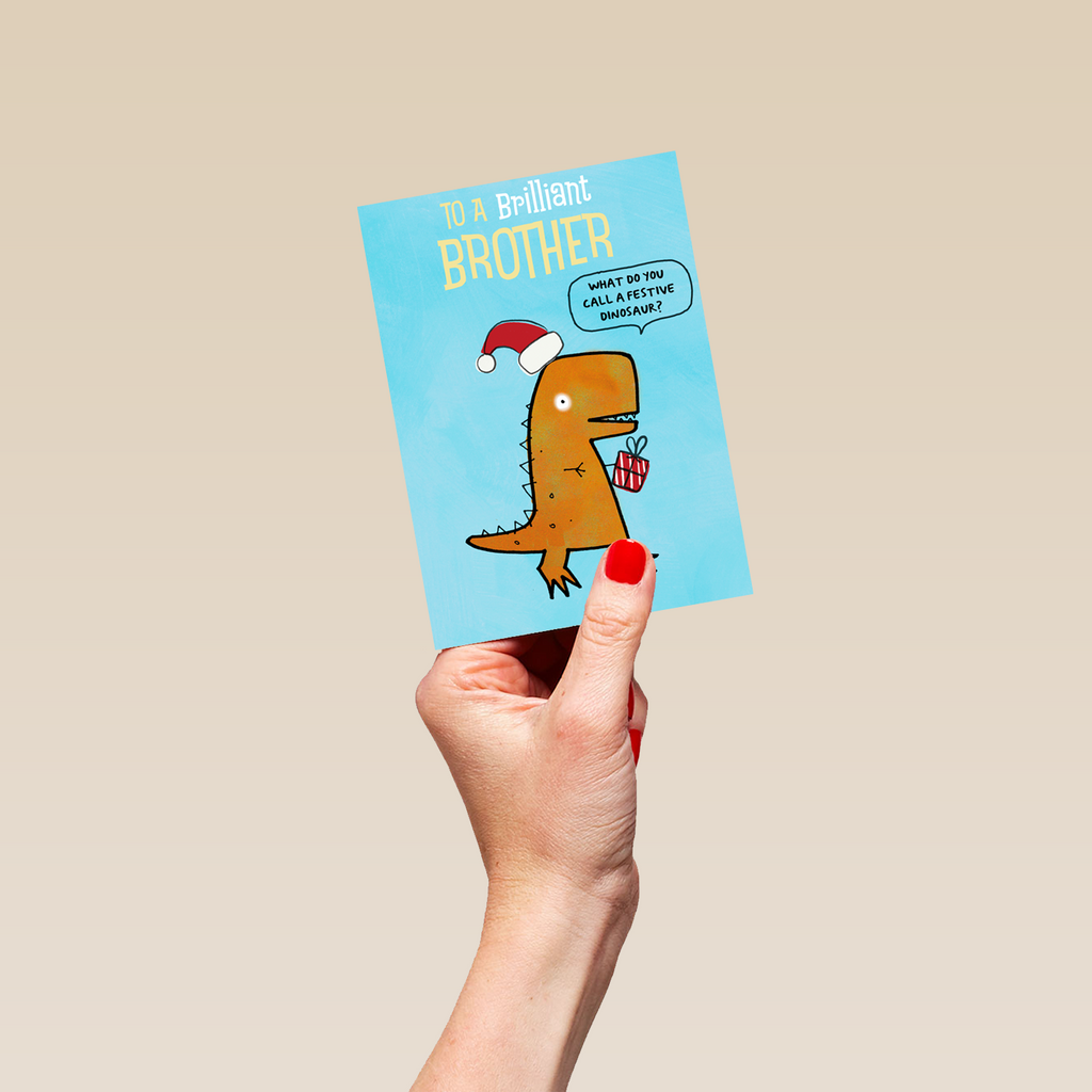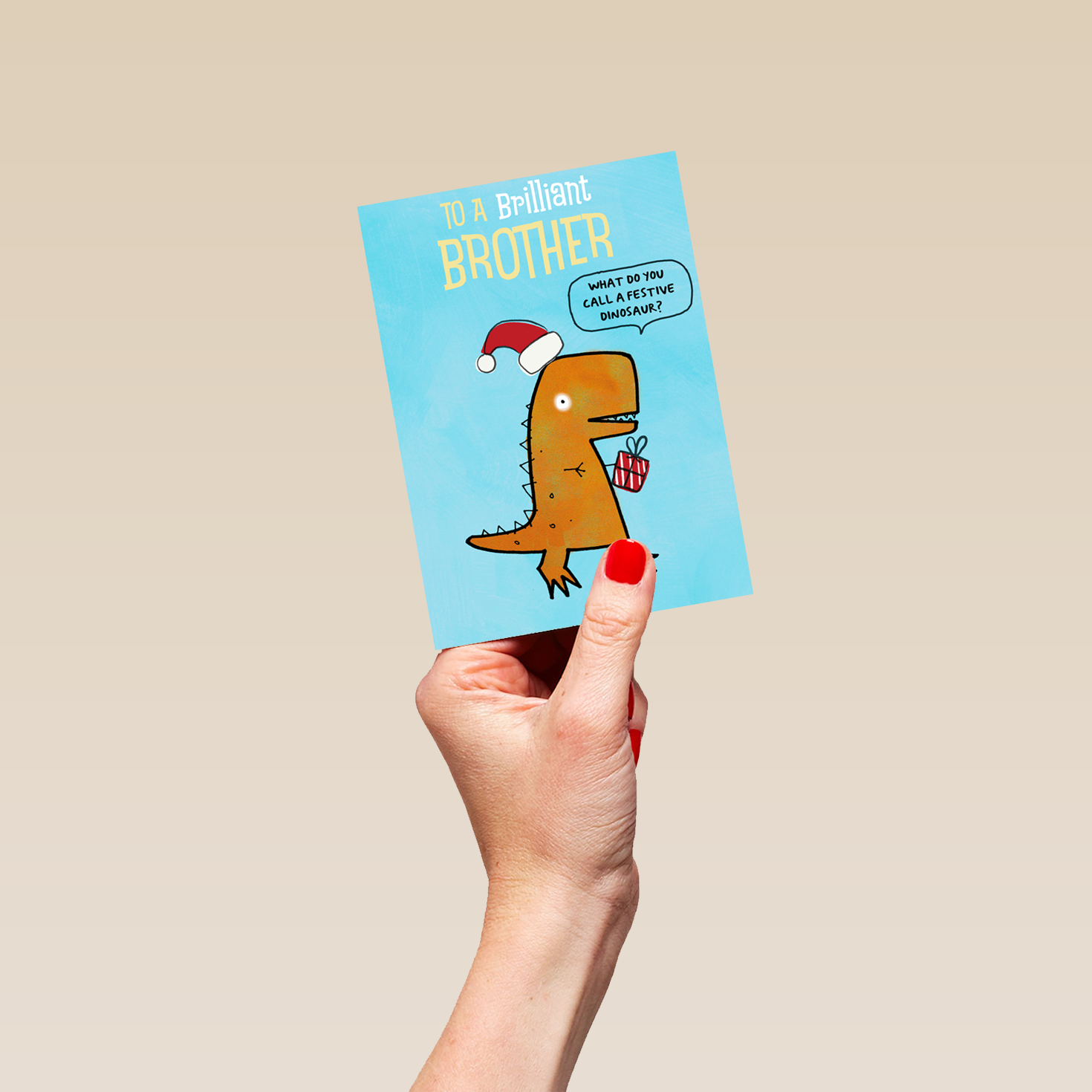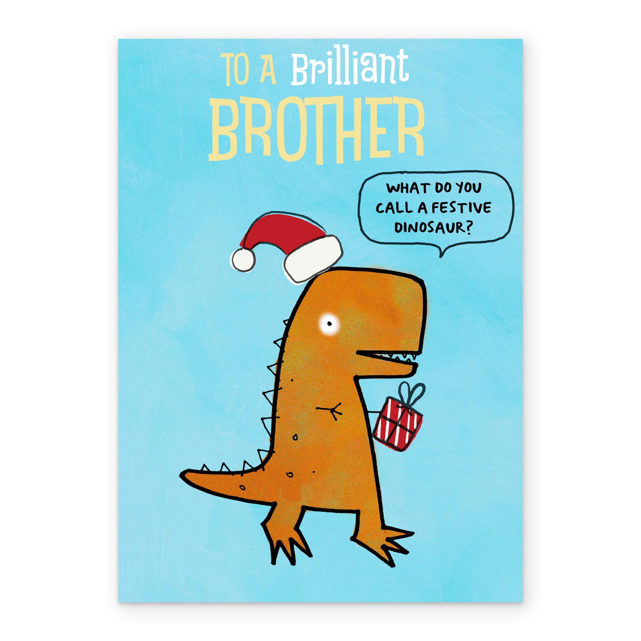 Show them you care with a personalised brother festive dinosaur card from Hallmark. Our Christmas cards are printed on premium quality, FSC®-certified card & delivered nationwide. This card is available as standard 12cm by 16.7cm and large 15.5cm by 21.6cm.