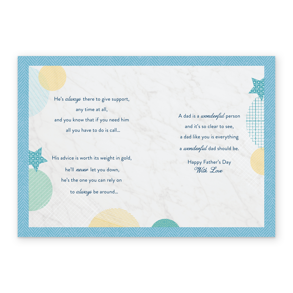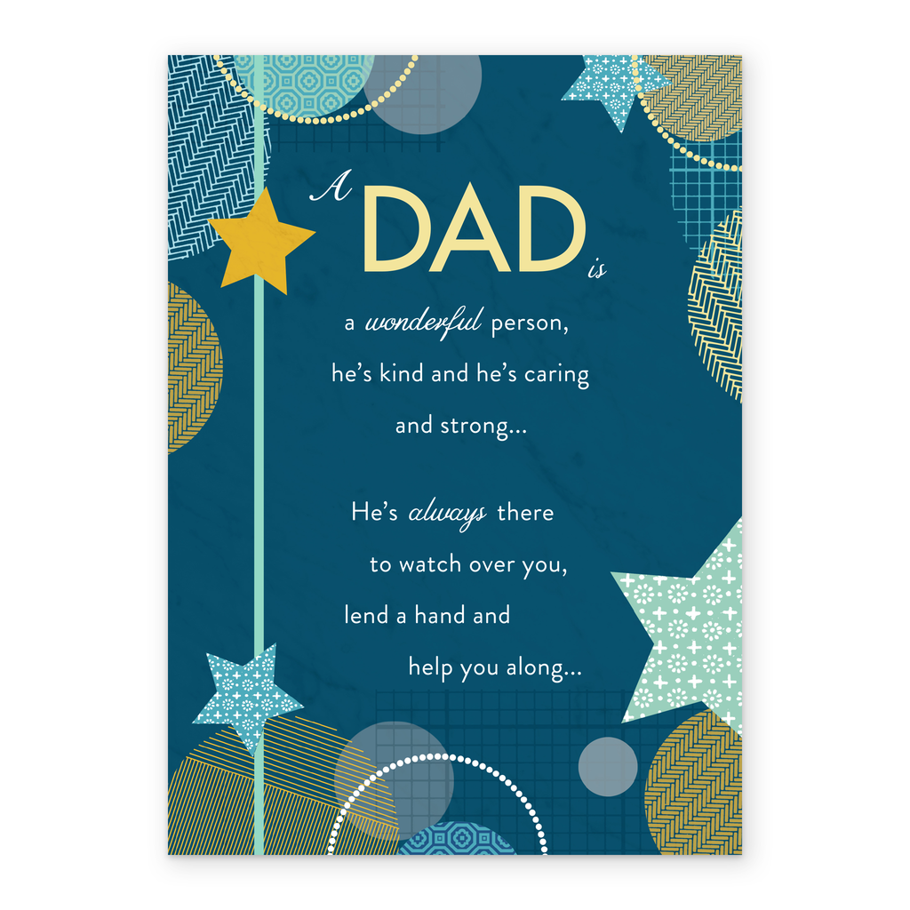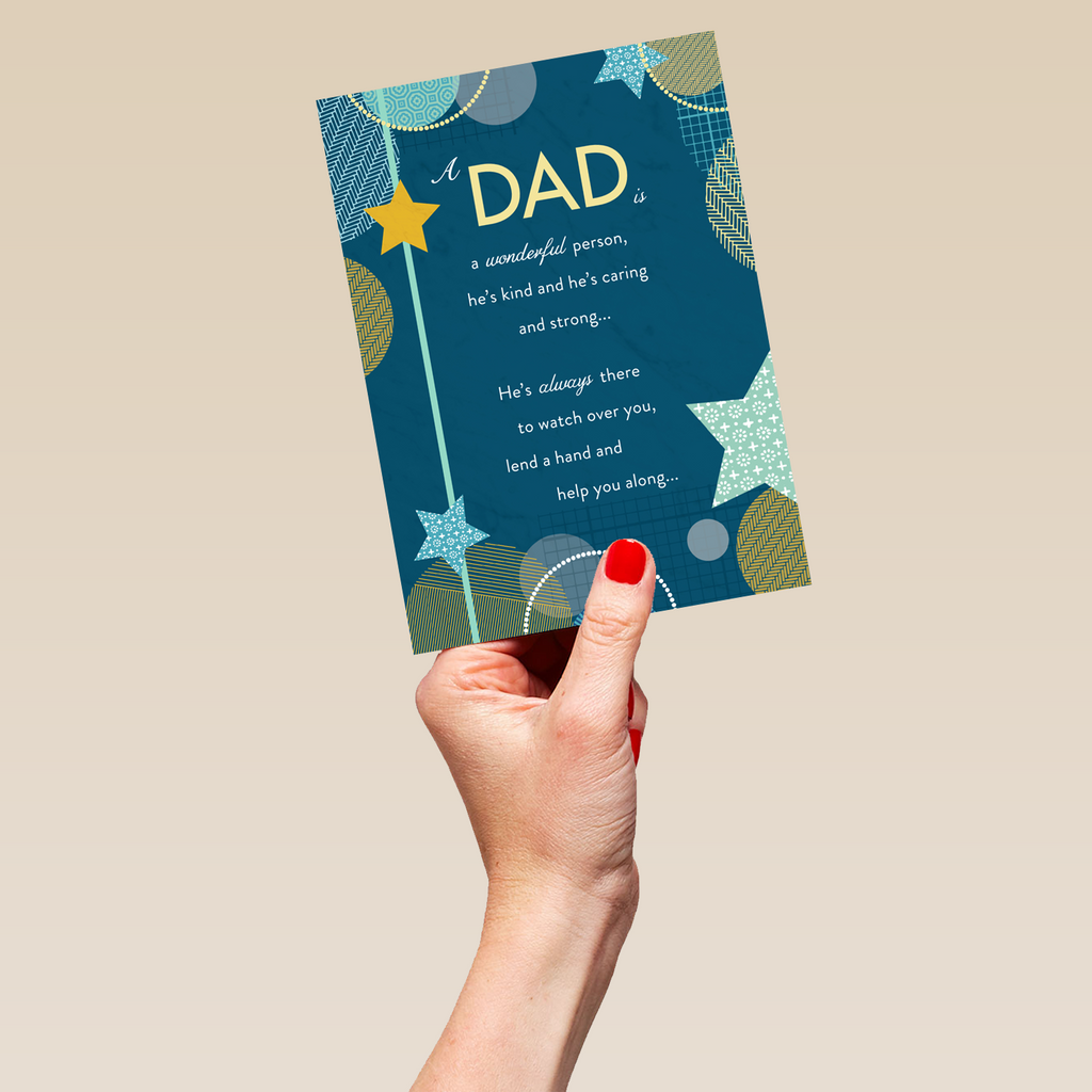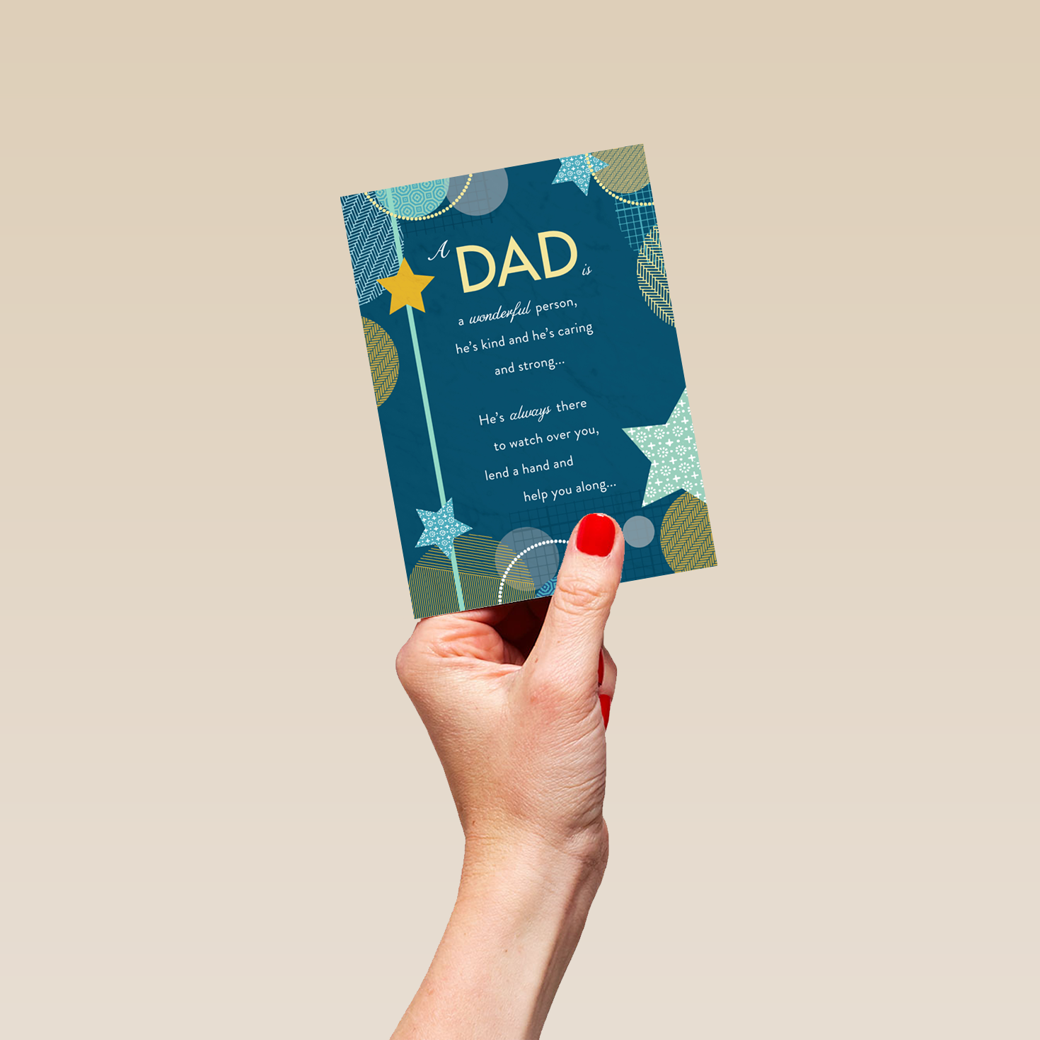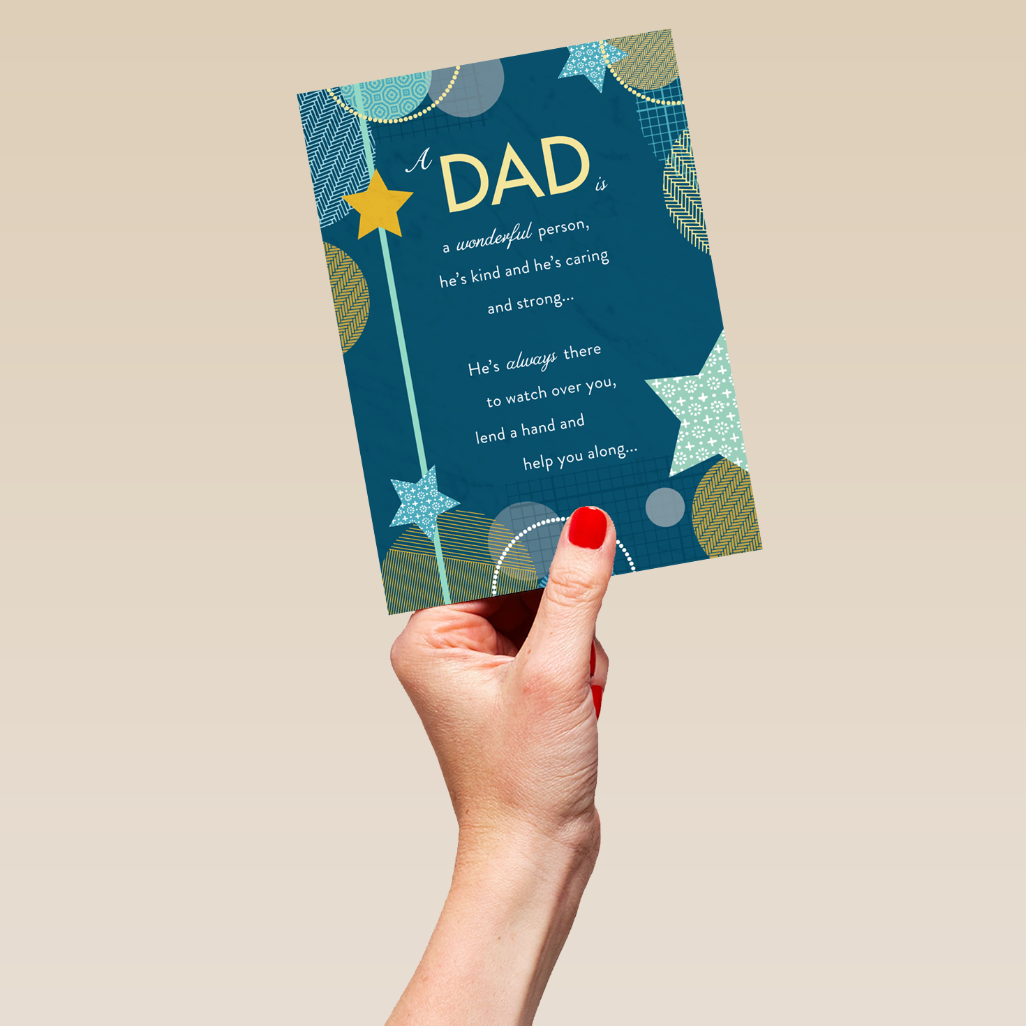 Show them you care with a personalised dad traditional written verse Father's Day card from Hallmark. Our Father's Day cards are printed on premium quality, FSC®-certified card & delivered nationwide. This card is available as standard 12cm by 16.7cm and large 15.5cm by 21.6cm.