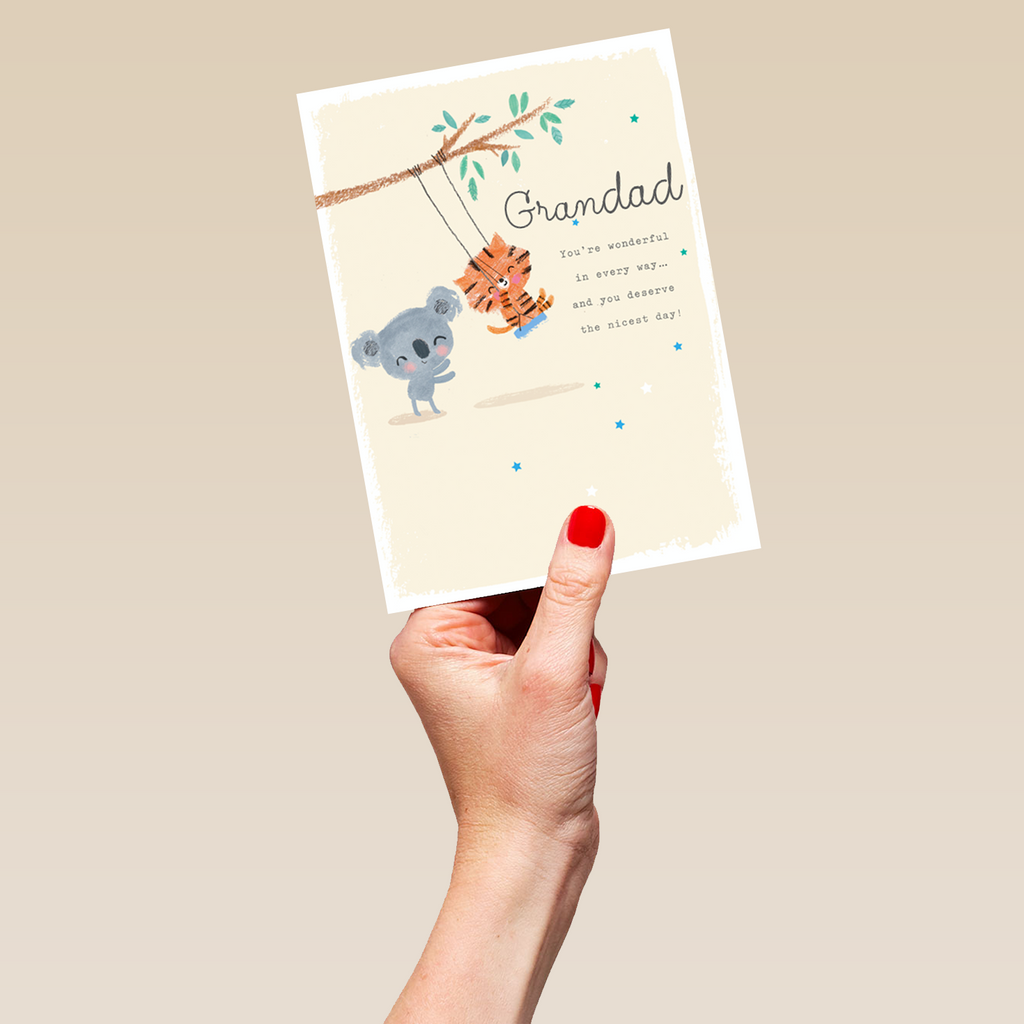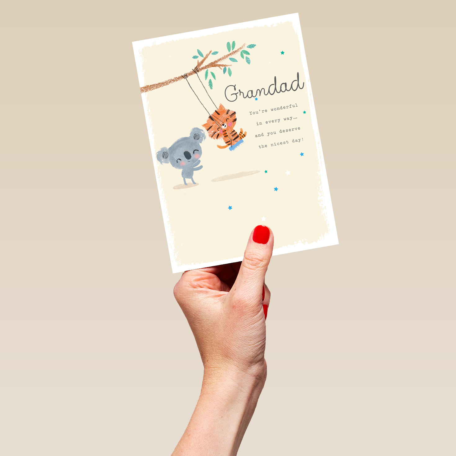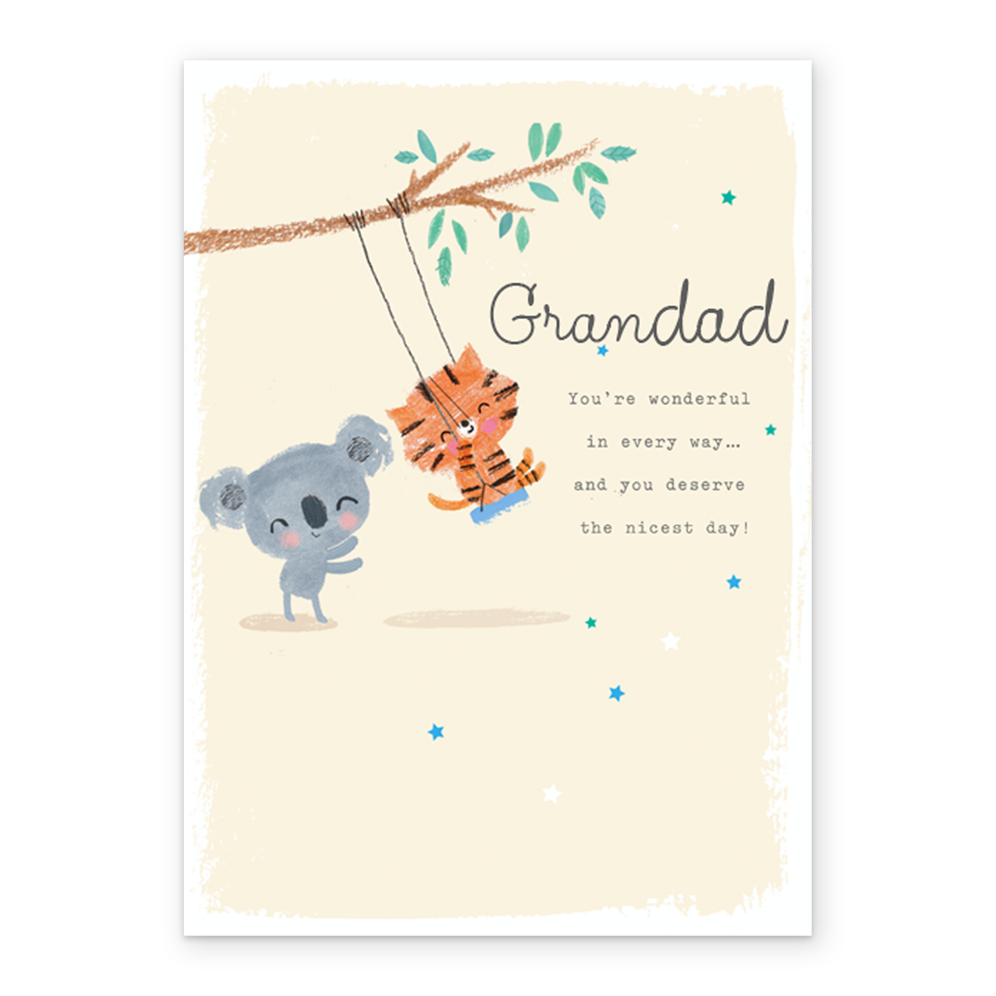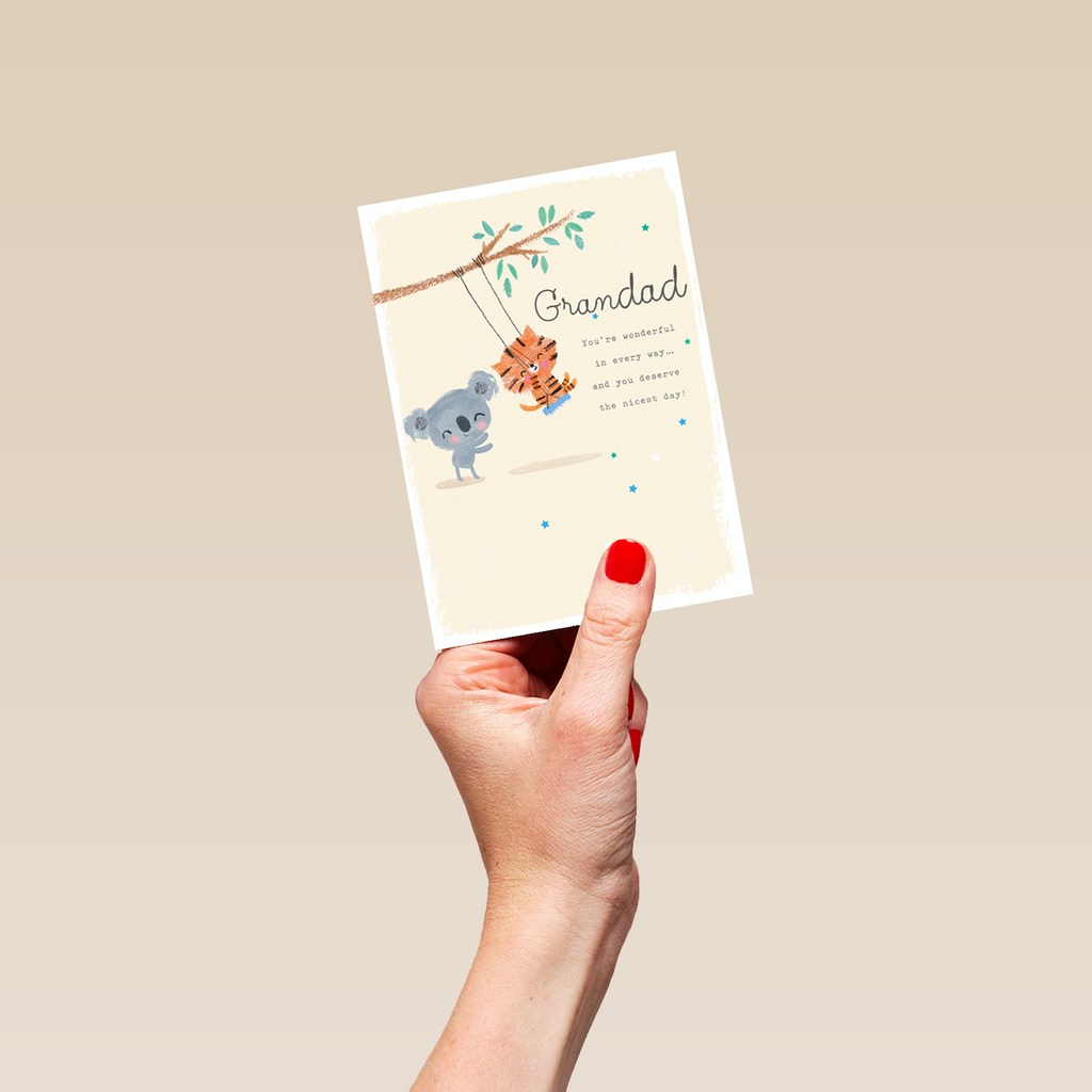 Show them you care with a personalised grandad editable cute baby koala & tiger Father's Day card from Hallmark. Our Father's Day cards are printed on premium quality, FSC®-certified card & delivered nationwide. This card is available as standard 12cm by 16.7cm and large 15.5cm by 21.6cm.