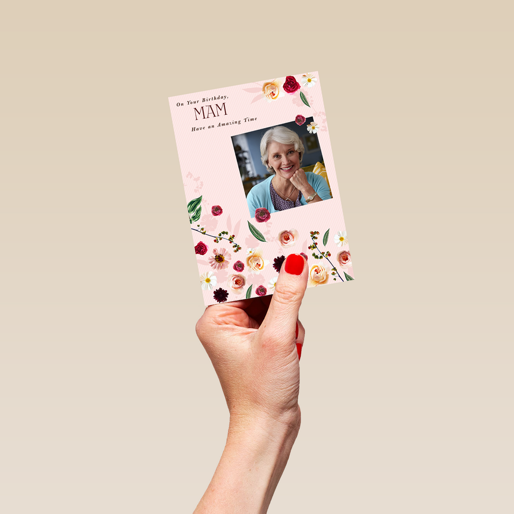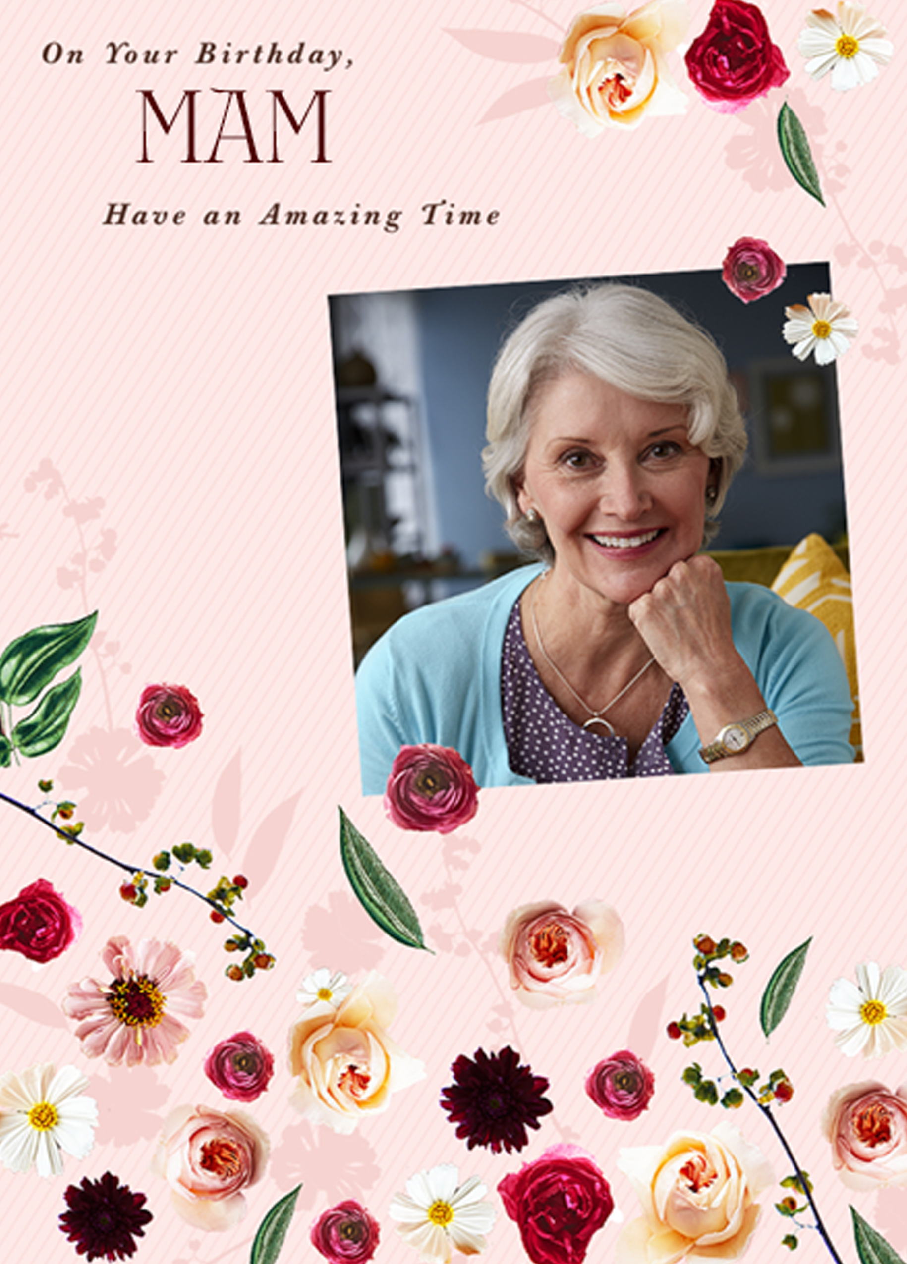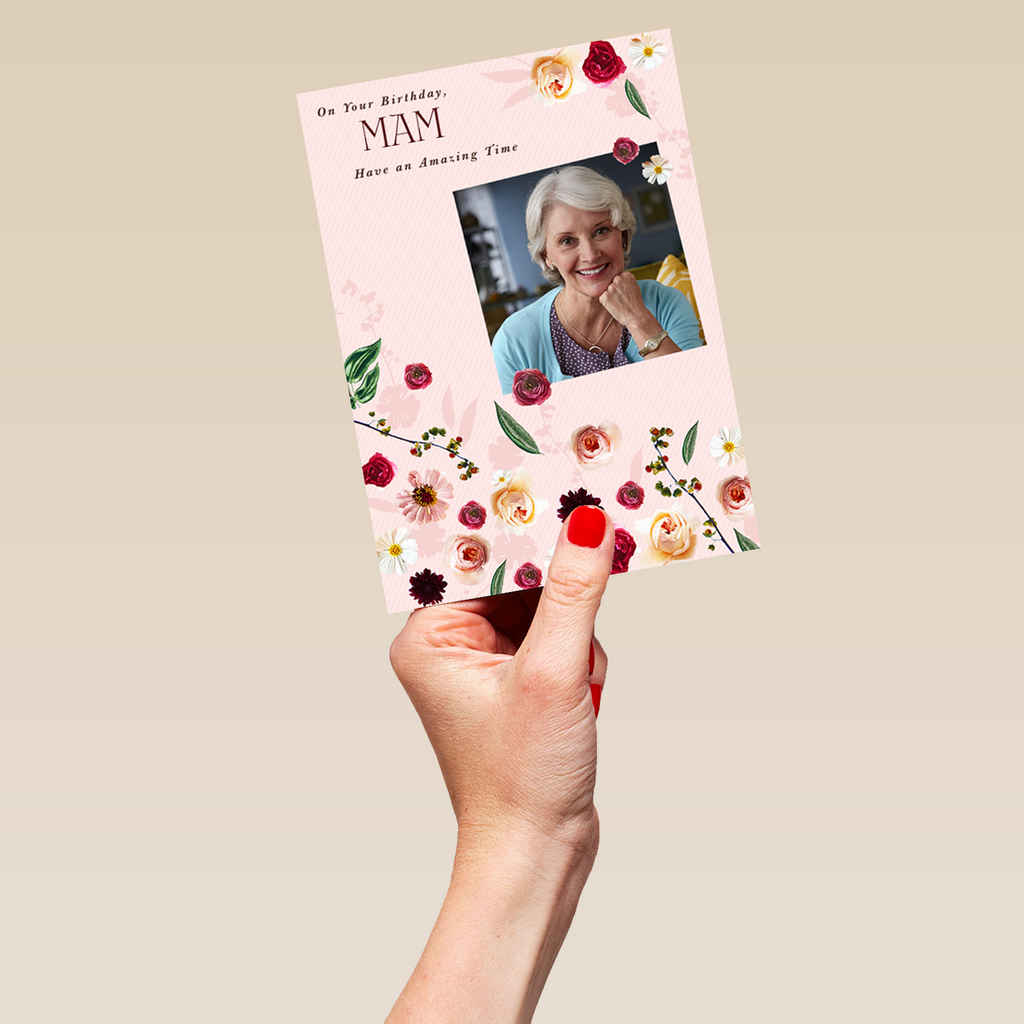 Show them you care with a personalised for mam classic text floral photo card from Hallmark. Our birthday cards are printed on premium quality, FSC®-certified card & delivered nationwide. This card is available as standard 12cm by 16.7cm and large 15.5cm by 21.6cm.