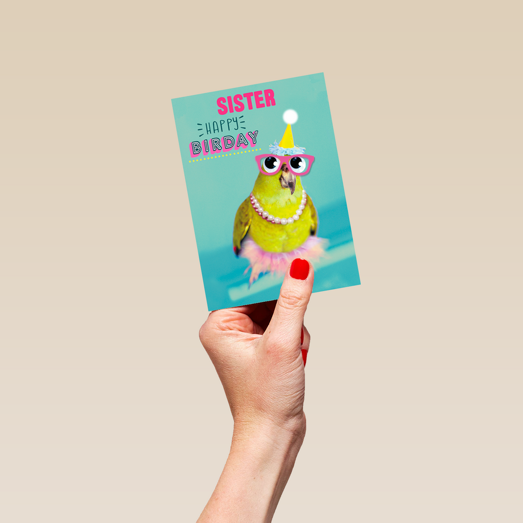 Show them you care with a personalised bird sister birthday card from Hallmark. Our greetings cards are printed on premium quality, FSC®-certified card & delivered nationwide. This card is available as standard 12cm by 16.7cm and large 15.5cm by 21.6cm.