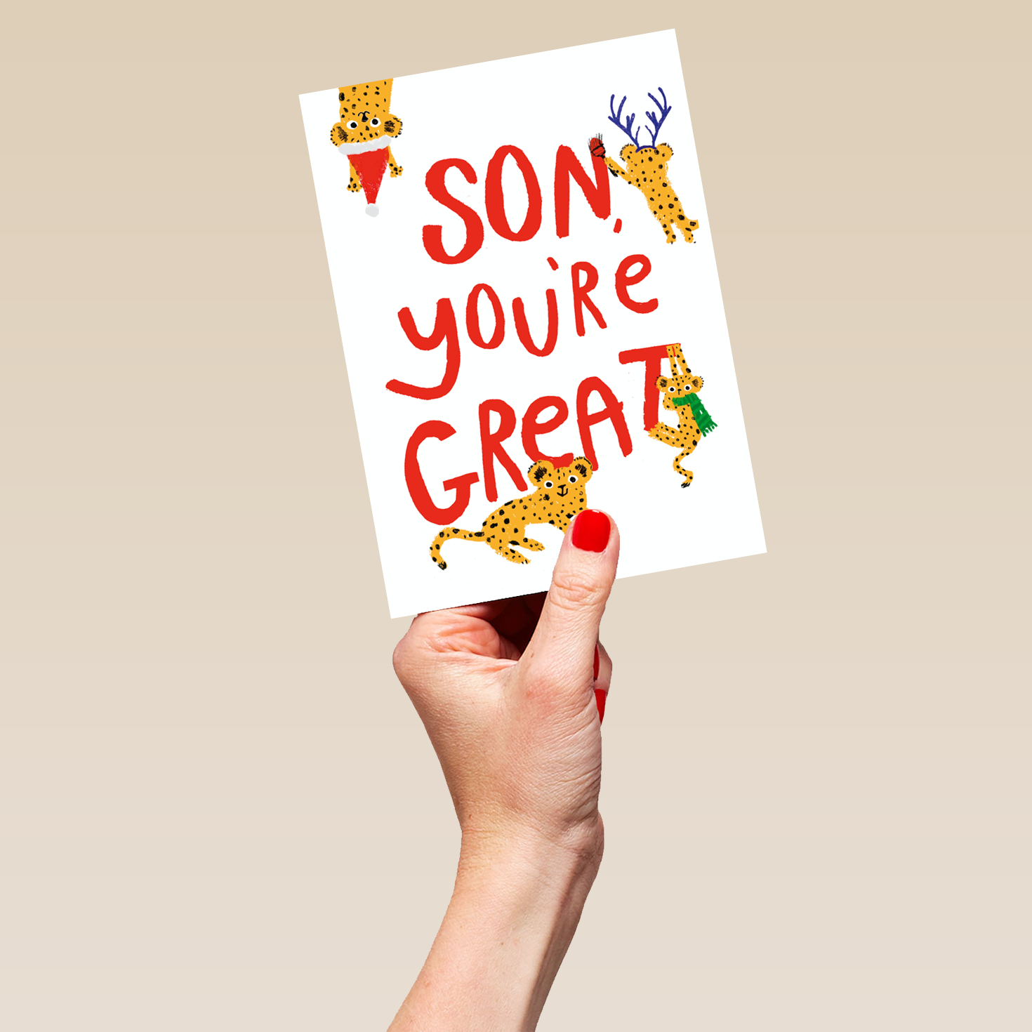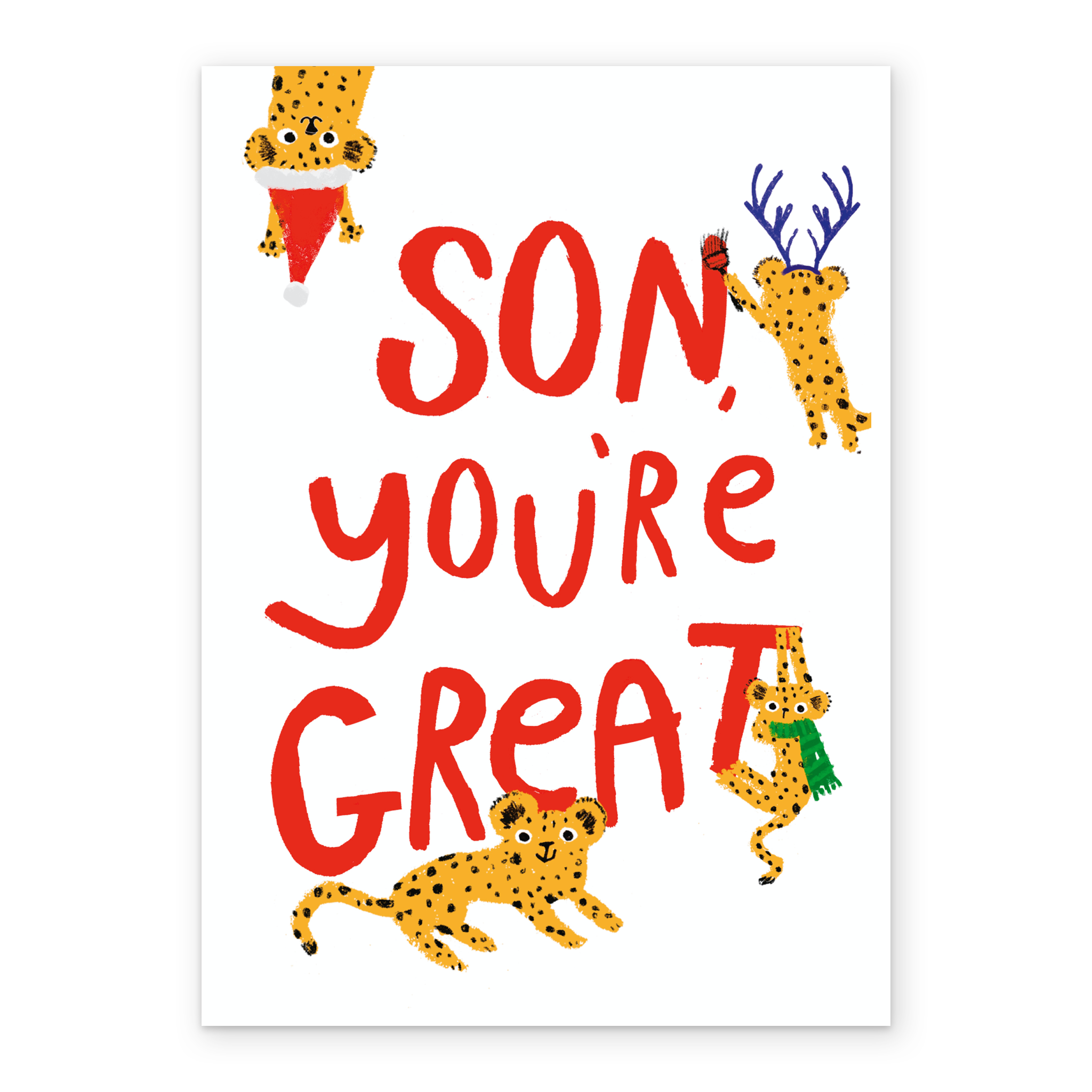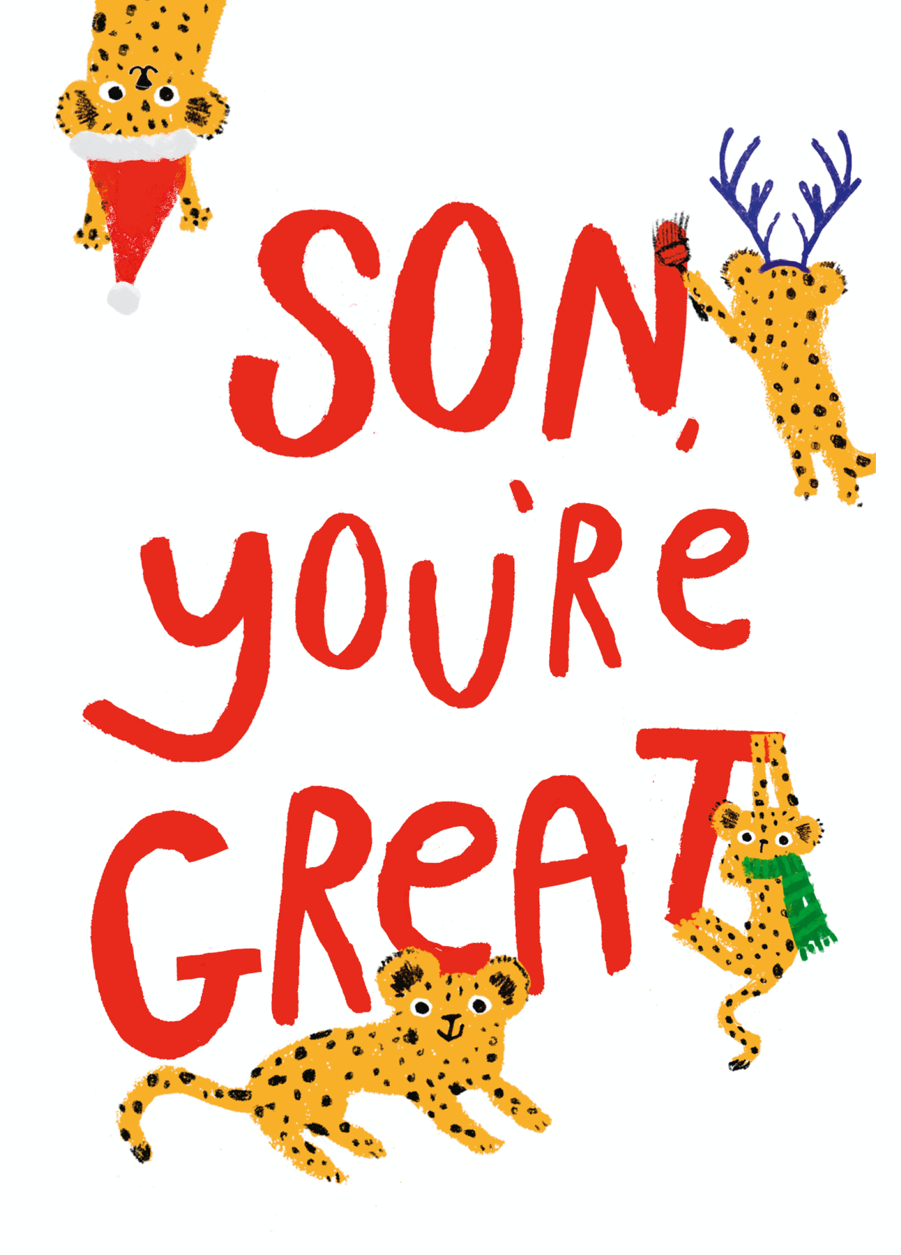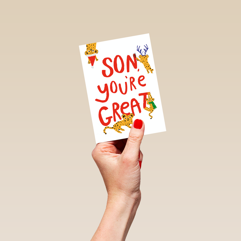 Show them you care with a personalised son cute festive leopards card from Hallmark. Our Christmas cards are printed on premium quality, FSC®-certified card & delivered nationwide. This card is available as standard 12cm by 16.7cm and large 15.5cm by 21.6cm.