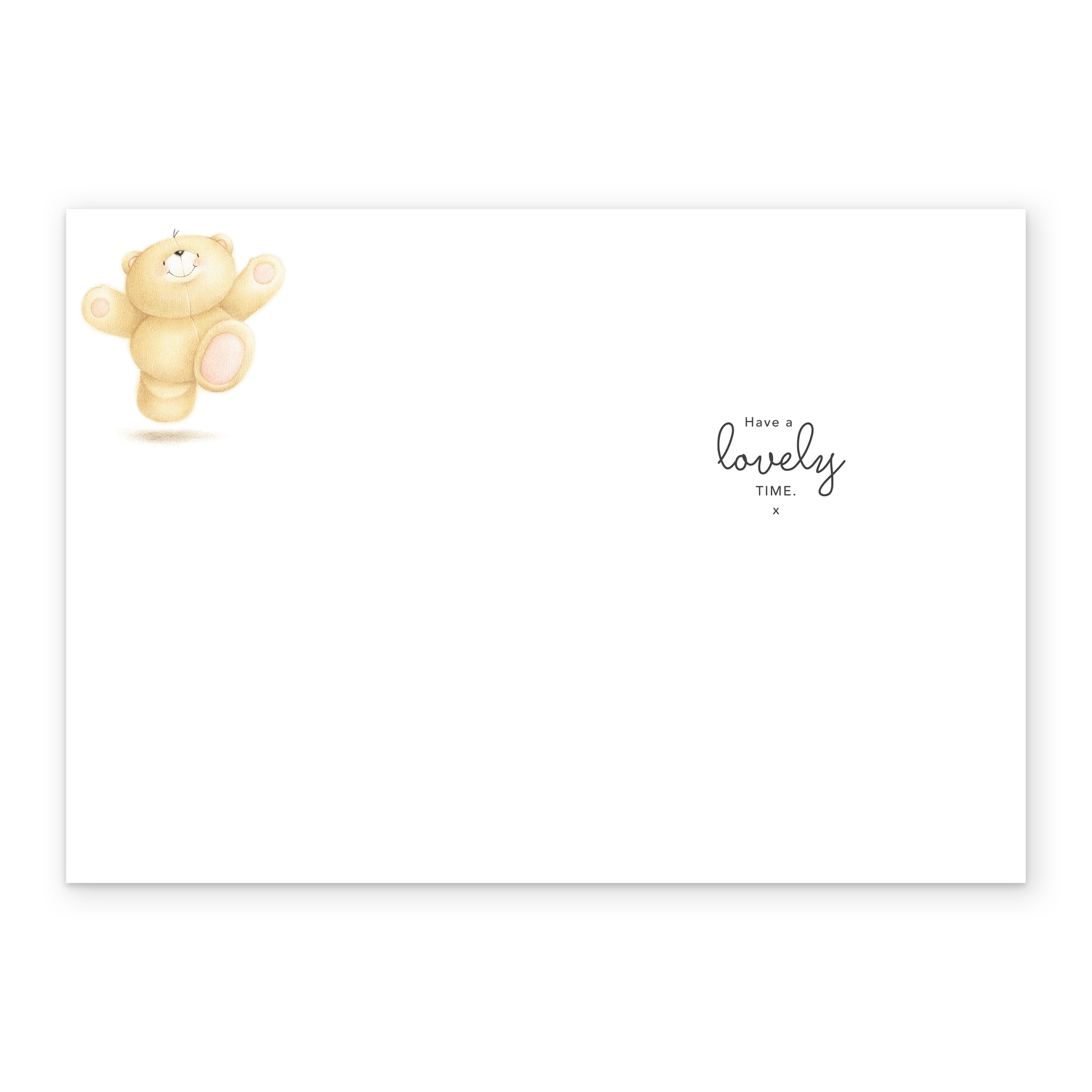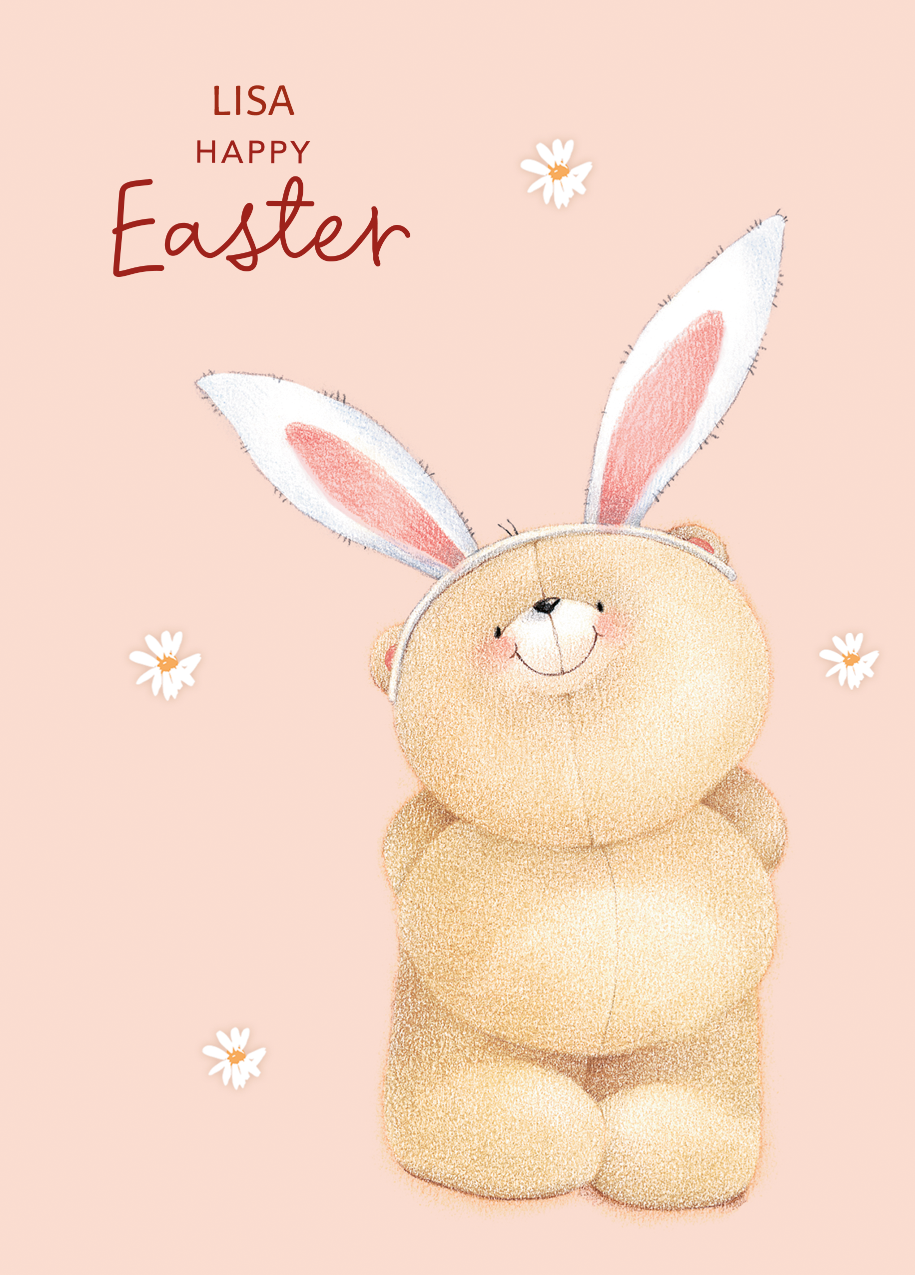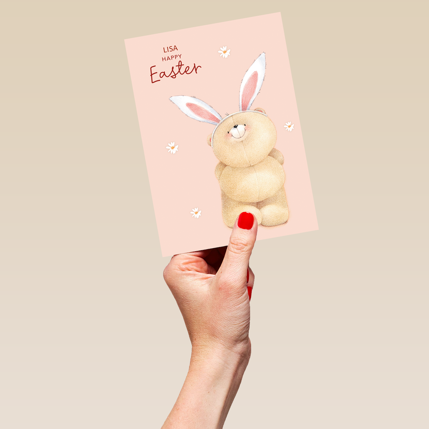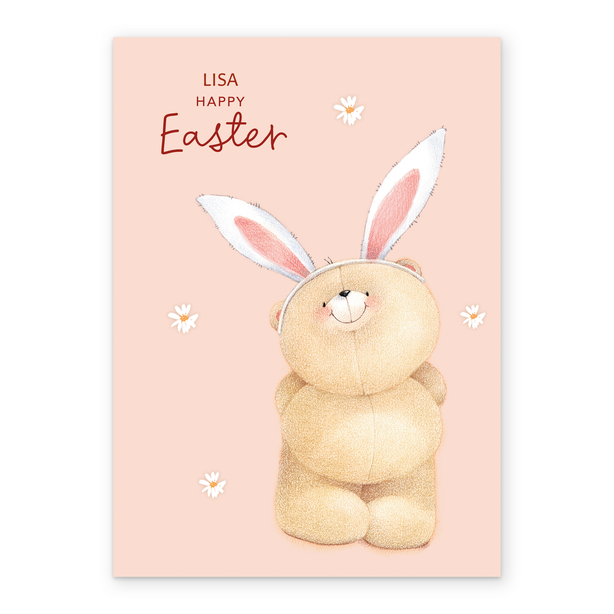Printed on premium-quality board, this card features a cute Forever Friends bear wearing a bunny ears headband on a light pink background, with the message 'Happy Easter', space to personalise a name, and comes complete with a co-ordinating white envelope.