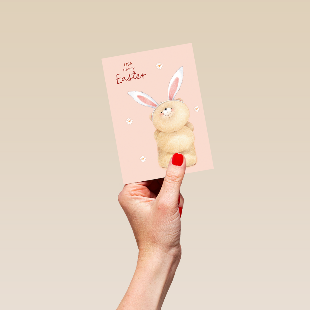 Show them you care with a personalised Forever Friends Bunny Ears Bear Easter Card from Hallmark.