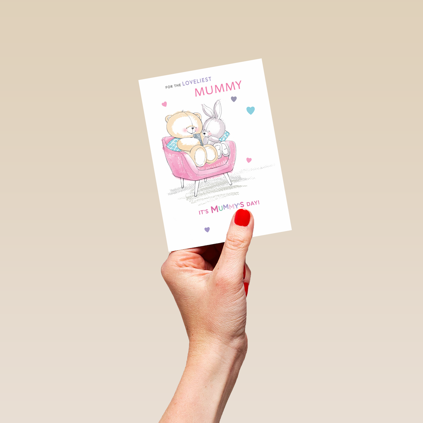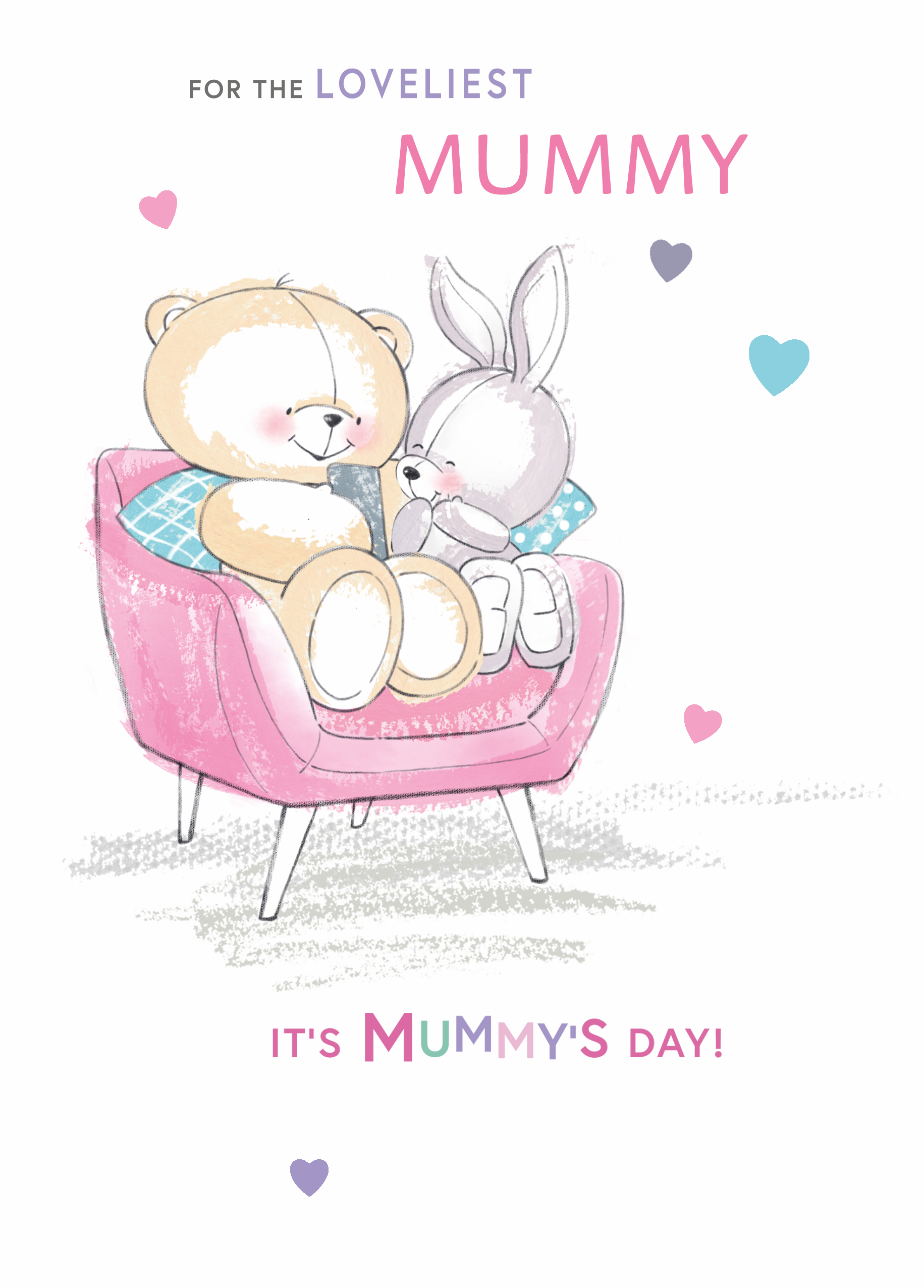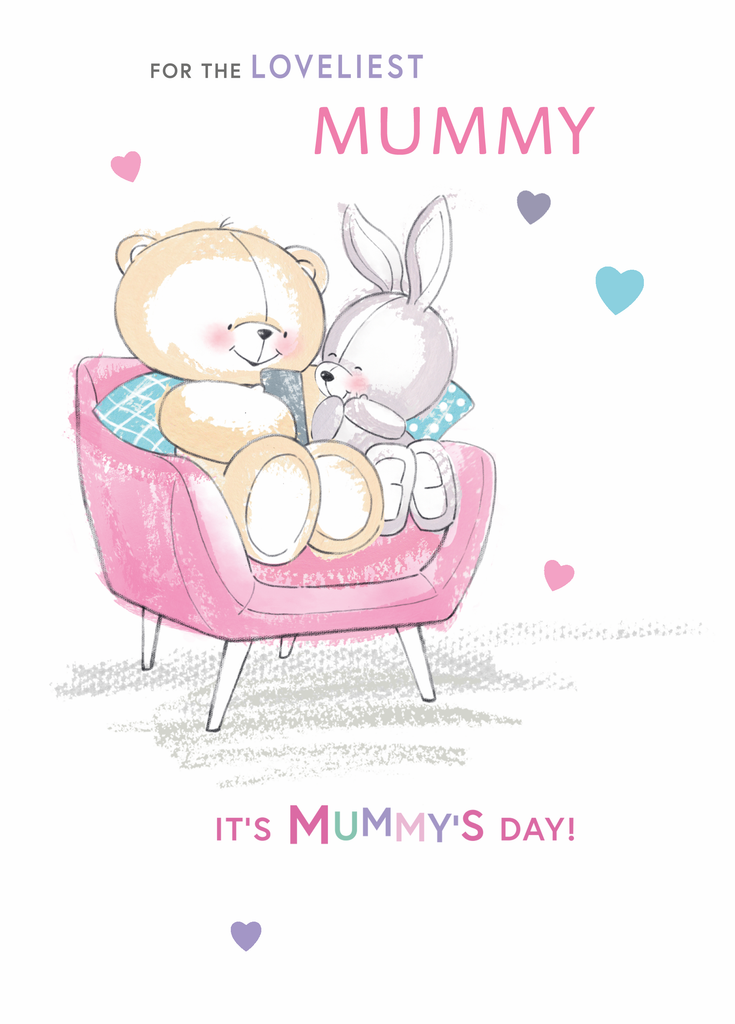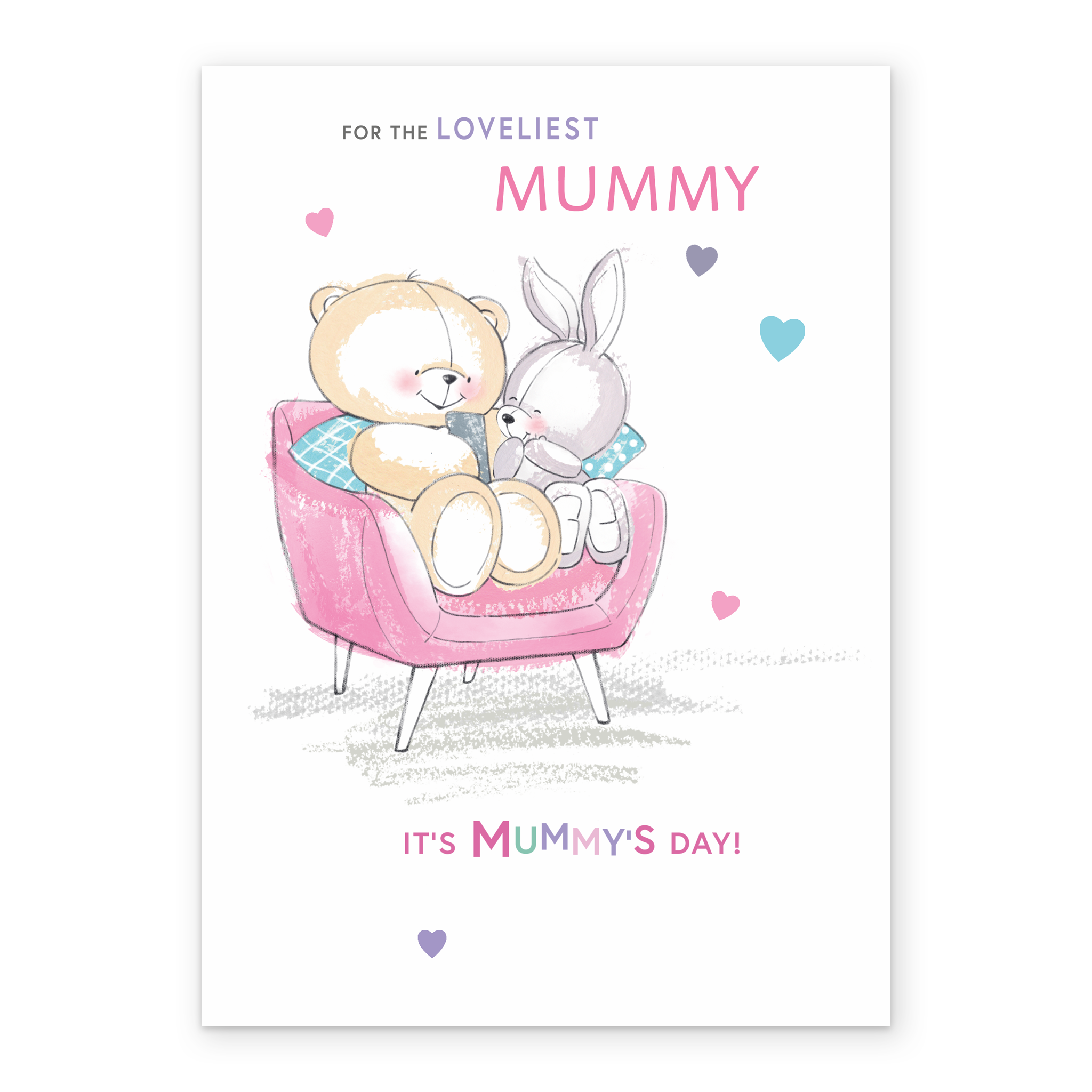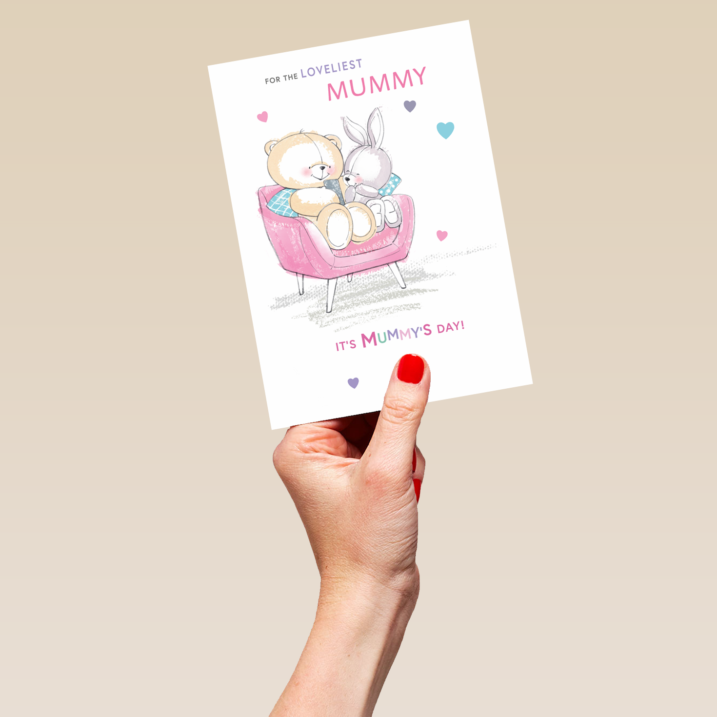 Printed on premium-quality board, this card features a cute Forever Friends bear and bunny sitting together in an armchair reliving memories using their phone, on a colourful-heart adorned white background, with the message 'For the loveliest Mummy. Its Mummy's Day!', space to personalise a name, and comes complete with a co-ordinating white envelope.
