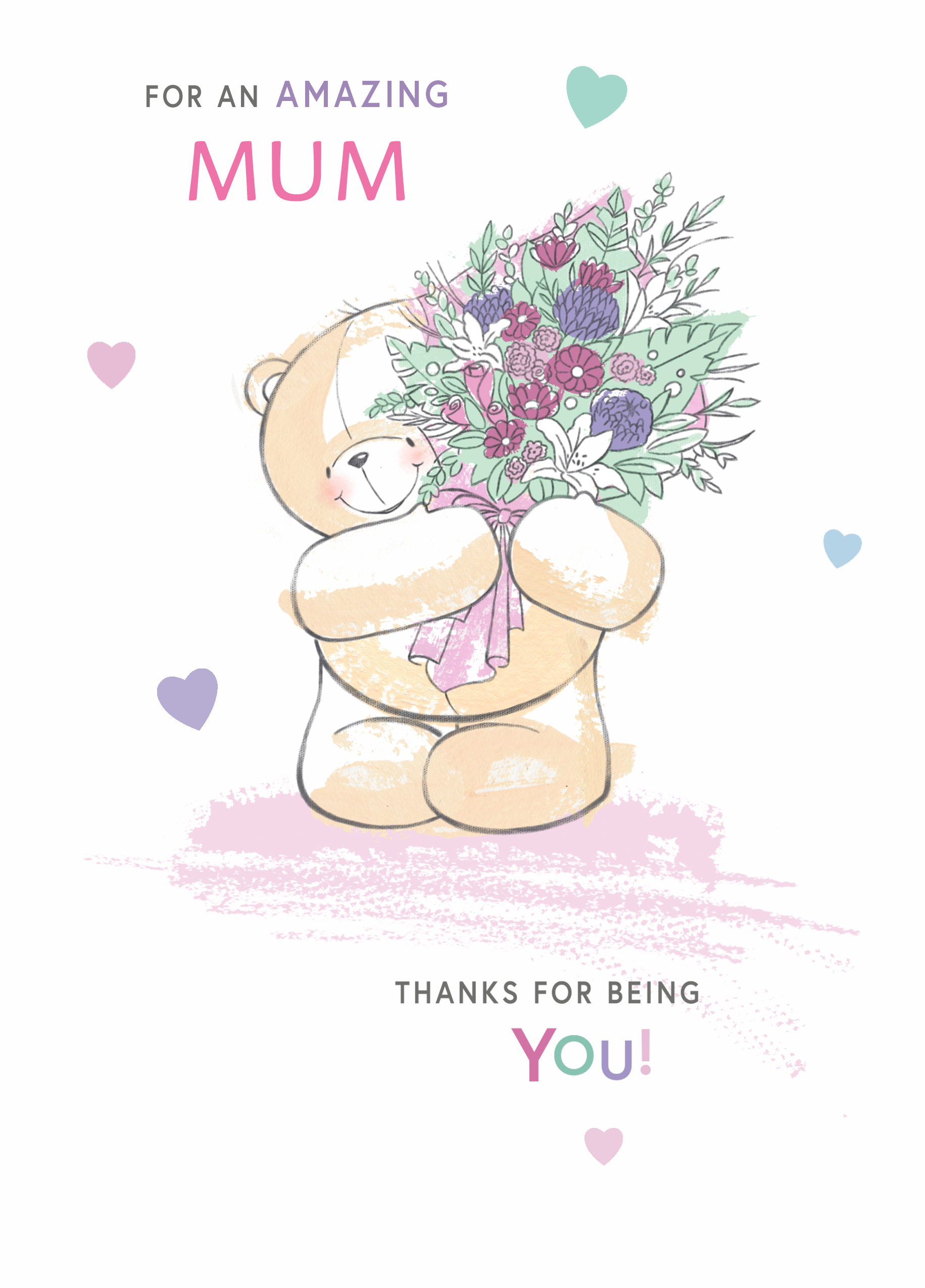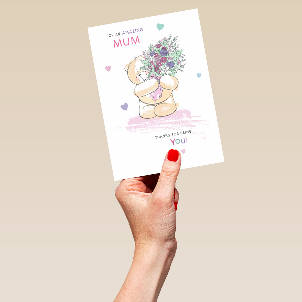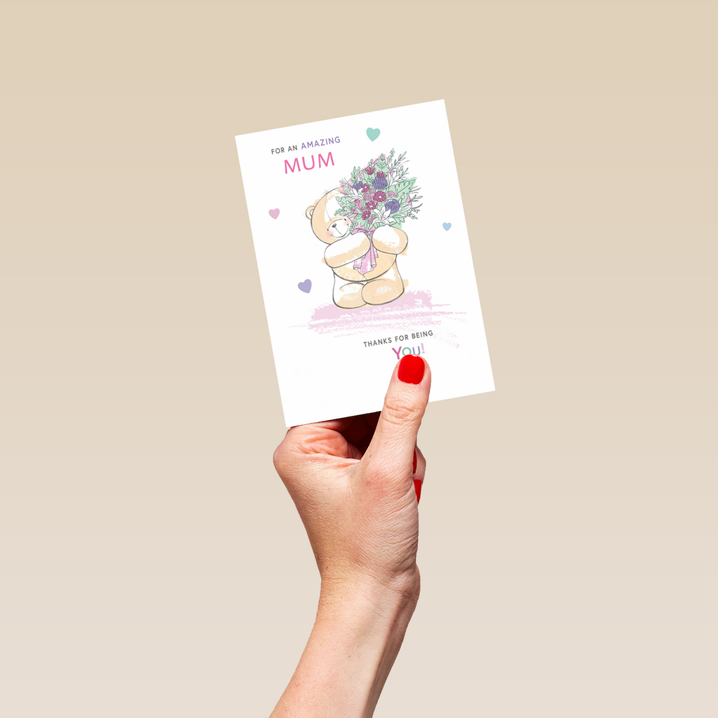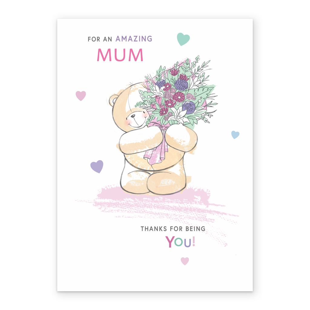 Printed on premium-quality board, this card features a cute Forever Friends bear, holding flowers and surrounded by hearts, on a white background, with the message 'For an amazing mum thanks for being you!', space to personalise a name, and comes complete with a co-ordinating white envelope.