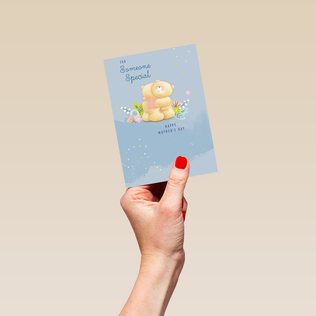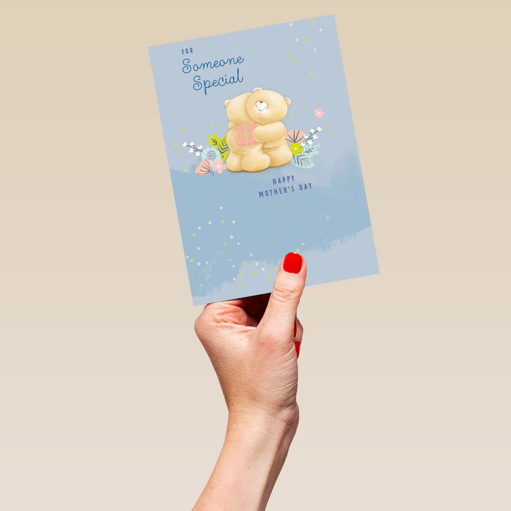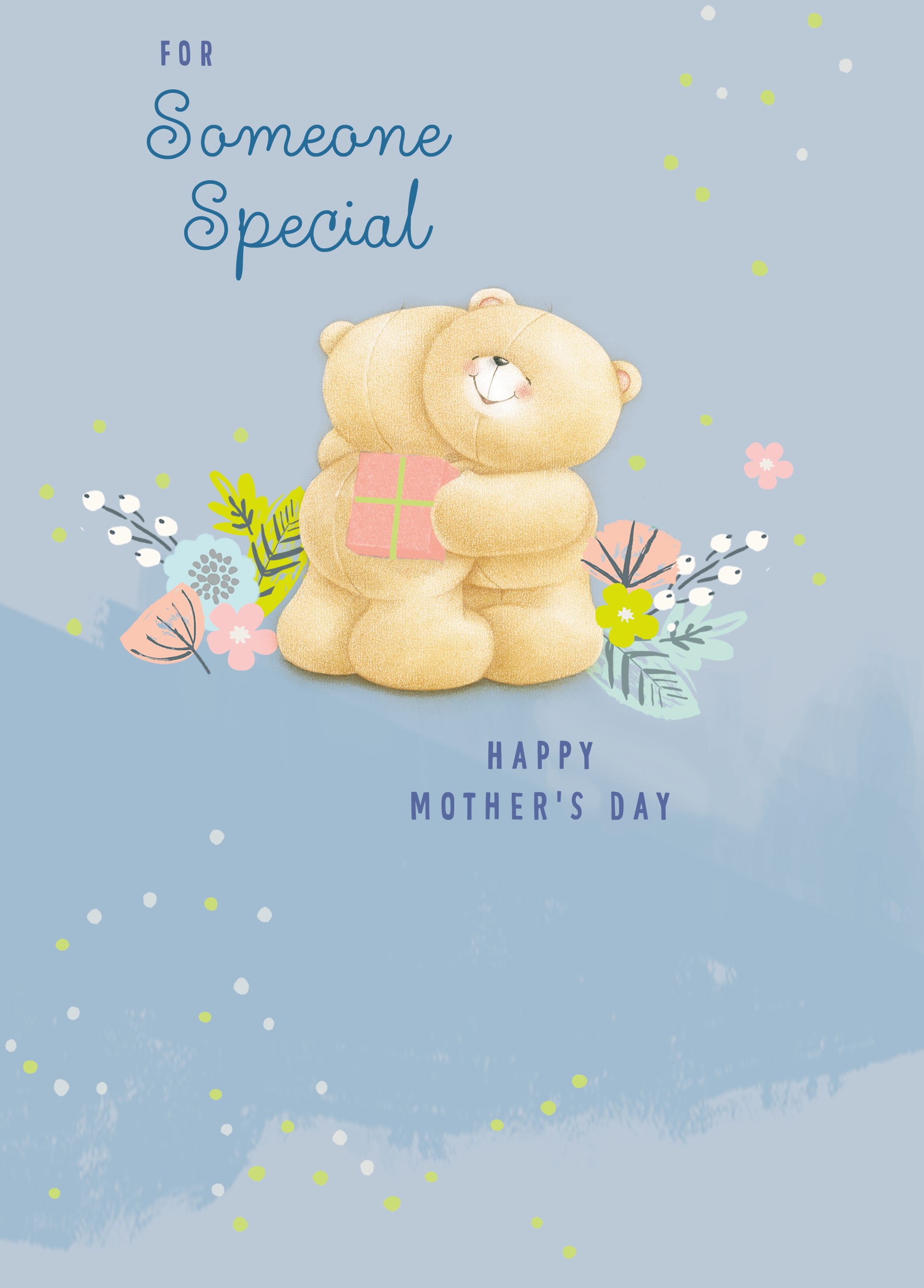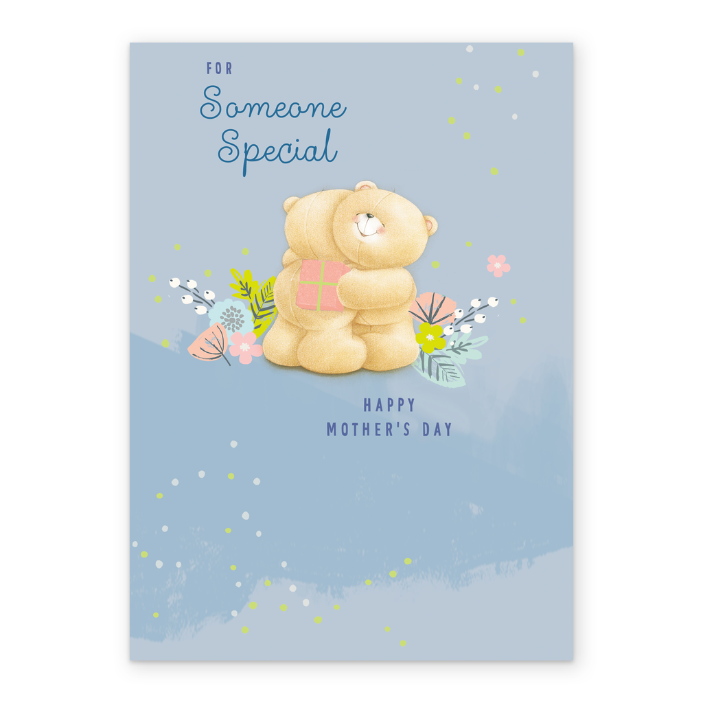 Printed on premium-quality board, this card features 2 cute Forever Friends bears, hugging after receiving a gift and colourful flowers, on a light blue background, with the message 'For someone special Happy Mother's Day', space to personalise a name, and comes complete with a co-ordinating white envelope.
