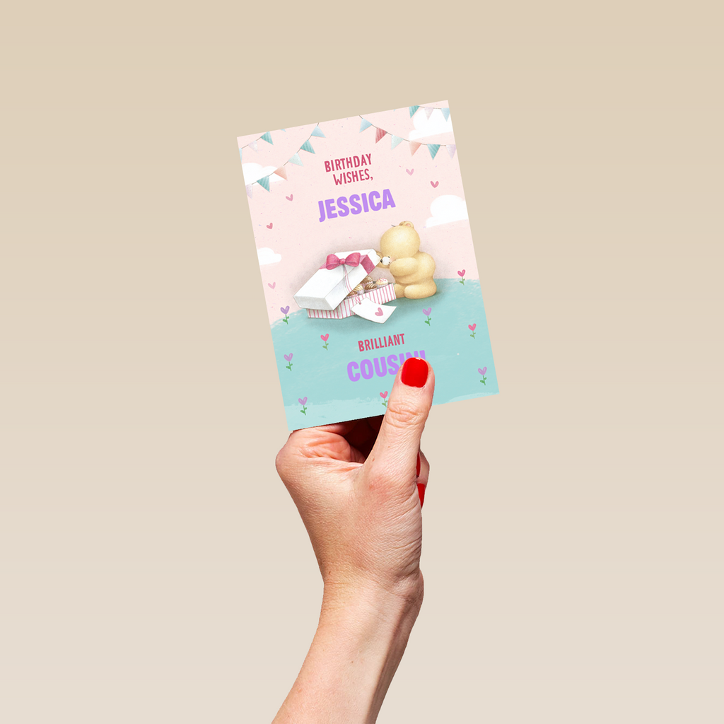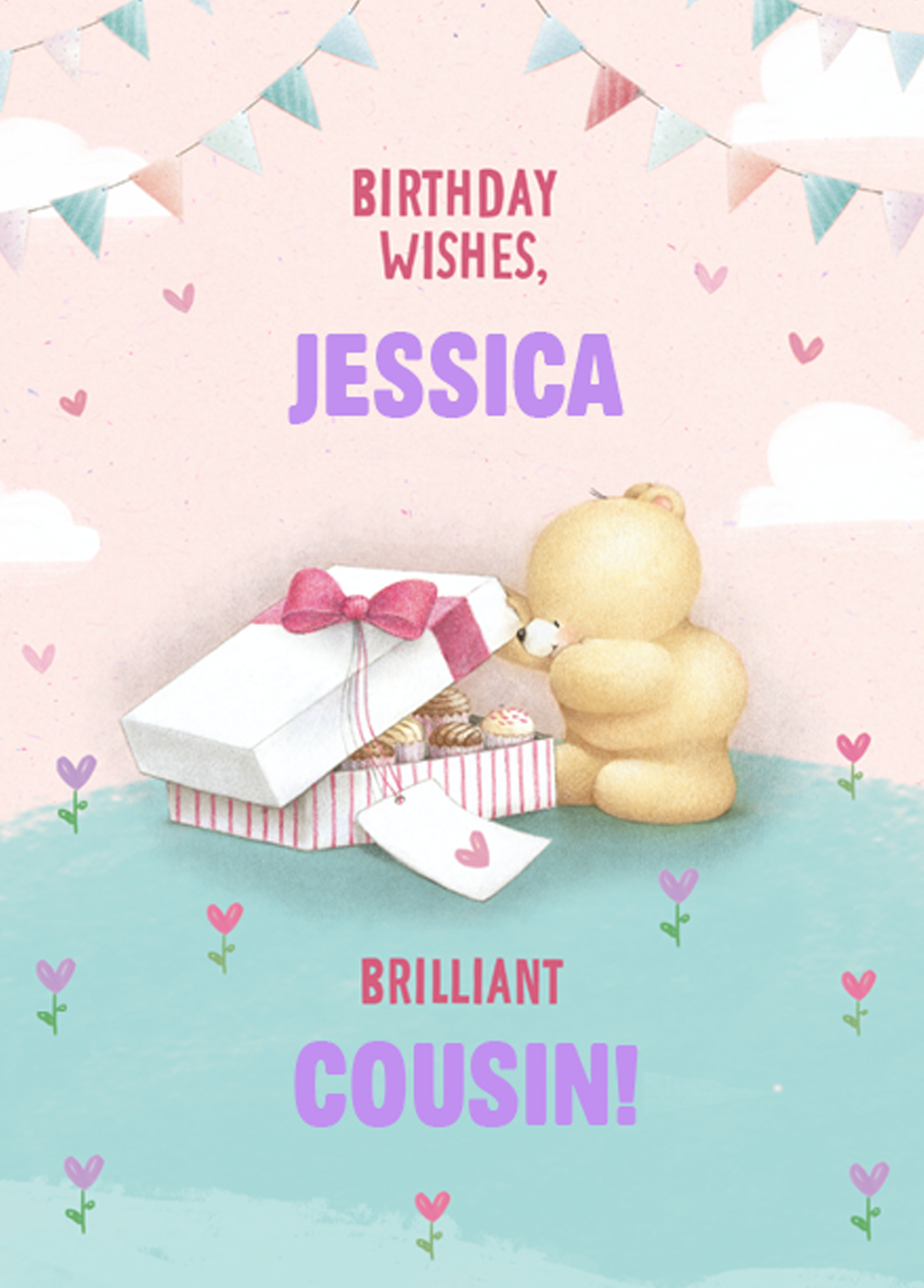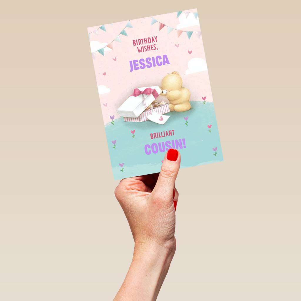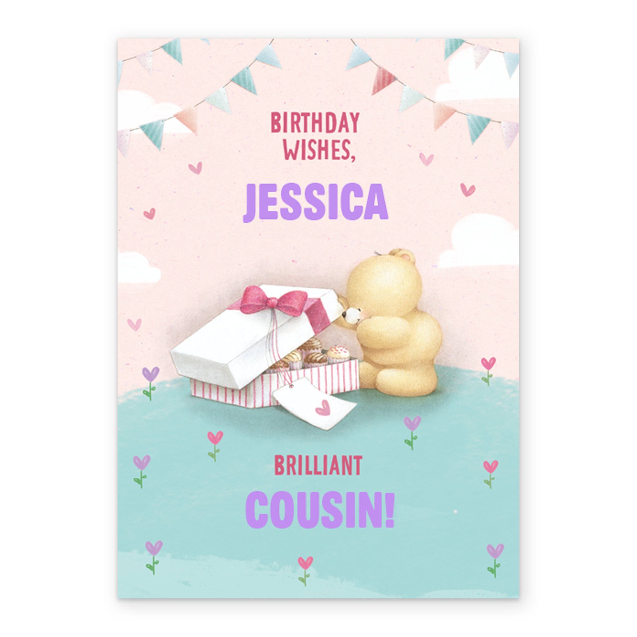 Show them you care with a personalised Forever Friends cupcakes card from Hallmark. Our birthday cards are printed on premium quality, FSC®-certified card & delivered nationwide. This card is available as standard 12cm by 16.7cm and large 15.5cm by 21.6cm.