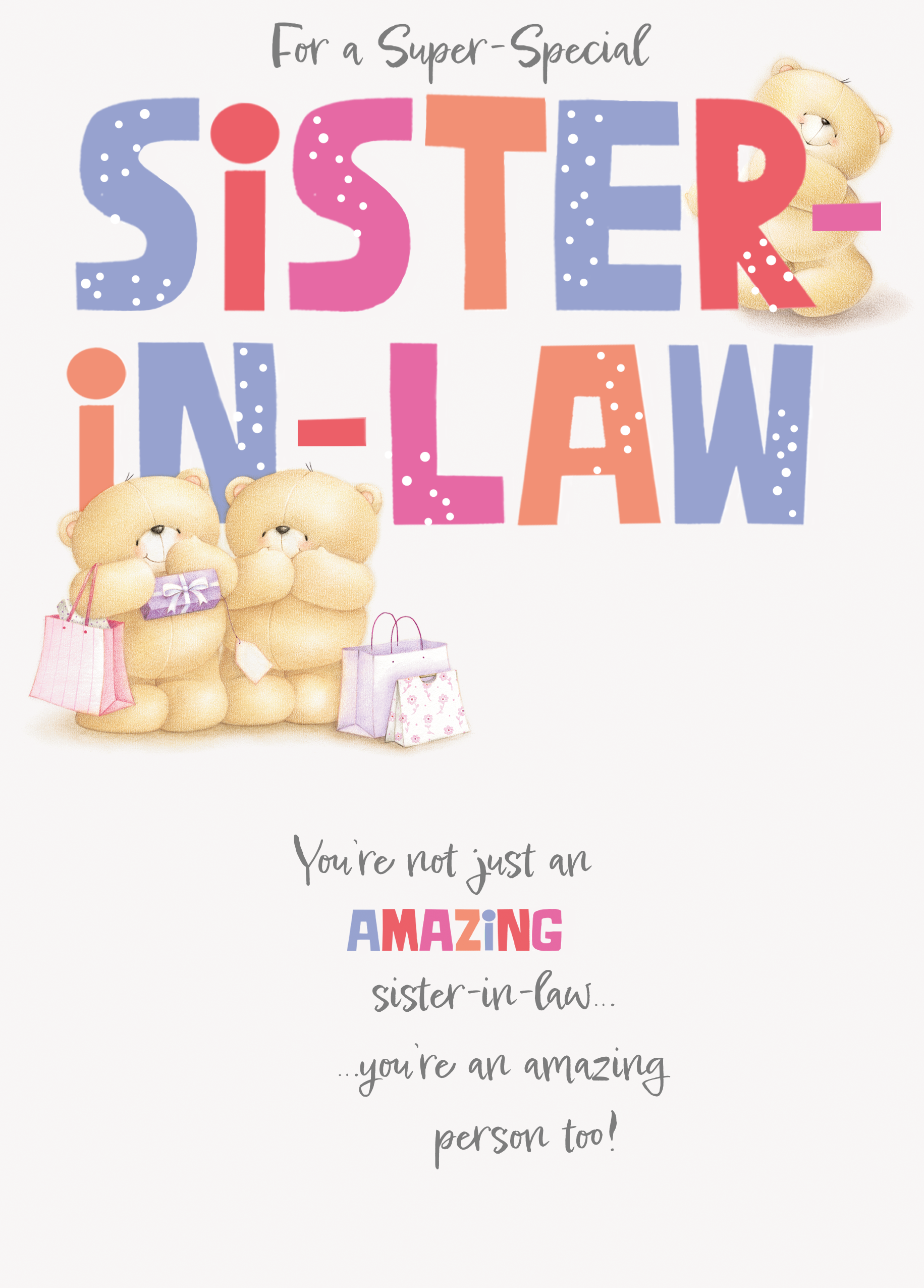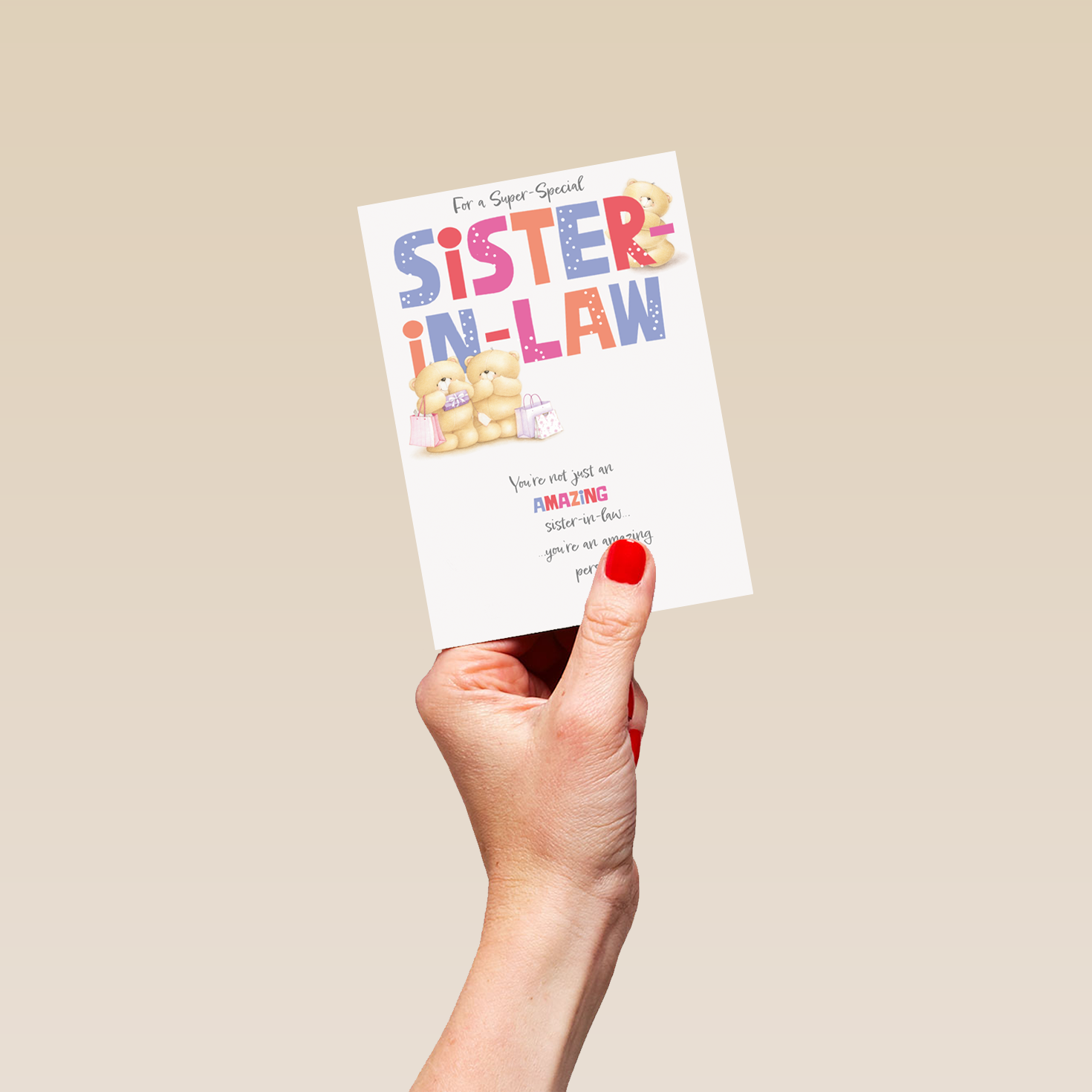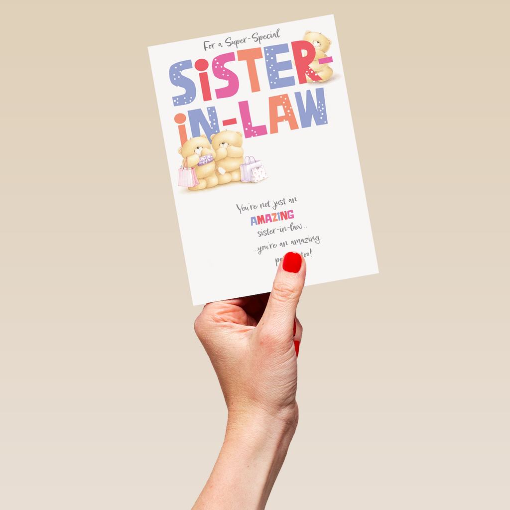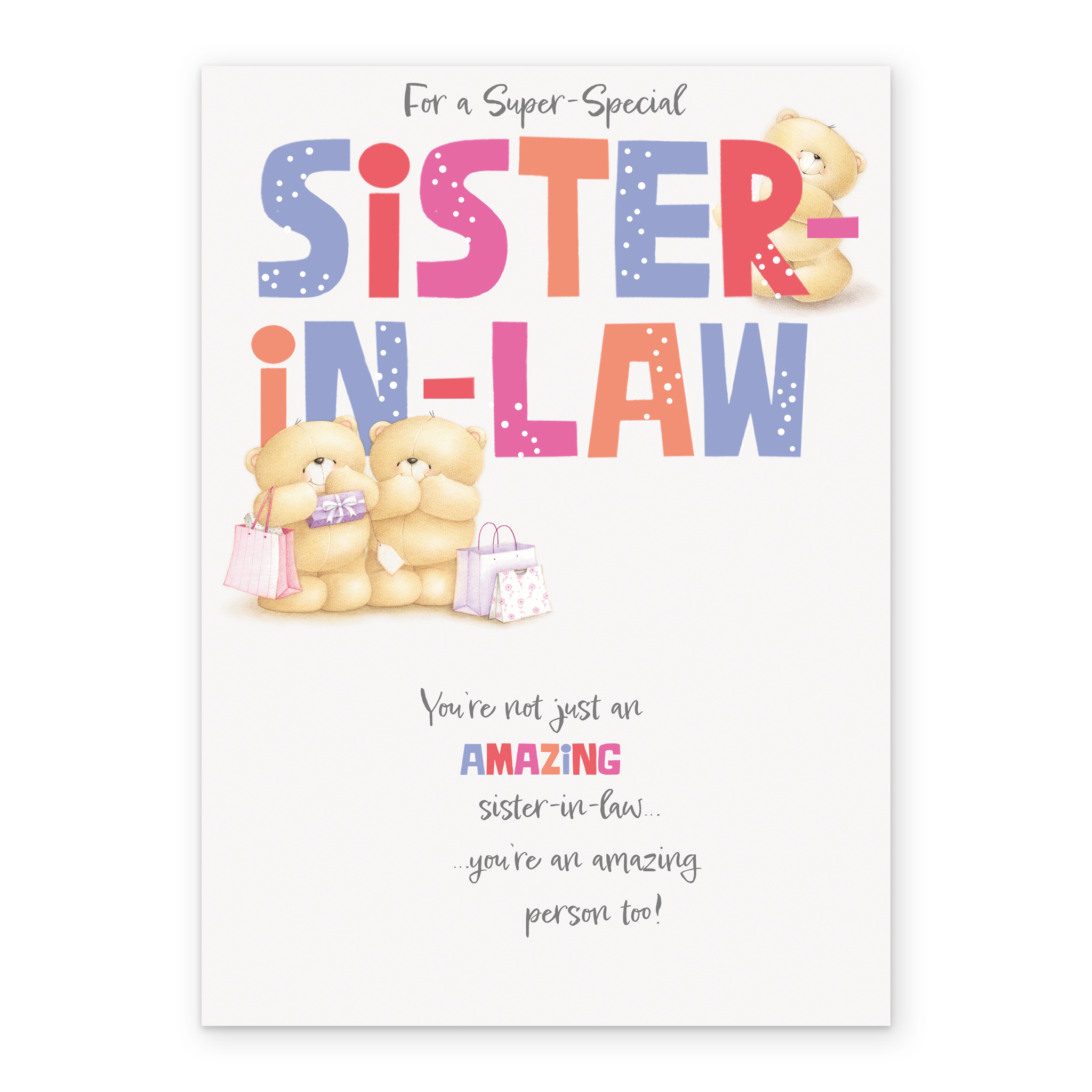 Printed on premium-quality board, this card features Hallmark's Forever Friends bears with gifts, with the message 'For a super-special sister-in-law. You're not just an amazing sister-in-law, you're an amazing person too!', and comes complete with a co-ordinating white envelope.