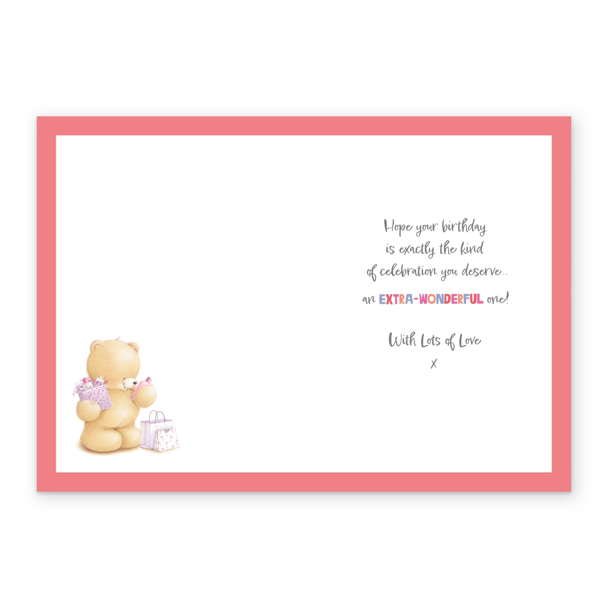 Message inside reads: Hope your birthday is exactly the kind of celebration you deserve… an extra-wonderful one! With lots of love x